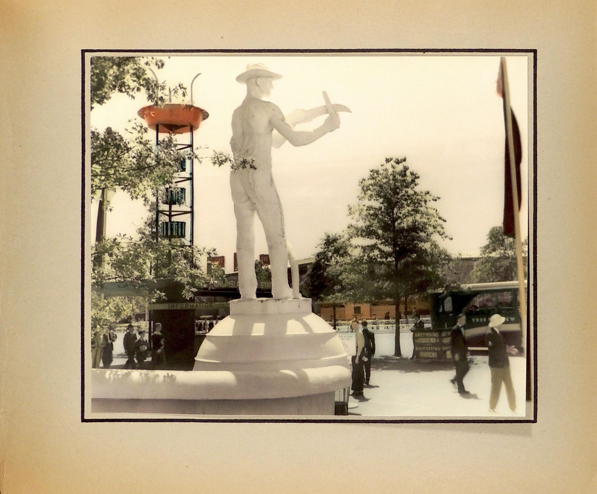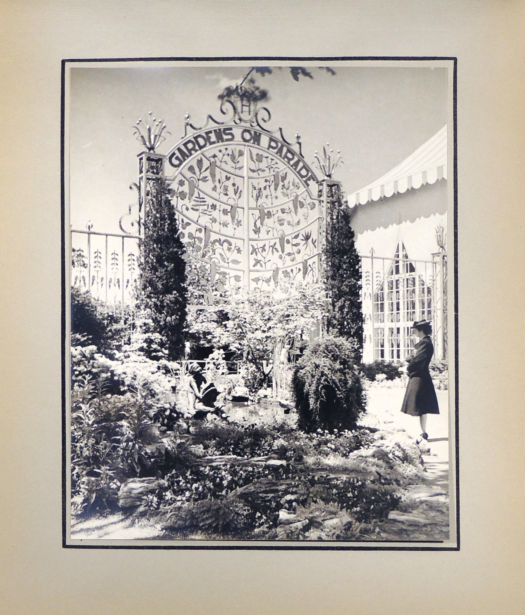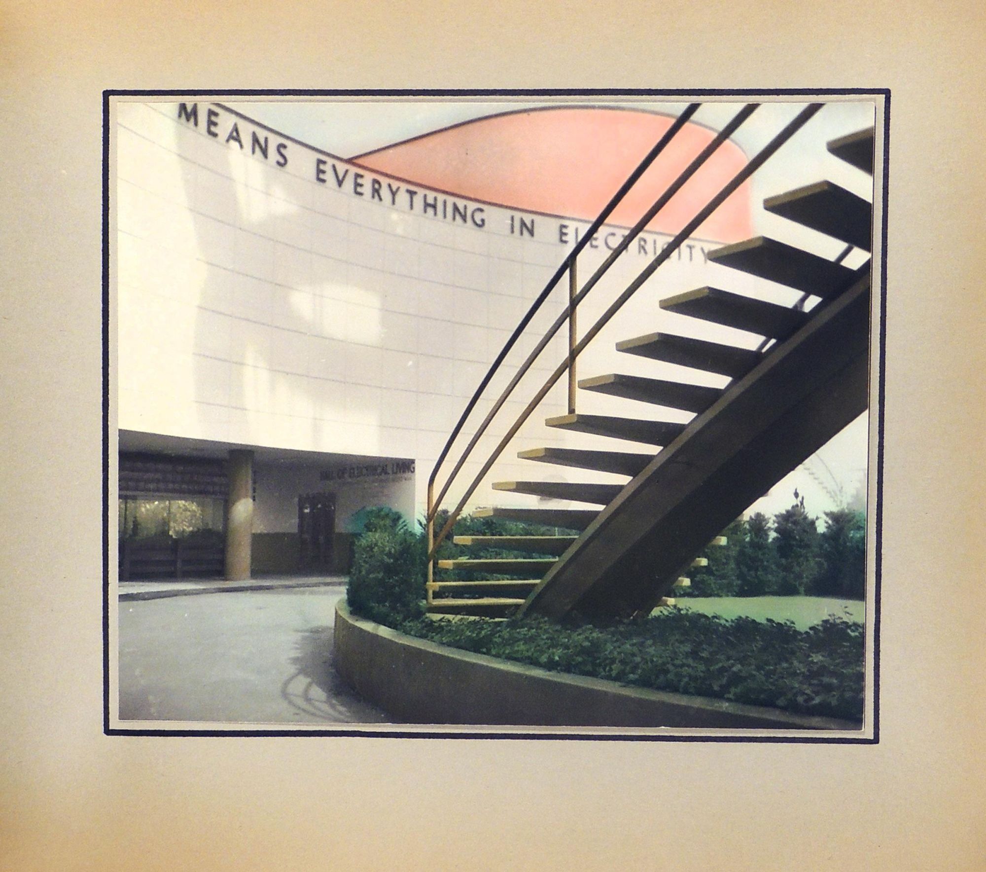 n.p.: [Titus Geesey], 1940. Fine. This is a remarkable and unique item - a scrapbook of photos personally taken by Titus C. Geesey in 1940 at the New York World's Fair that took place at Flushing Meadows in Queens, New York in 1939-1940. He mounted his photographs in a large simulated leather scrapbook, with the title "Souvenirs" and his name in gilt on the front cover. Geesey was a renowned collector of American Folk-Art whose collection was left to the Philadelphia Museum of Art. This deluxe custom album contains 64 quite exceptional and undoubtedly unique photos of pavilions, sculptures, and more, with special attention shown to the Futuristic dimensions of the Fair. Ten of the 64 photos are delicately hand colored - there is also a black and white copy of each of these hand colored photos. One of the photographs is a self portrait of Geesey that he took at the fair of his reflection in a mirrored wall. There are also eight black and white photographs taken at the famed Cloisters in upper Manhattan. The photos are beautifully shot and there are handwritten descriptions along with the date taken on the back of the gray paper frame. The tipped in photos measure 7.5x 9.25 inches and are on textured gray paper within a thin black outline. The pages are 11.5 x 14.25 inches.