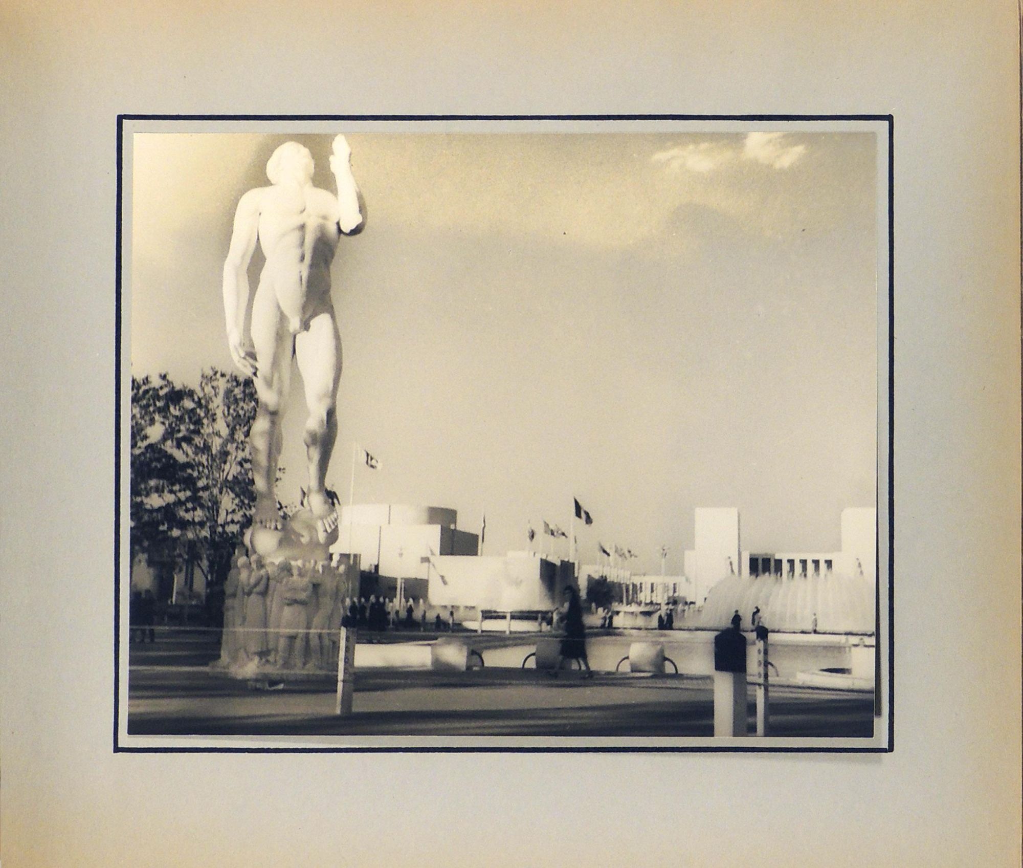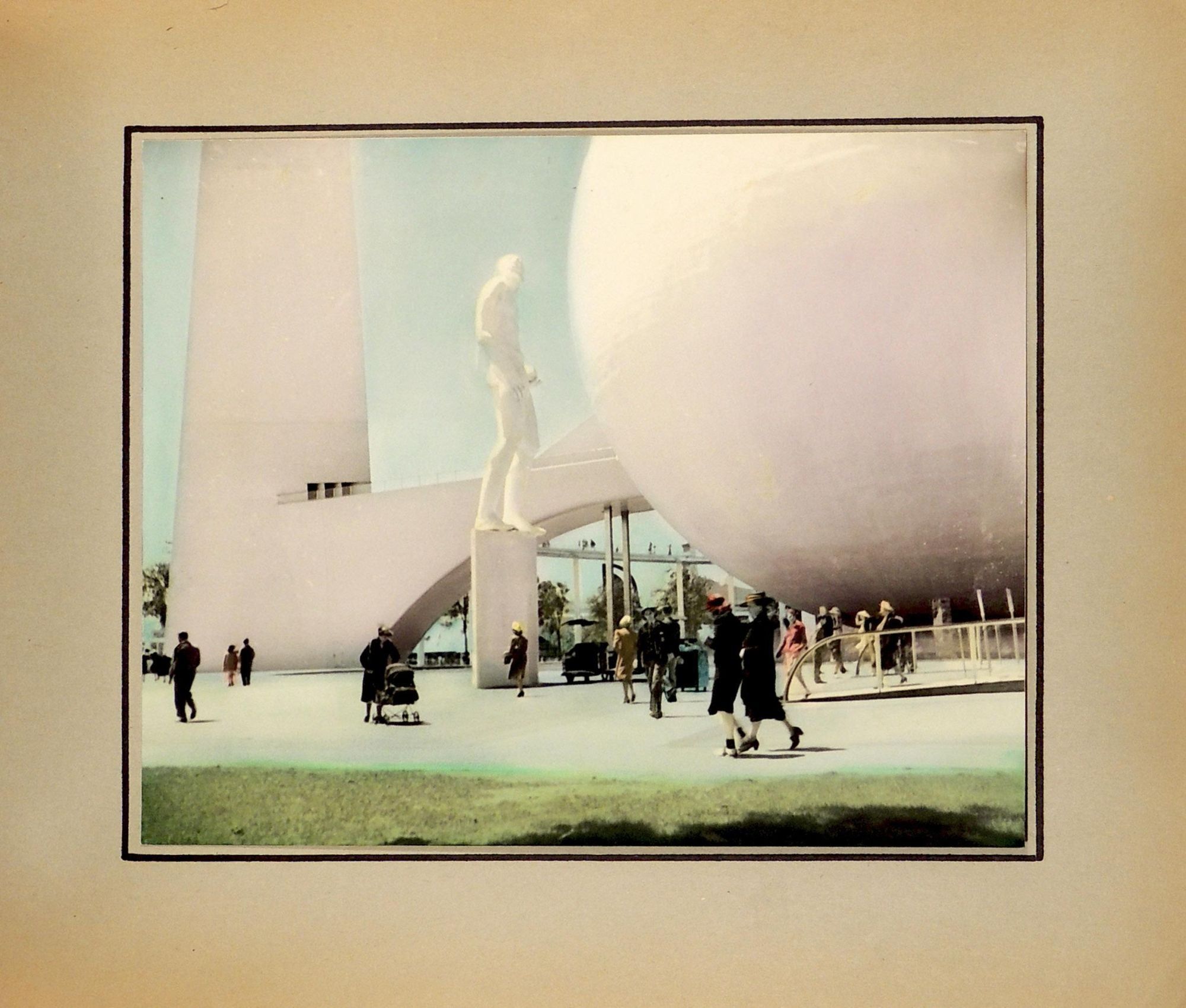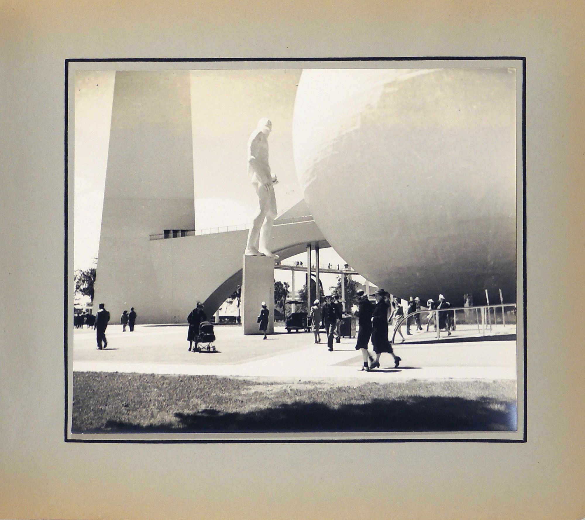 An outstanding photographic record of this consequential world event. With this album Titus Geesey created a remarkable record of one of the most important world's fairs perhaps ever held. The 1939-1940 New York World's Fair was particularly noteworthy. The New York World's Fair of 1939 and 1940, was held in Flushing Meadows in the Borough of Queens. The Fair commemorated the 150th anniversary of Washington's presidential inauguration in New York City and took "Building the World of Tomorrow" as its central theme. Participants included close to 60 nations, 33 states and U.S. territories, and over a thousand exhibitors, among them some of the largest corporations in the United States. After enduring 10 harrowing years of the Great Depression, visitors to the 1939–1940 New York World’s Fair found welcome relief in the fair’s optimistic presentation of the “World of Tomorrow.” Pavilions from America’s corporations and dozens of countries were spread across a 1,216-acre site, showcasing the latest industrial marvels and predictions for the future intermingled with cultural displays from around the world. Well known for its theme structures, the Trylon and Perisphere, the fair was an intriguing mixture of technology, science, architecture, showmanship, and politics. Proclaimed by many as the most memorable world’s fair ever held, it predicted wonderful times were ahead for the world even as the clouds of war were gathering. PHOTO/063025.