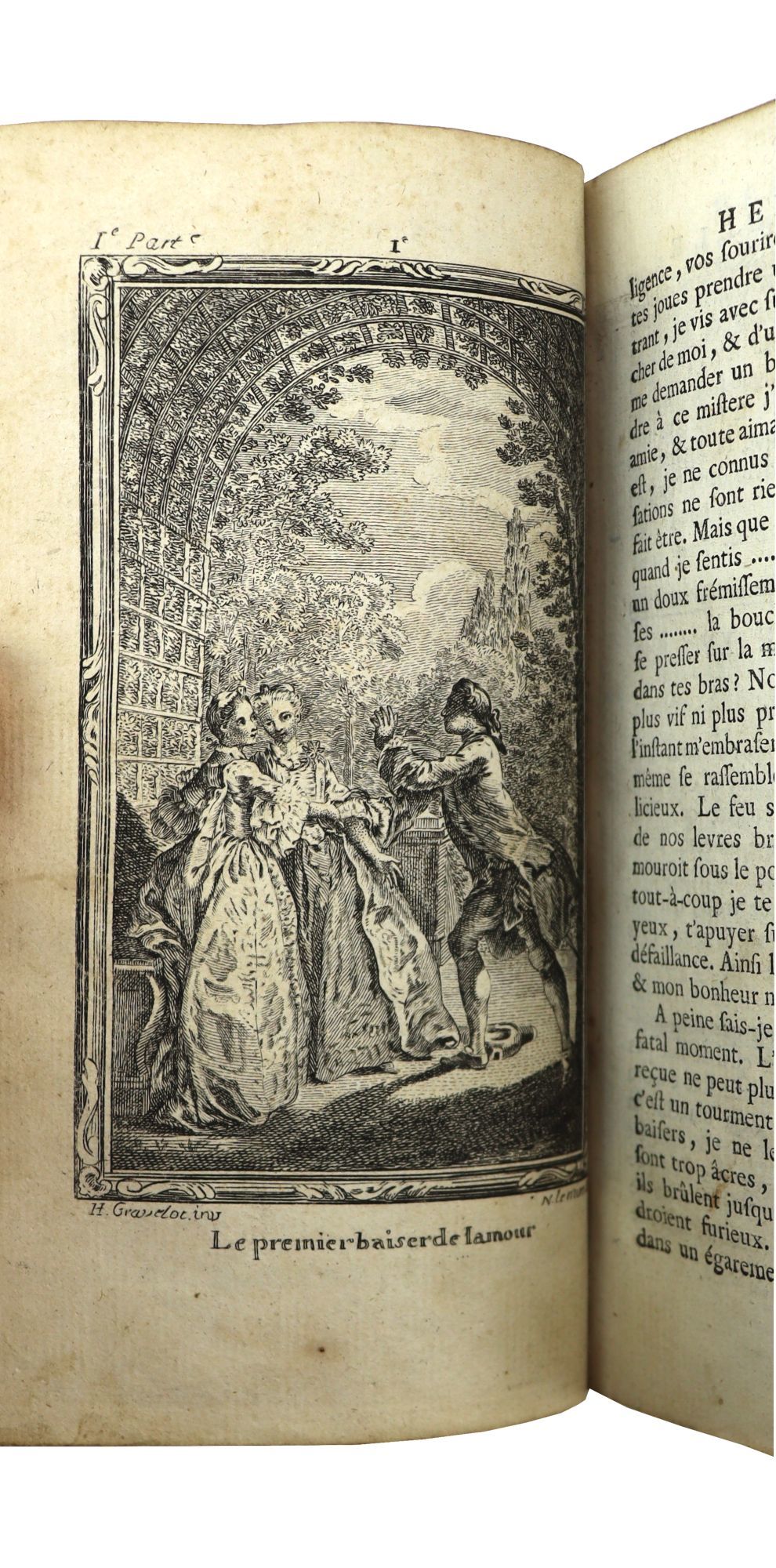 Amsterdam: Chez Marc-Michel Rey, 1762. Very Good. Amsterdam: Chez Marc-Michel Rey, 1762. Nouvelle Edition, augmentee, avec Figures. Two volumes in one; first and second parts only (of six published). Octavo. xliii; v; 245; iv; 184pp.; half title to part two only. Illustrations. Bound in contemporary calf; five raised bands; gilt decoration, and leather label to spine; marbled endpapers. Light wear to edges with brief exposure; loss to spine ends. A bit bowed; binding sound; contemporary scribblings to endpapers, else unmarked; still a Very Good copy of the first two parts of Rousseau's heralded epistolary novel, later titled "Julie, or the New Heloise.