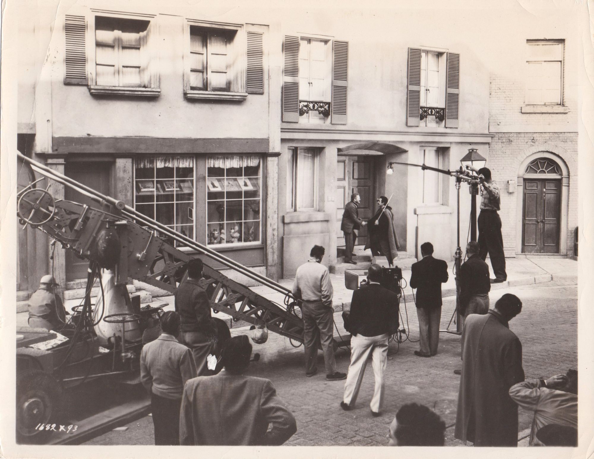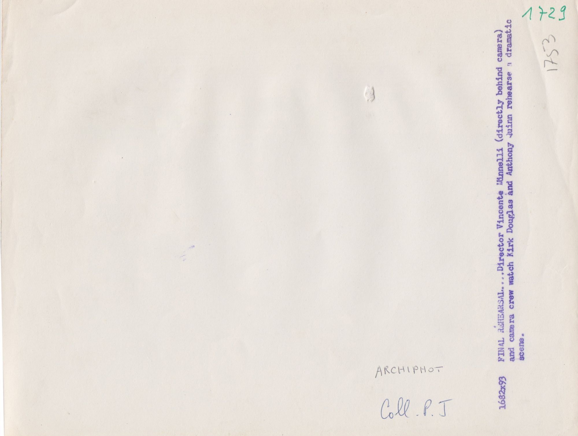 Beverly Hills, CA: Metro-Goldwyn-Mayer [MGM], 1956. Vintage reference photograph from the 1956 film, showing director Vincente Minnelli with a camera crew, capturing a scene with Kirk Douglas and Anthony Quinn. Mimeo snipe on the verso.
