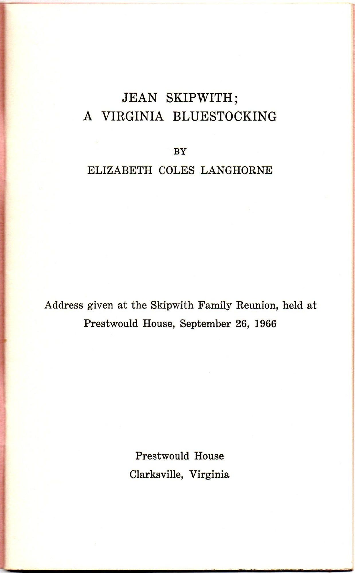 Clarksville: Prestwood House, 1967. First Edition. Soft Cover. Near Fine binding. Small 8vo; in publisher’s illustrated paper wrappers; 14 pages; a bit on toning to the spine, otherwise a fine copy.~~An address given at the Skipwith Family Reunion, held at Prestwood House, Spetember 26, 1966. Near Fine binding.