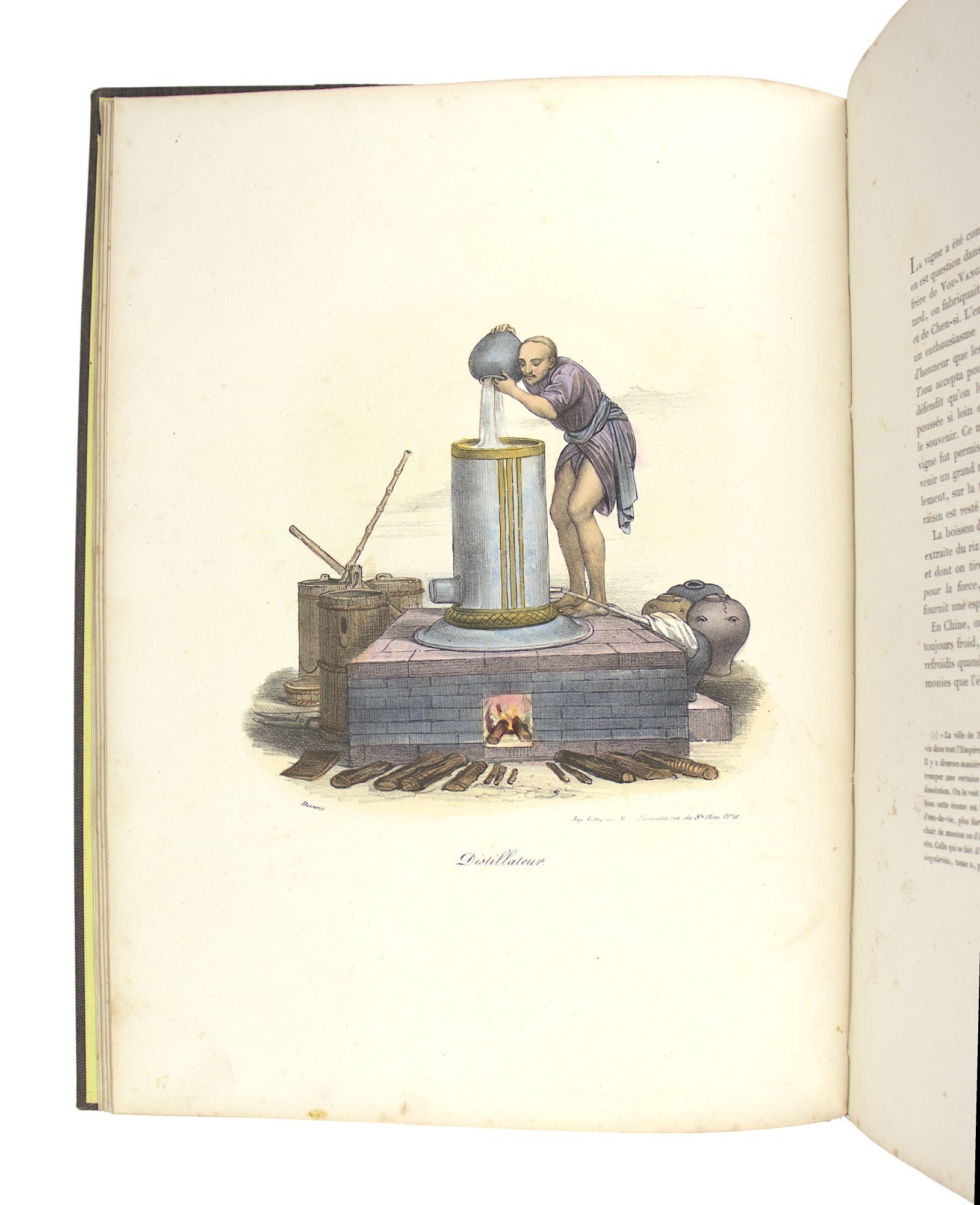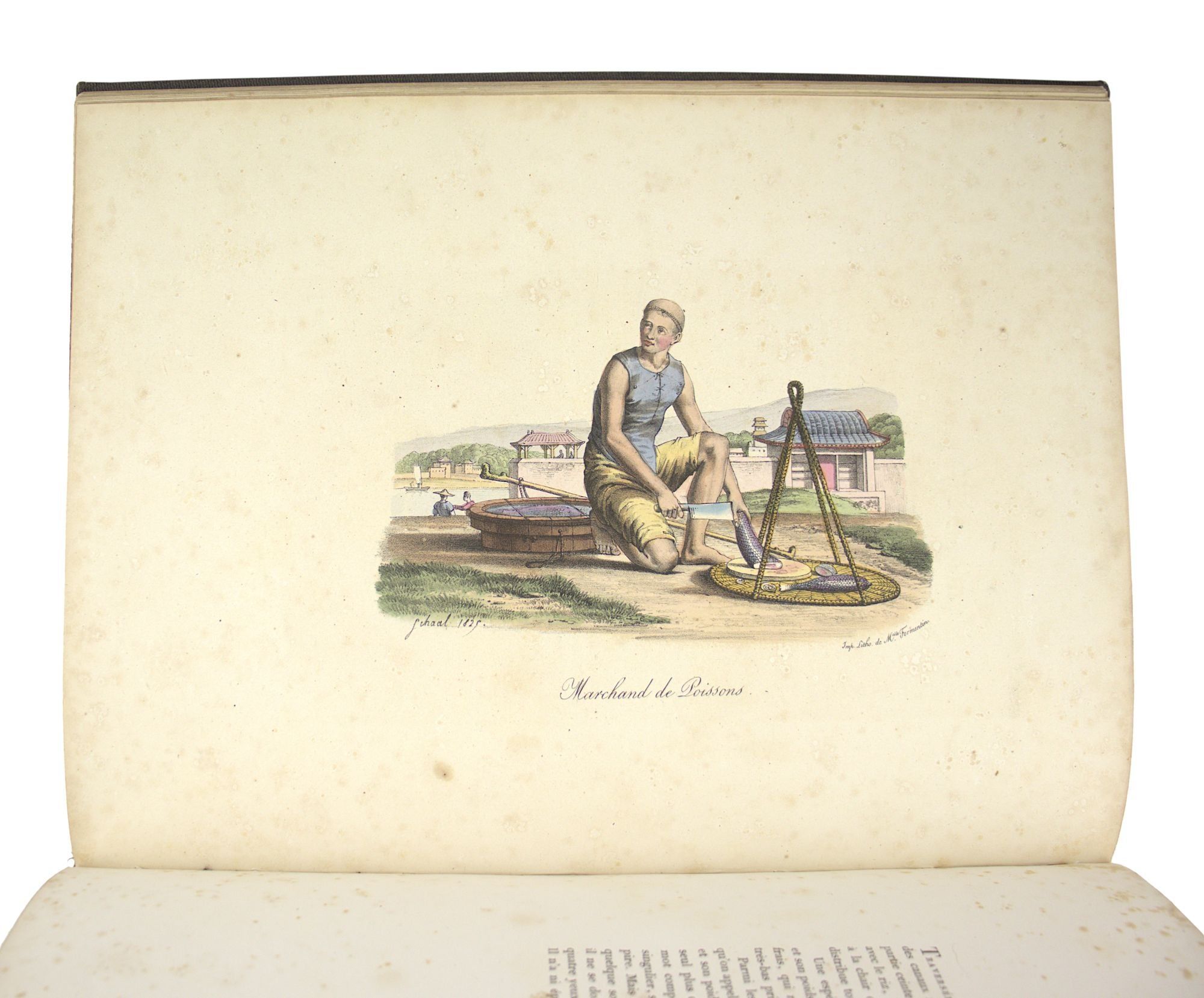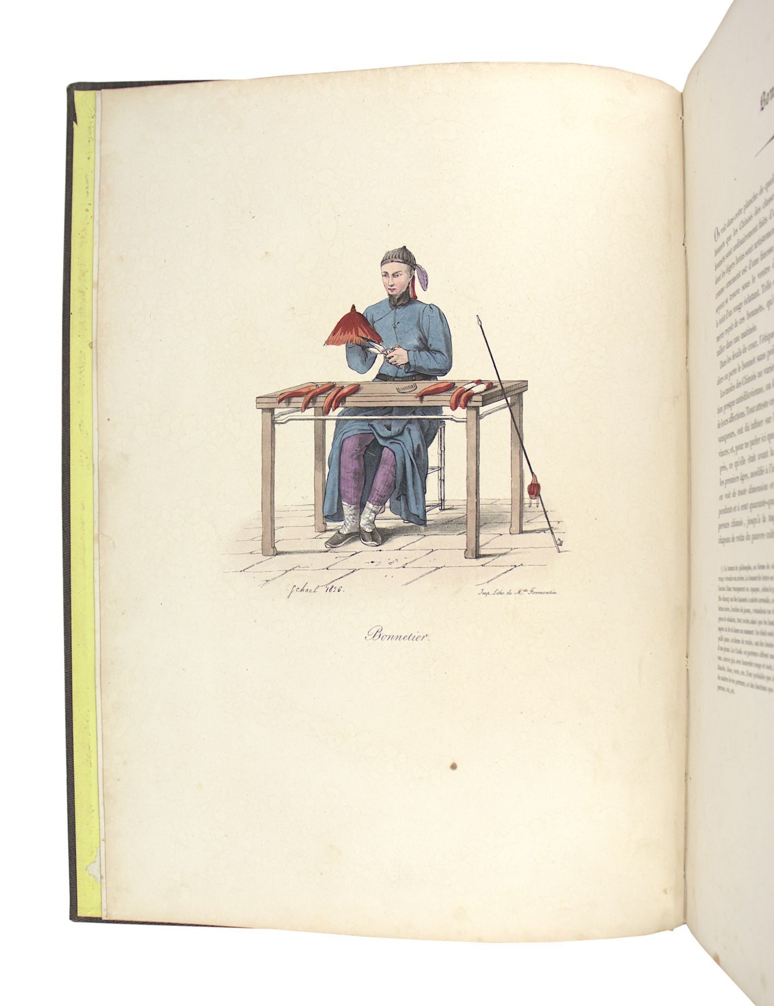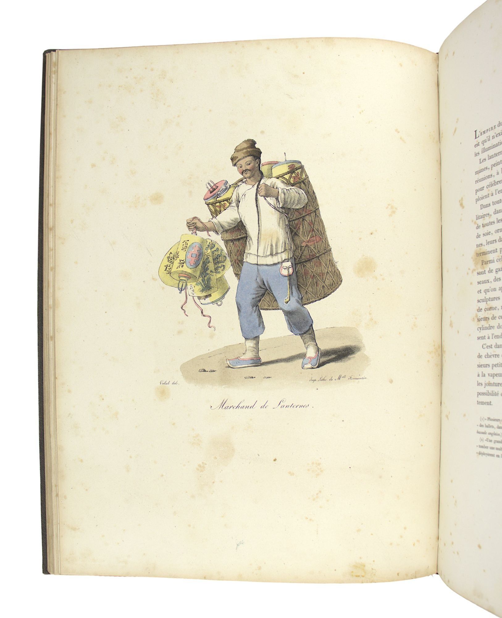 Marvelous plate book depicting twenty scenes of Chinese life and labor based on works by popular French artists of the day—Hyacinthe Aubry-Lecomte, Henri Grevedon, Achile Devéria, Auguste Jacques Regnier, and others. Much of the volume is devoted to different trades: hat maker, Buddhist monk, shoemaker, brick layer, arrow maker, furrier, traveling forger, lantern seller, fish and flute merchant, or a distiller preparing zam-fou, described here as a kind of rice-based eau de vie, but stronger. A small cache of plates also show more quotidian scenes: an upper class mother and her child in an elegant nursery, a family of river-dwellers, a group of children eating lunch.