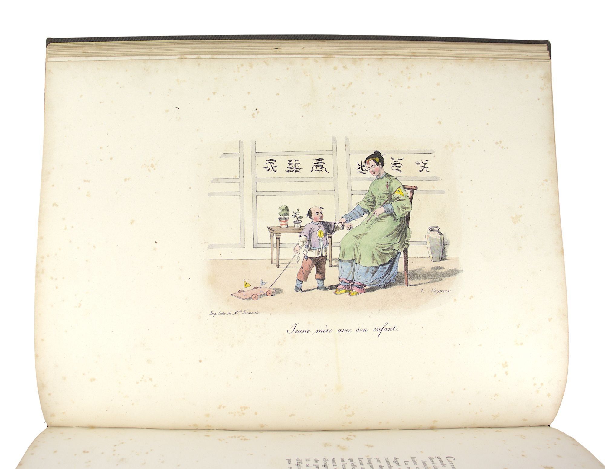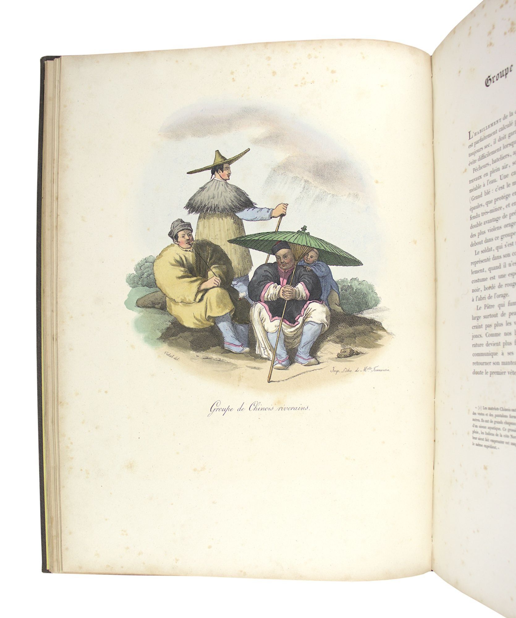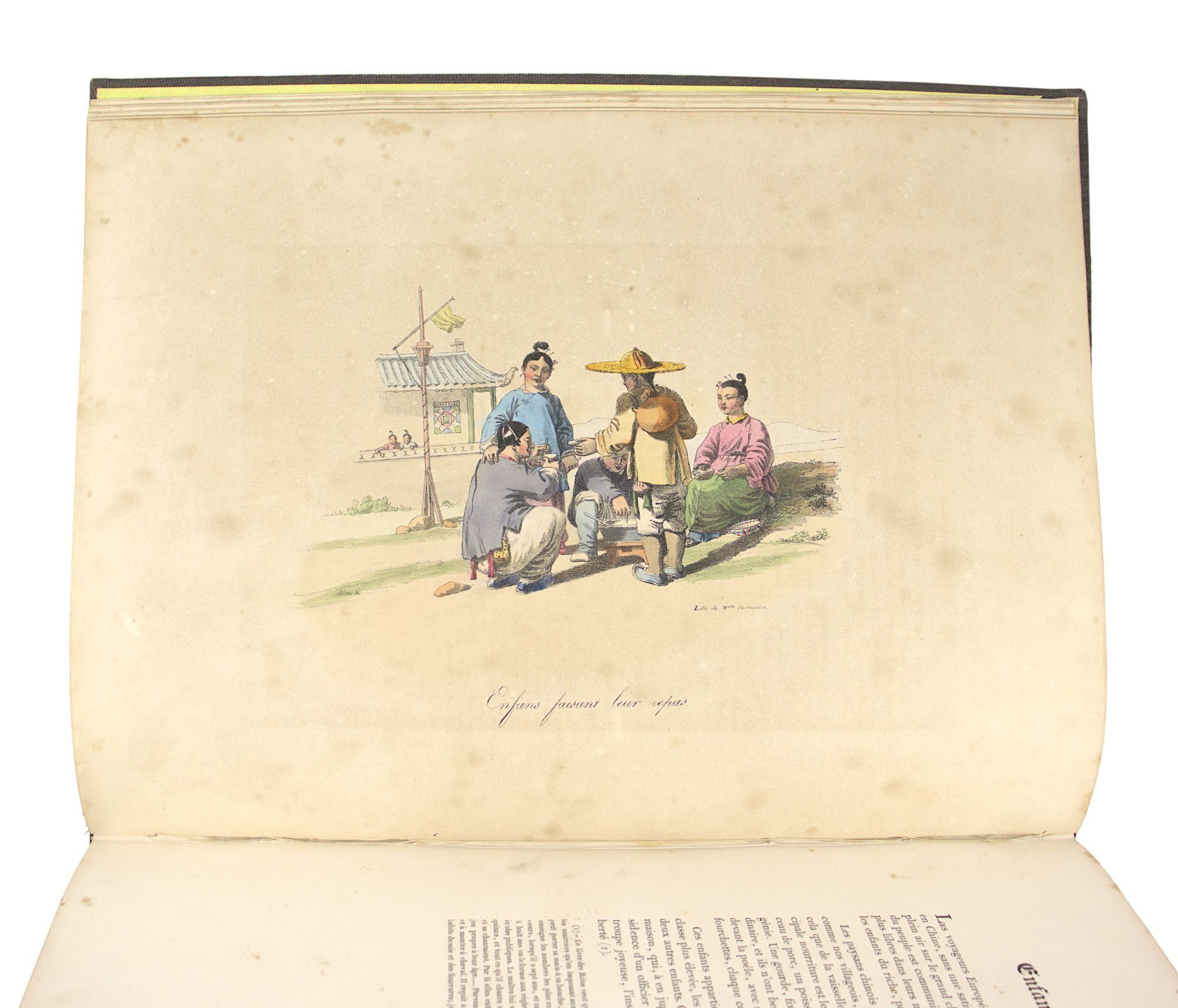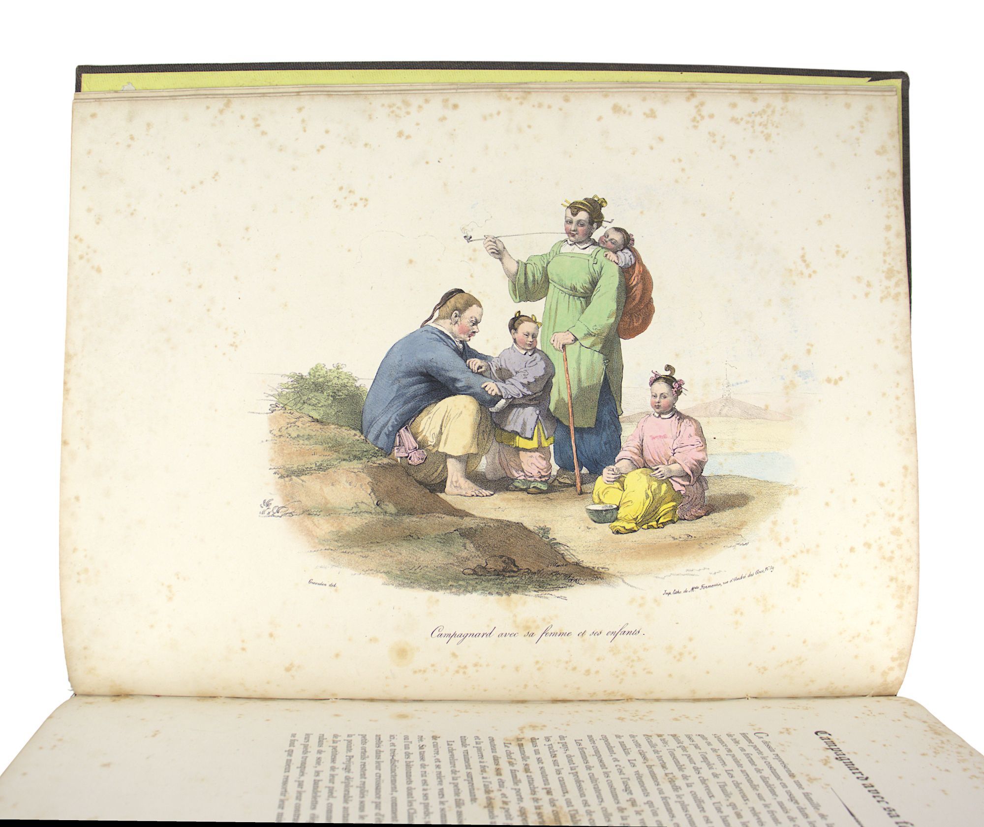 Marvelous plate book depicting twenty scenes of Chinese life and labor based on works by popular French artists of the day—Hyacinthe Aubry-Lecomte, Henri Grevedon, Achile Devéria, Auguste Jacques Regnier, and others. Much of the volume is devoted to different trades: hat maker, Buddhist monk, shoemaker, brick layer, arrow maker, furrier, traveling forger, lantern seller, fish and flute merchant, or a distiller preparing zam-fou, described here as a kind of rice-based eau de vie, but stronger. A small cache of plates also show more quotidian scenes: an upper class mother and her child in an elegant nursery, a family of river-dwellers, a group of children eating lunch.