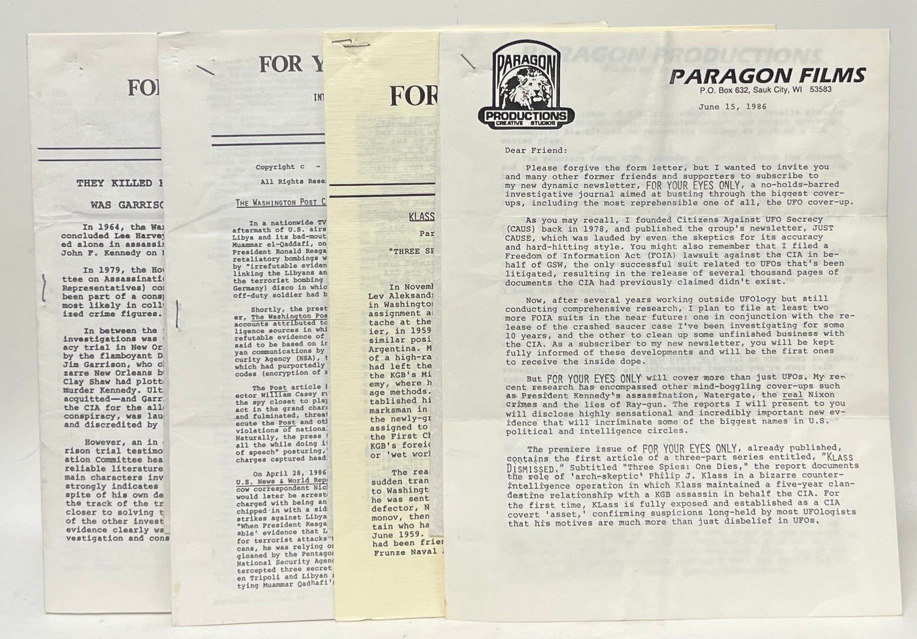 Sauk City: Paragon Independent News Service, 1987. Staplebound. Very Good. Three with the original mailing envelope from Zechel to Tom Benson. Very Good. General handling wear, some soiling, folds from mailing, free from marginalia. From the former editor of Just Cause, a "no-holds-barred investigative journal" about more than UFOs, here covering Philip Klass's role as a CIA asset, intelligence leaks, the Kennedy assassination, Korean Air Lines flight 007, the government's role fighting against the Sandinistas, among others. Seemingly scarce with no copies listed in OCLC. From the collection of ufologist Tom Benson.