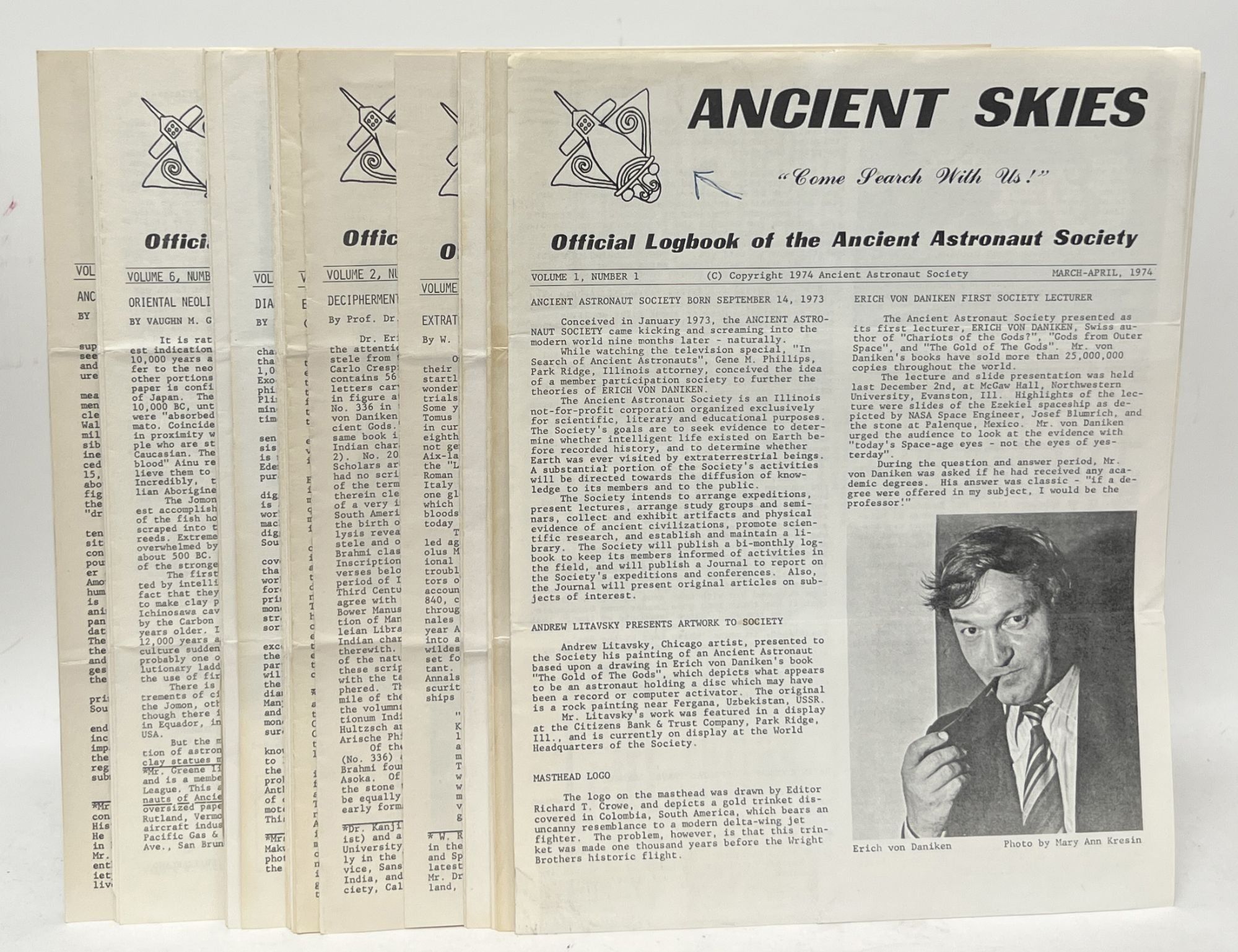 Highland Park: Ancient Astronaut Society, 1983. Staplebound. Very Good. Vol. 1, Nos. 1, 3-6; Vol. 2, Nos. 1-2, 4-6; Vol. 3, Nos. 1-2; 4-6; Vol. 4, Nos. 1-6; Vol. 5, Nos. 1-5; Vol. 6, Nos. 1-6; Vol. 7, Nos. 1-4; Vol. 9, No. 2; Vol. 10, No. 2 (two copies). Generally Very Good, though Vol.1 No. 1 is Fair with a portion clipped from the last page related to The First World Conference of Ancient Astronauts. A large collection of newsletters published by the organization founded to further explore Erich von Daniken's theories. What started in one man's living room in Park Ridge, Illinois eventually grew into an international venture, hosting expeditions and conferences around the world. From the collection of ufologist Tom Benson. [Eberhart 13186].