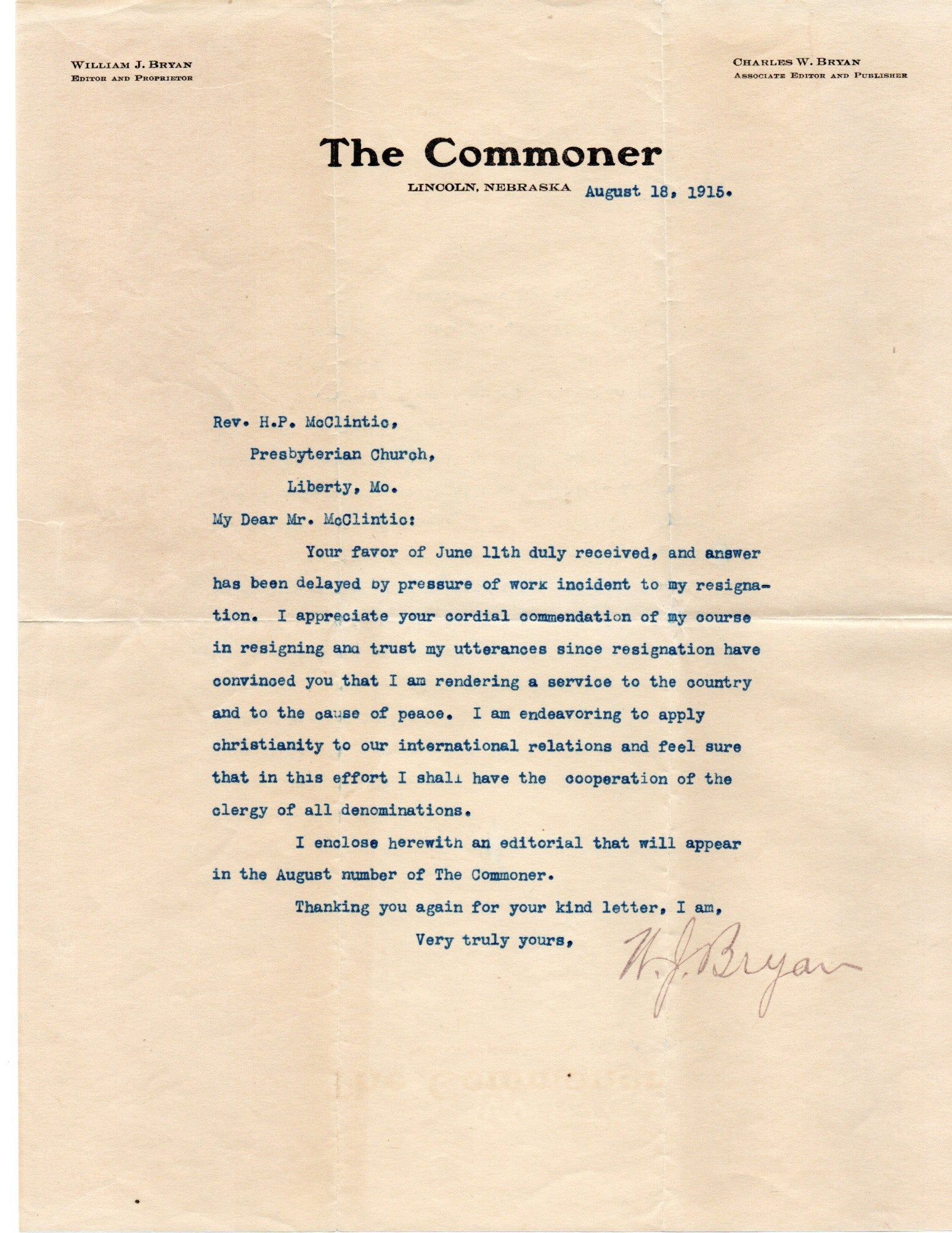 Lincoln, Nebraska: William J. Bryan, 1915. Very Good+ binding. A typed letter signed by William Jennings Bryan, the American politician, on The Commoner letterhead. Also with an excised leaf from an issue of The Commoner from the same year, August 1915. Two months prior, Bryan resigned his position of Secretary of State under President Wilson in protest over the administration’s progressively friendly stance to the Entente powers and the prospect of American intervention. A Reverend of the Presbyterian Church in Liberty, Missouri wrote his support of Bryan’s actions on June 11, and this is Bryan’s delayed response; with an excised leaf from the upcoming issue of Bryan’s antiwar publication, The Commoner, as mentioned in Bryan’s letter. Both are folded, with small tears along the folds of The Commoner. Very Good+ binding.