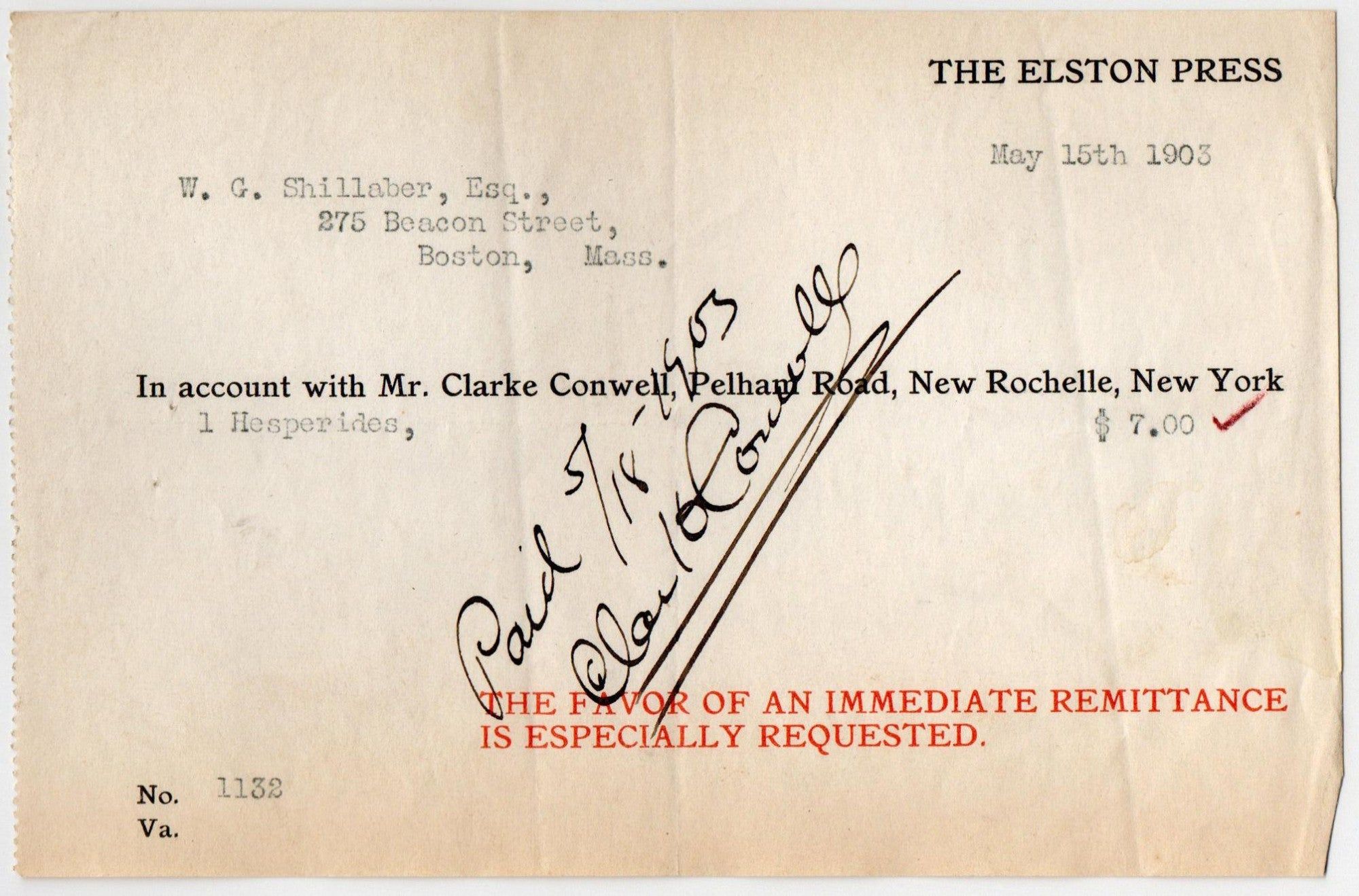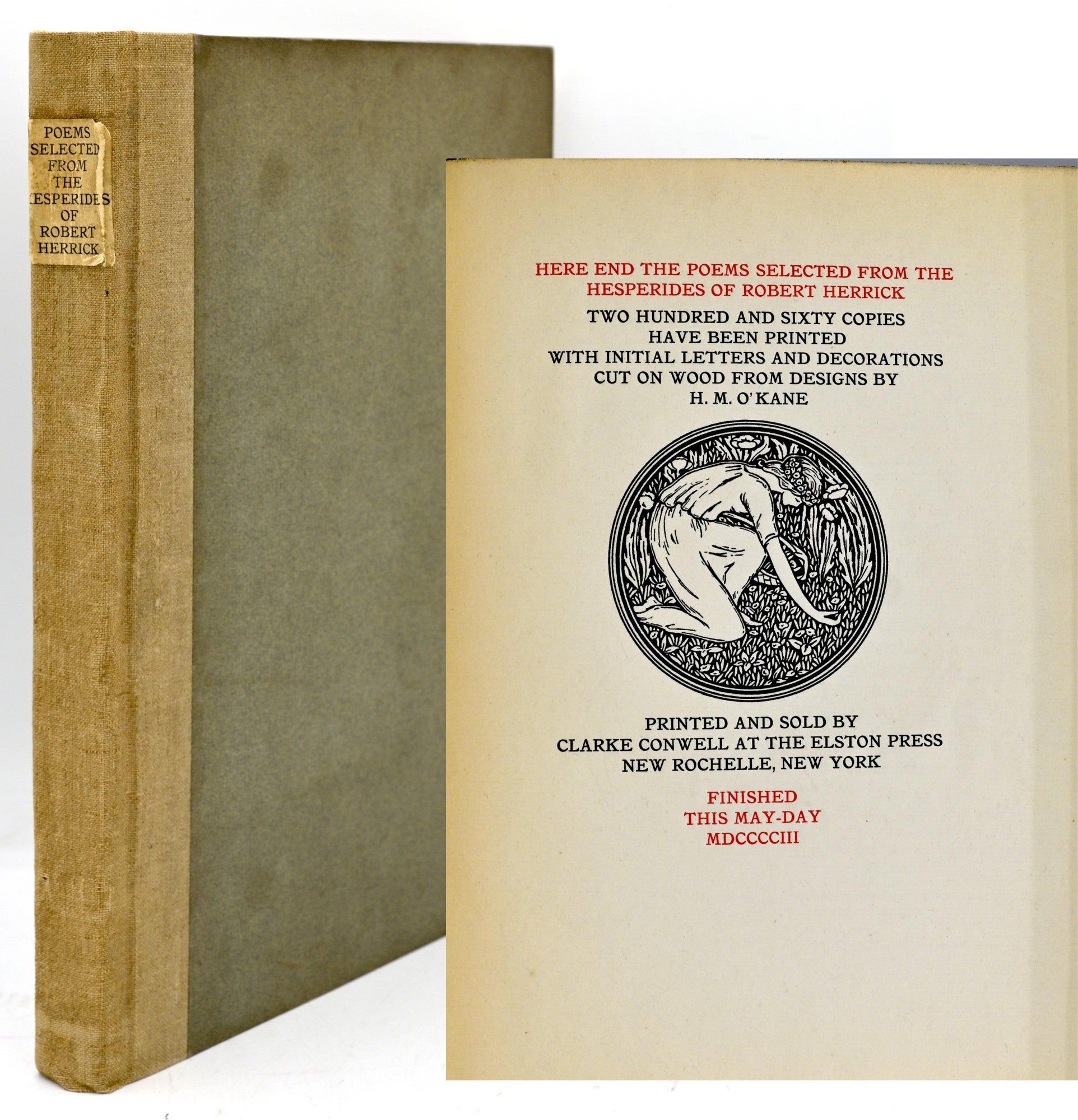 New Rochelle: The Elston Press, 1903. Limited Edition. Very Good+ binding. Signed. Large 8vo, quarter bound in brown cloth over paper covered boards; with a paper label on the spine; 155 pages; a bit of soiling to the boards; some wear to the edges; the label has a touch of surface loss; printed in black and red ink; slight toning to the edge of the pages; back hinge is cracked but holding quite well.~~Printed by Clarke Conwell at The Elston Press. With Initial Letters and decorations cut on wood from designs by H. M. O’Kane. Limited to 260 copies.~~With a laid in receipt signed by Clarke Conwell. Very Good+ binding.
