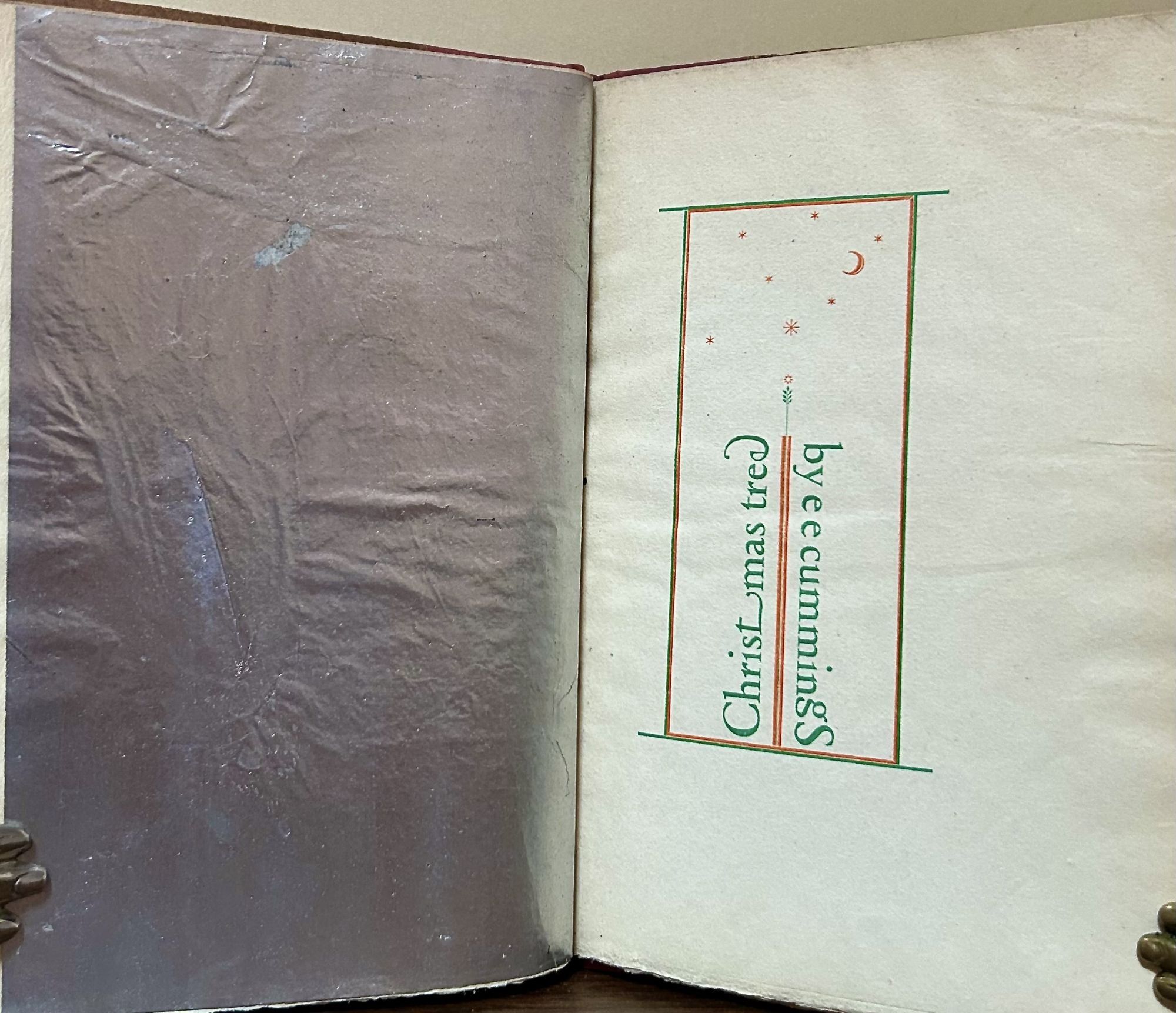 New York: American Book Bindery, Inc, 1928. First edition. Hardcover. Quarter red cloth and green boards with silver stripe lettered in red. Very good in clear mylar dust wrapper. Very good. Cummings, E.E. Five double paged leaves. 20 x 13.5 cm. Frontispiece printed in red and green running length-wise with a silver iridescent accompaniment. Typography by S.A. Jacobs. Light green endpapers. Interior contents sharp, fade to covers at margins and backstrip.