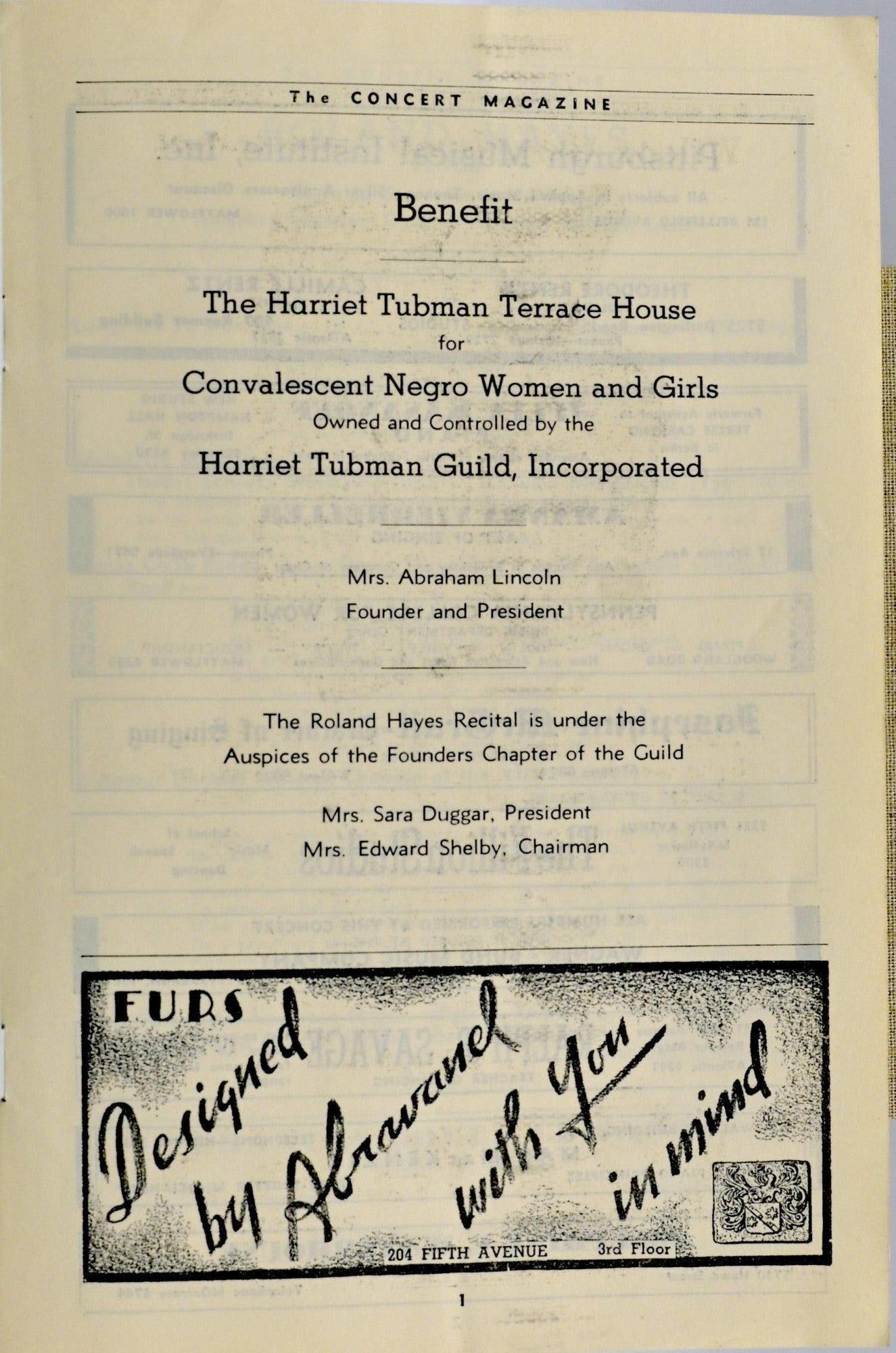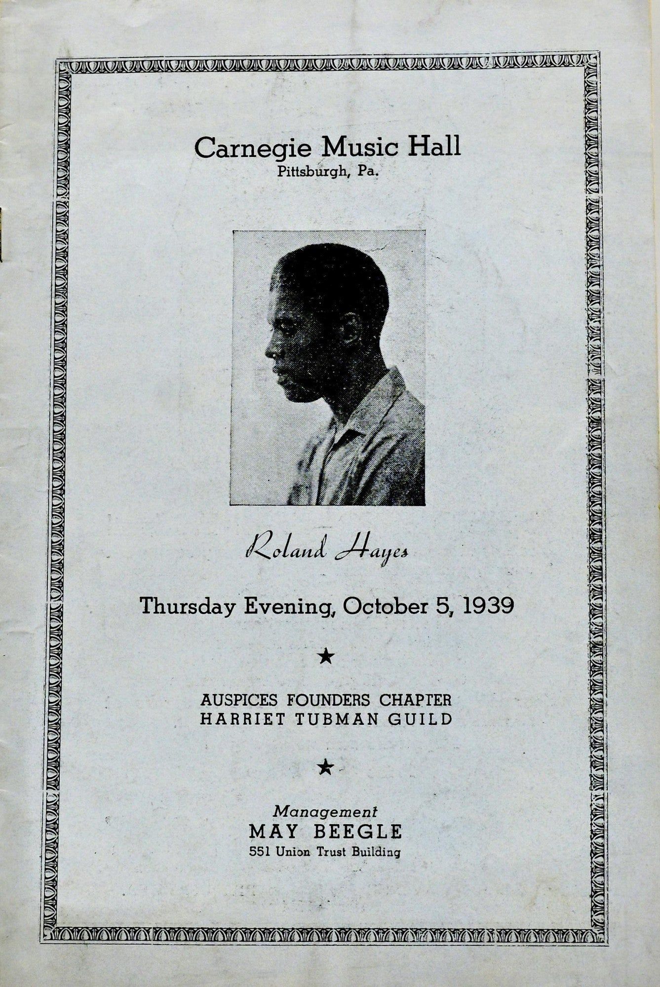 On October 5, 1939, Roland Hayes (1887-1977) performed at Carnegie Music Hall in Pittsburgh, PA. Hayes, a lyric tenor and composer, was one of the earliest classical performers to break the color barrier. By 1939 he was quite successful. ~~The concert was performed for the benefit of the Harriet Tubman Terrace House for Convalescent Negro Women and Girls. The Harriet Tubman Guild was formed in 1915 and active in their community. By 1934 the group had grown and incorporated as the Harriet Tubman Guild, Inc. They purchased The Terrace House in Pittsburgh to serve convalescent women of color. ~~9”x6” softcover light blue pamphlet; 8pp; v. good.