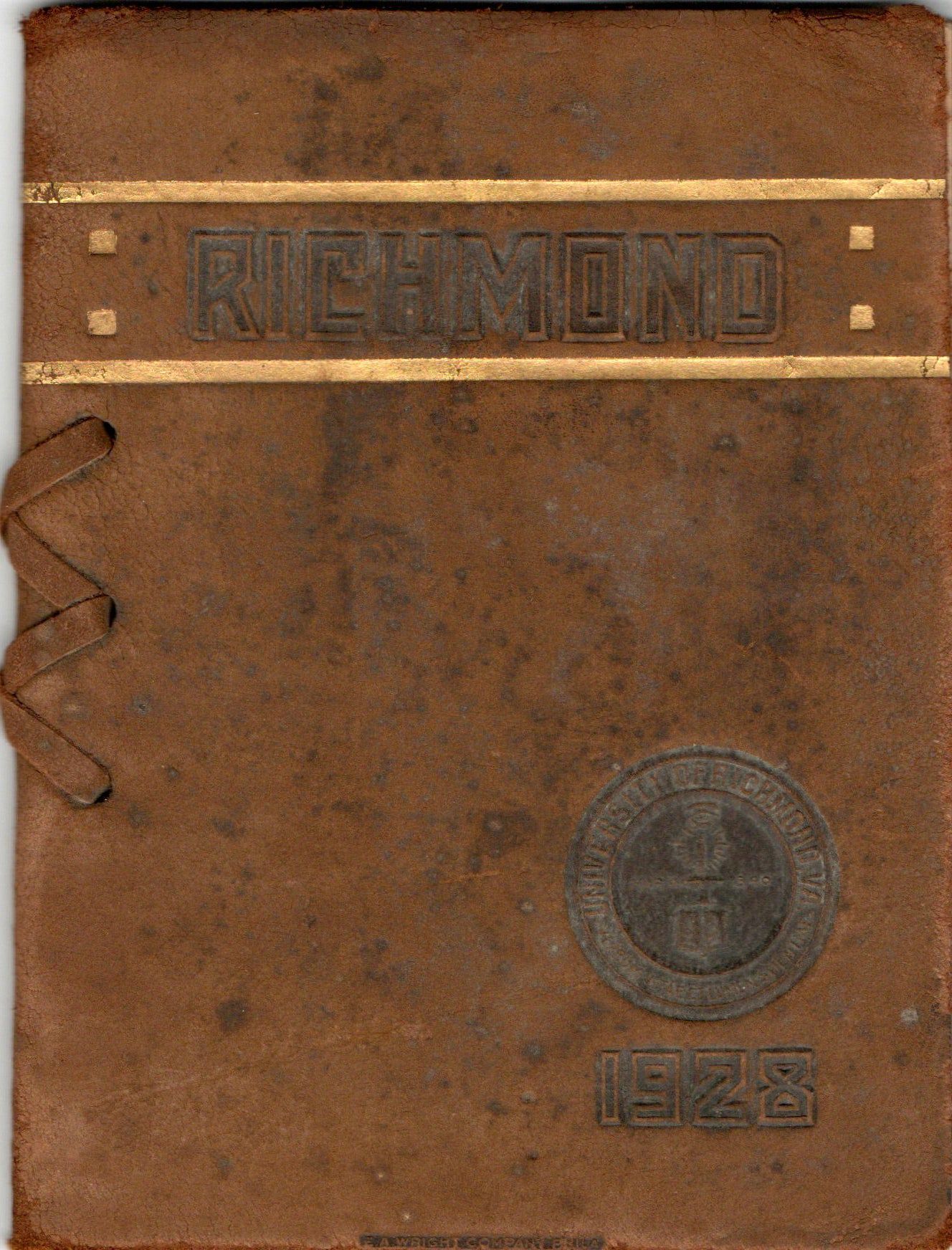 5 3/4” X 4 1/14” leather soft-cover sewn booklet with embossed seal of university and gilded embellishments. 9pp. ~~The program shows that between June 2-5, 1928 class days, alumni days, and the commencement were to take place. It lists the names and hometowns of the 53 young men graduating from Richmond College, 54 young women graduating from Westhampton College, and 18 men graduating from the T.C. Williams School of Law, as well as the officers for each class. 2 photographs of school buildings are interspersed.~~Front cover suede is foxed; cover sheet has moderate losses to outer edges/corners; pages are very good.