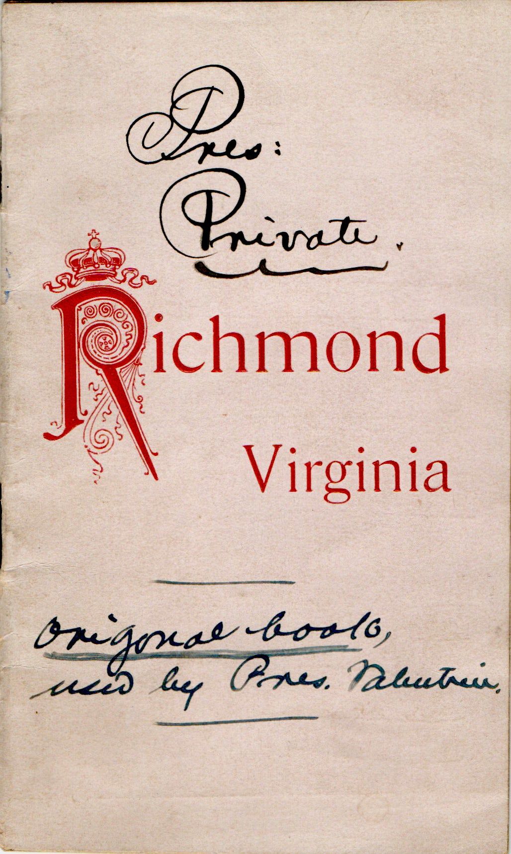Richmond, VA: J.L. Hill Printing Company, 1898.  A 5 3/4” x 3 1/2” softcover booklet gives the Officers, Committeemen, and By-Laws of the Young Men’s Business Association for Richmond, the “Queen City of the South”. This copy was owned by Henry Lee Valentine, the President of the Y.M.B.A. at the time. ~~The Young Men’s Business Association was founded to help improve the advancement of the cities interests, and support other organizations with similar goals. ~~An inscription on the front reads in black cursive, “Pres: Private. Original Book, used by Pres. Valentine.” Valentine (1867-1931) was one of nine children of Mann Satterwhite Valentine, II, who’s collections formed the early foundation of Richmond’s Valentine Museum. Henry Lee Valentine was involved in manufacturing. He marked the section on rules outlining his duties as President. Pasted inside the front cover is a list of the agenda to each meeting, with most items crossed out or otherwise marked by Valentine. ~~Very good condition. ~.