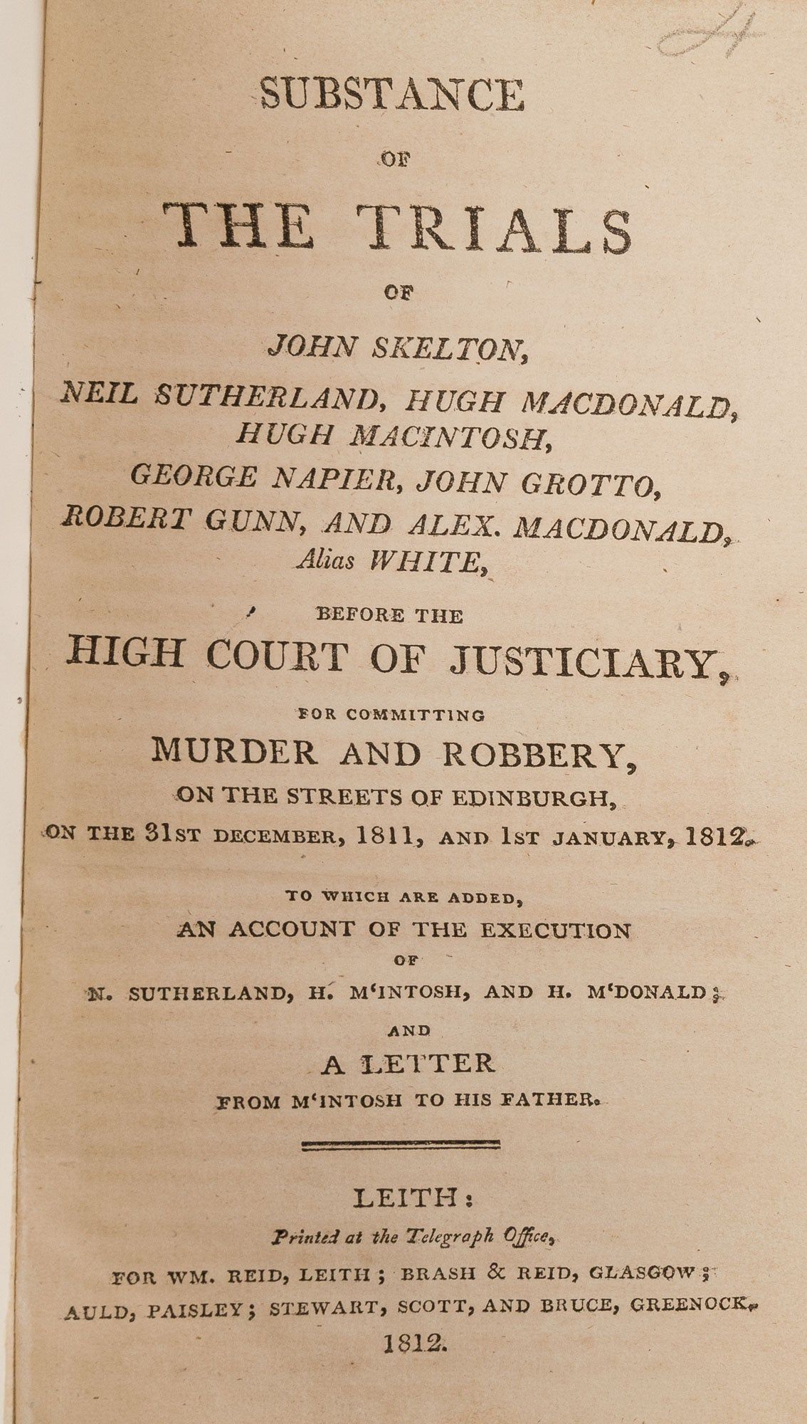 1812. The Aftermath of an Edinburgh Riot [Trials]. Skelton, John, Primary Defendant. Substance of the Trials of John Skelton, Neil Sutherland, Hugh MacDonald, Hugh MacIntosh, George Napier, John Grotto, Robert Gunn, And Alex. MacDonald, Alias White, Before the High Court of Justiciary, For Committing Murder and Robbery, On the Streets of Edinburgh, On the 31st December, 1811, And 1st January, 1812. To Which are Added, An Account of the Execution of N. Sutherland, H. M'Intosh, and H. M'Donald; And a Letter from M'Intosh to His Father. Leith: Printed at the Telegraph Office, for William Reid, 1812. 72 pp. 12mo. (7" x 3-3/4"). Stab-stitched pamphlet in later buckram, gilt fillets and title to spine, later bookplate of Sir Geoffrey Gould Briggs to front pastedown. Moderate toning to interior, second and third leaves detached. $250. * Only edition. Skelton and his co-defendants were participants in the Tron Riot, a disturbance in Edinburgh's Old Town on Hogmanay. Most of the rioters were boys or young men. Skelton, McIntosh, Macdonald and Sutherland were sentenced to death; Skelton's sentence was commuted to transportation for life and the others hanged. Though the riot did not have a specific inciting event, the participants were dissatisfied with the economic inequality and increased police presence in Edinburgh. Official narratives sought to downplay this aspect of the riot and focused on constructing the rioters as idle delinquents. Our pamphlet concurs, characterizing the defendants as "dissolute and licentious" and urging parents to "bring [their children] up in paths of religion and morality." Briggs [1914-1993] was Chief Justice of the Supreme Court of Hong Kong in the 1970s and of Brunei in the 1980s. OCLC locates 4 copies in North American law libraries (Social Law, Library of Congress, Harvard, University of Minnesota).