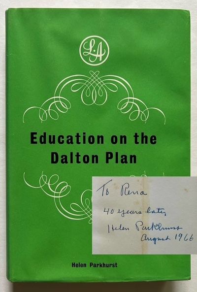 Bath, England: Cedric Chivers Ltd, 1966. Very Good/Very Good +. INSCRIBED BY HELEN PARKHUST (44 years after publication!) on the front free endpaper. A bright, very presentable copy to boot of this handsome 1966 UK re-issue. Solid and VG (light spotting and offsetting along the pastedowns and endsheets) in a crisp, VG+ dustjacket, with very light waviness to the panels. 12mo, seminal text detailing the "Laboratory Plan, later to be called the Dalton Plan, which was originated by Helen Parkhurst at Tacoma, Washington in 1910". "The Dalton Plan" is now considered a major text in early 20th century "Progressive" education.