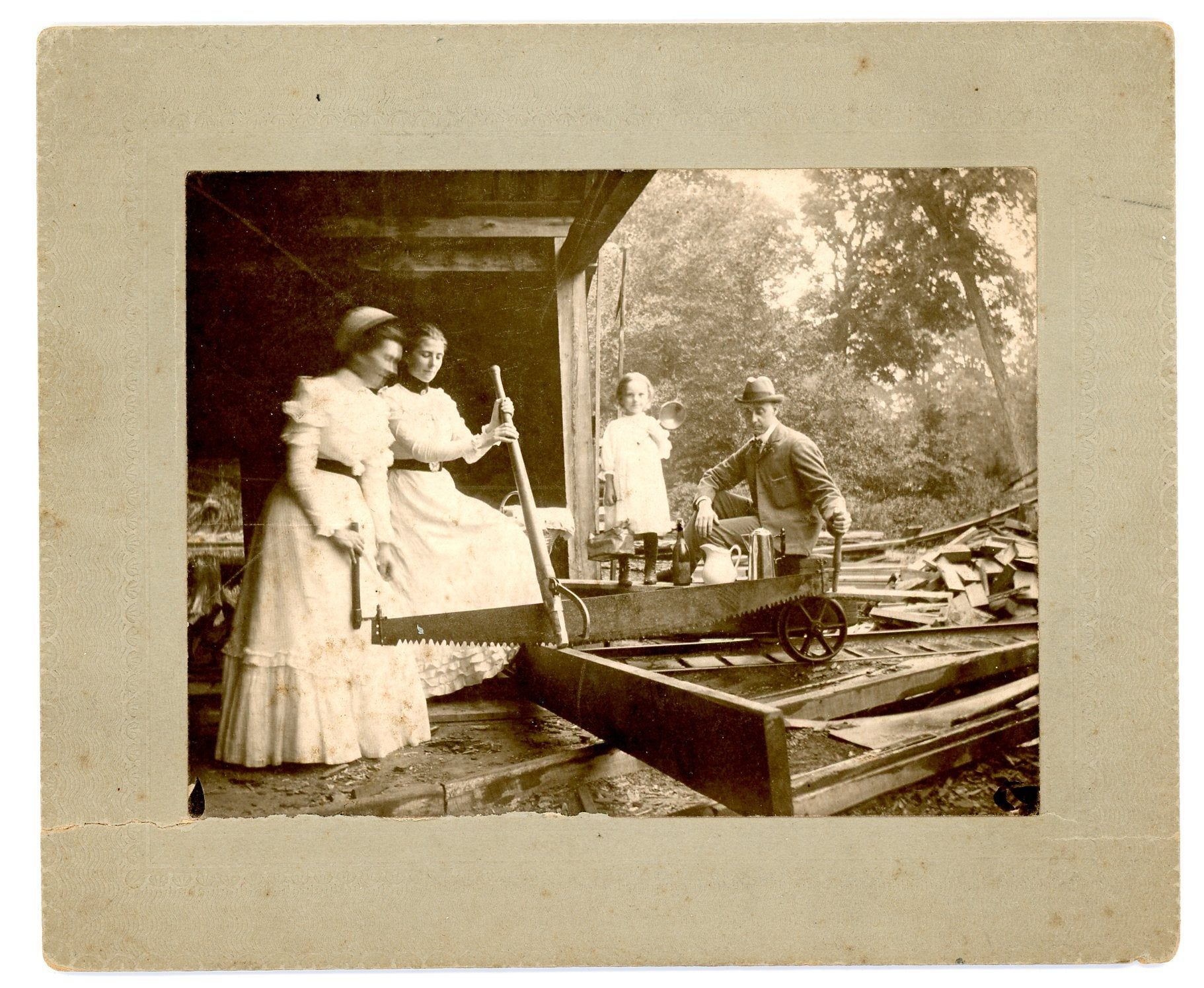 Wear to mount. Presumably a staged scene with two women dressed in their finery operating a long saw on wheels. a young girl looks on as a man guides the wheeled end of the saw. Cut wood in the background. 3.25" by 4.25" photo on larger mount. So easy a women can do it.
