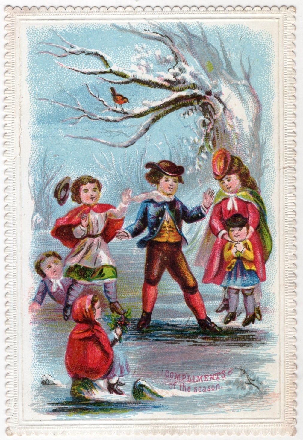 England, 1880. Very good to near-fine. Light dust soiling.. A charming 16mo valentine depicting a group of Victorian children playing on a frozen pond, with the message "Compliments of the season". A red-breasted robin looks on from a tree branch. Features a decorative embossed border. Measures approx. 3.5" by 2.5