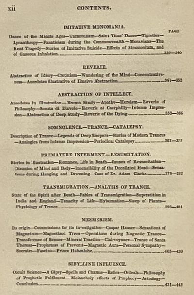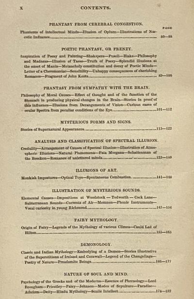 London: Longman, Orme, Brown, Green, & Longmans. / Gilbert and Rivington, Printers, 1841. Hard Cover. Good/No Jacket. First edition. Spine crudely repaired by previous owner, splits still showing along both joints, discoloration to base and fore edge of both boards, bookplate of M.K. Welch and four small sticker remnants on front endpaper. 1841 Hard Cover. xii, 443 pp., 16-page catalog of medical works bound in following text. Black cloth with blind-stamped decorations and borders, gilt titles. Written by a surgeon known for his culture and literary taste, who wrote about twenty works on topics from medicine and the sciences to poetry and travel. This is "a treatise on dreams, spectral illusions, and other imperfect manifestations of the mind" (Dictionary of National Biography) which also discusses fairy mythology, demons, ghosts, witchcraft, memory, sleep-walking and -talking, trance / catalepsy, transmigration of the soul, and mesmerism / hypnotism.