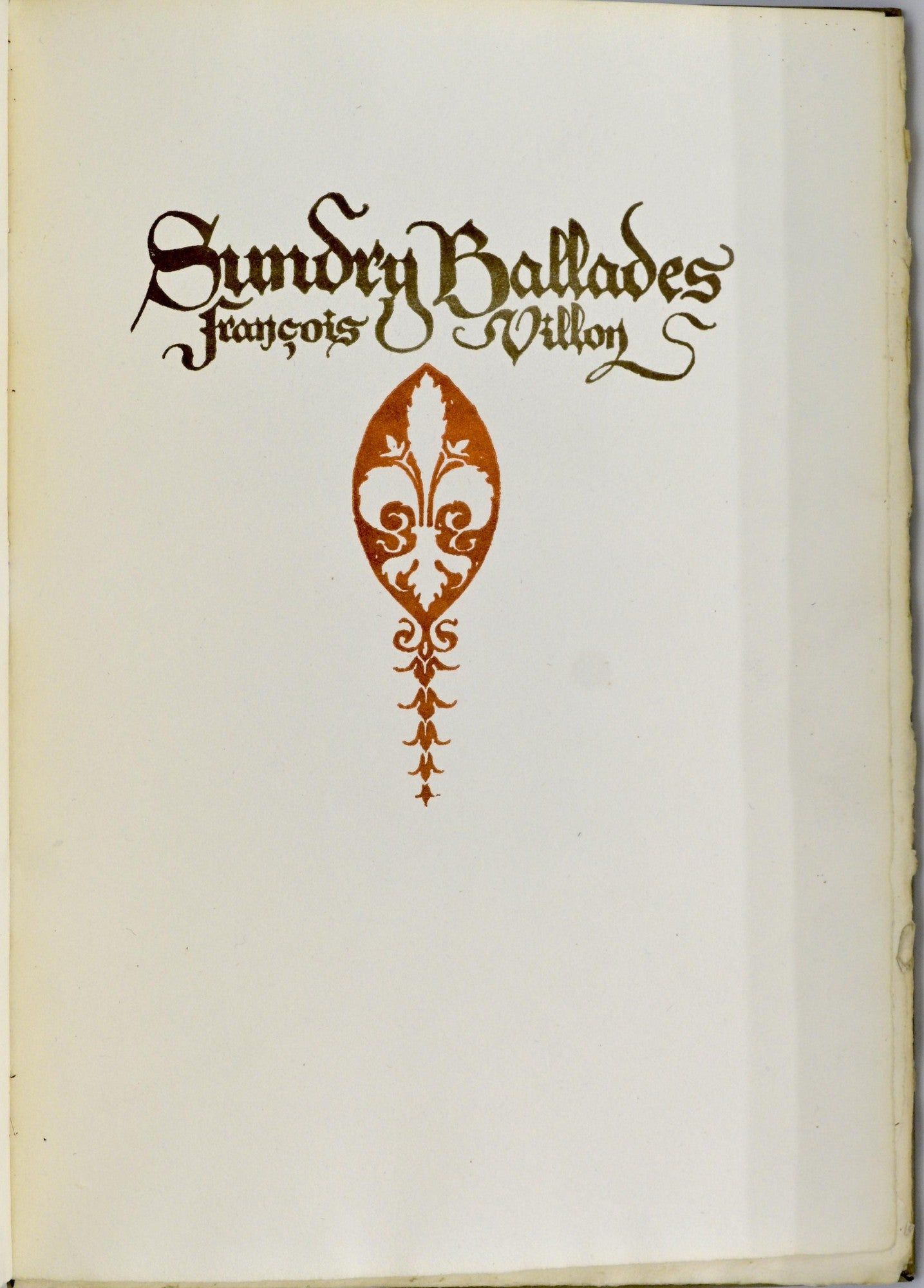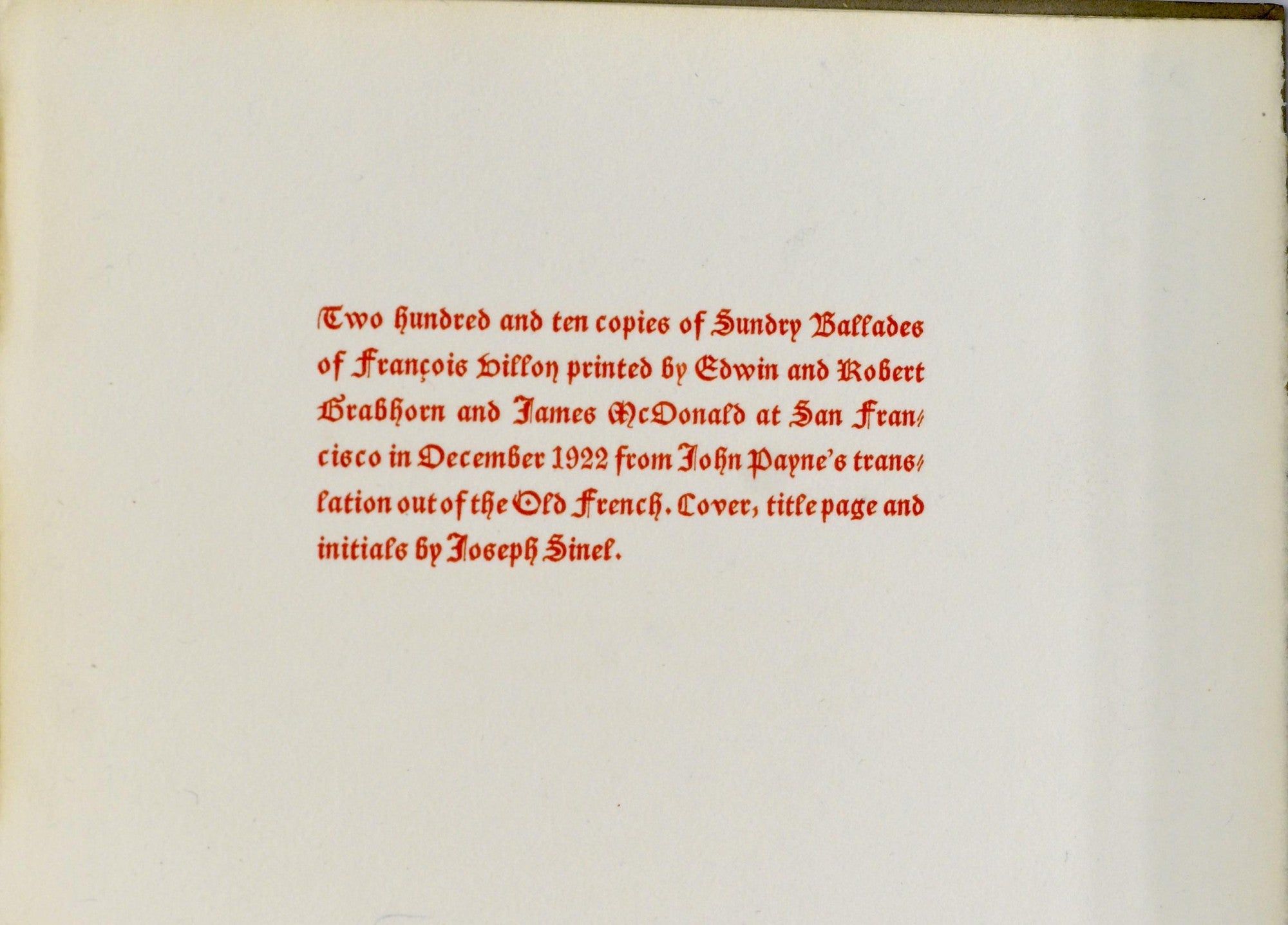 [San Francisco]: Grabhorn Press } Edwin and Robert Grabhorn and James McDonald], 1922. Hard Cover. Very Good binding. Quarto; in printed paper-covered boards with fleur-de-lis decoratiobacked in parchment ;[19] pages; title leaf printed in brown and terra-cotta; text printed in black and red, with initials by ~hand by Joseph Sinef in teal.~~Villon's Ballade for his mother -- Ballade of old time ladies -- Ballade of old time lands -- Ballade of things know and unknown -- Ballade to those of ill life -- Ballade of the women of Paris -- Ballade of poor chimneysweeps -- Ballade of proverbs. (Heller 49). Very Good binding.