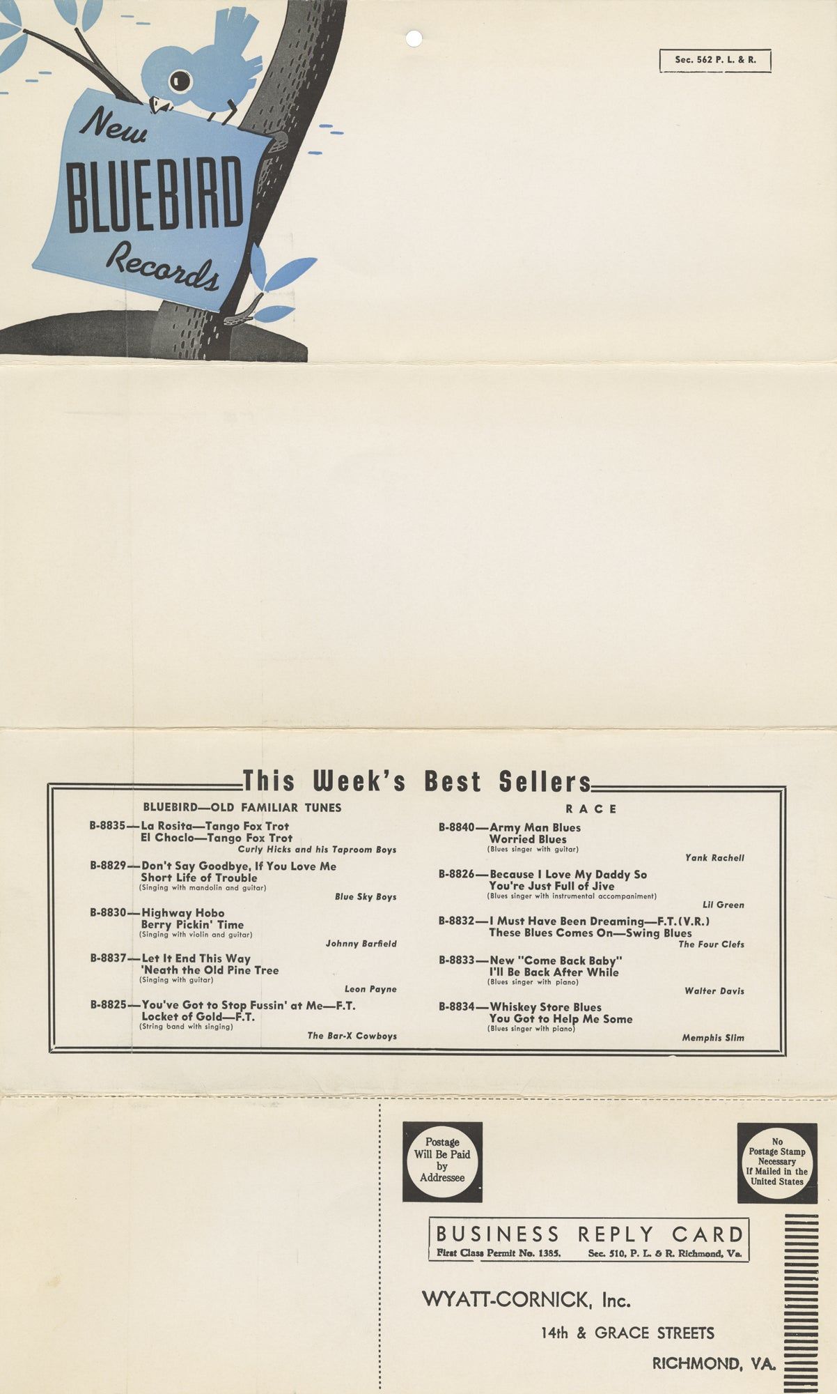 New York: Bluebird Records, 1941. Vintage mail catalog for Bluebird Records' newest releases, issued circa 1941.