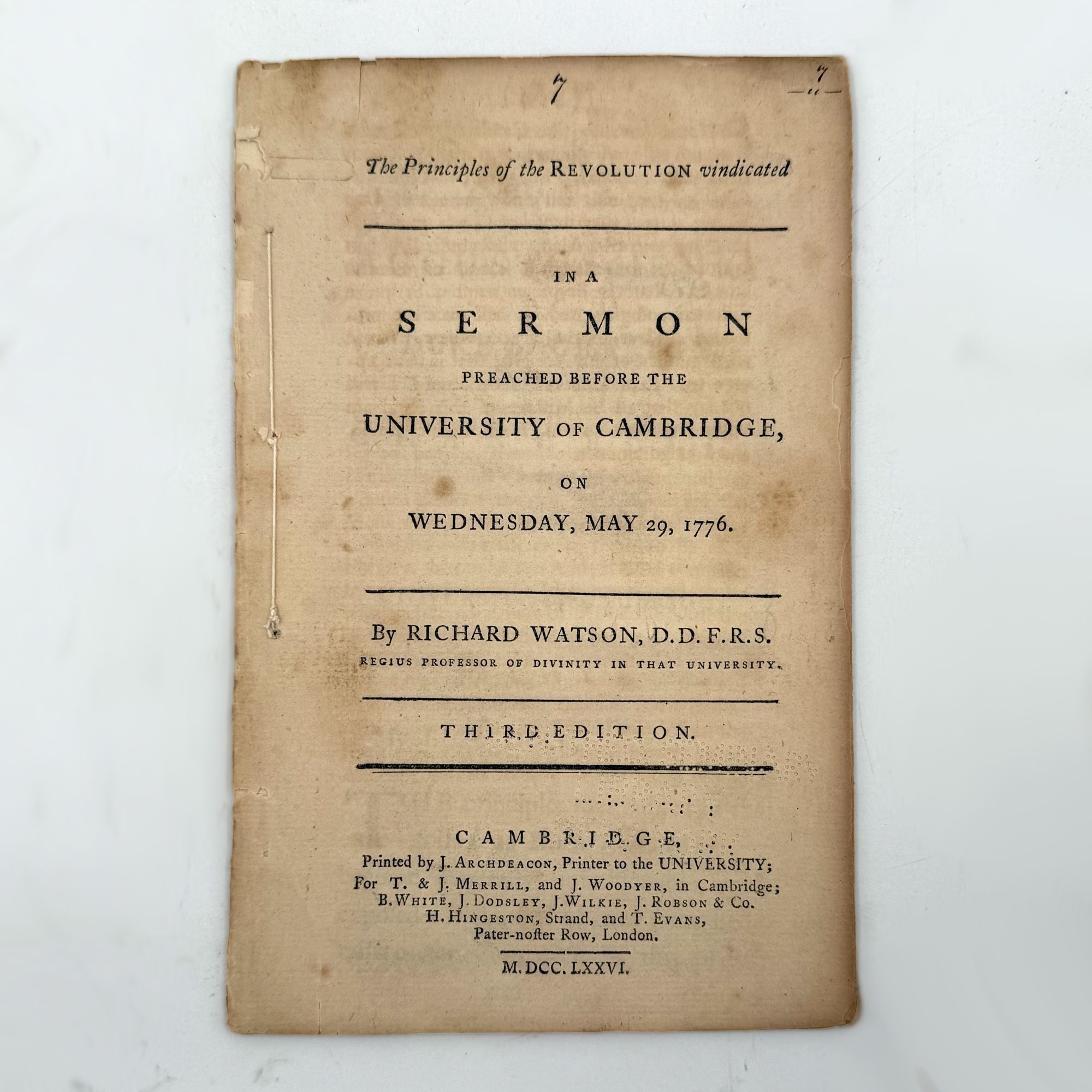 Cambridge: Printed by J. Archdeacon, 1776. Third edition. 23, [1]pp. 8vo. Disbound, restitched. Minor toning, minor chips and edge tears. Provenance: General Theological Seminary (perforated stamps). Third edition. 23, [1]pp. 8vo. Watson (1737-1816), bishop of Llandaff, "entered the national political arena on 29 May 1776, when he preached the Restoration day sermon at Cambridge, entitled The Principles of the Revolution Vindicated. In other years this would have been seen as an unexceptionable restatement of Locke's whig doctrine, but with the Americans on the brink of declaring independence it was perceived by many as a bold support of the rebels" (ODNB). The sermon went through three editions in London between July and November 1776, with a further edition translated into French. All are scarce on the market. ESTC T76650; Adams 76-160c; Sabin 102145