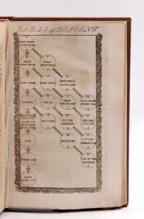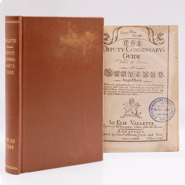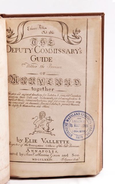 Annapolis [Md.]: Printed by Ann Catherine Green and Son, 1774. iv, 248, [12, Index]pp. Title page engraved by Thomas Sparrow (1746?-1780?) & Engraved Table of Descents (p. 106), 1 chart. 8vo. Modern brown cloth. GTS markings. Signed Ethan Allen Oct. 1861 on title-page. iv, 248, [12, Index]pp. Title page engraved by Thomas Sparrow (1746?-1780?) & Engraved Table of Descents (p. 106), 1 chart. 8vo. "Appendix : containing precedents of letters, bonds, writs, and other instruments occasionally issuing out of the Prerogative Court, together with a select and approved form for drawing of wills and codicils ... also the tables, for the reduction of sterling money into common currency ...": p. [161]-248. ESTC W20122; Evans 13742; Cohen, M.L. Bib. of Early American Law, 4632 Wroth, L.C. Maryland, 338; Sabin 98382