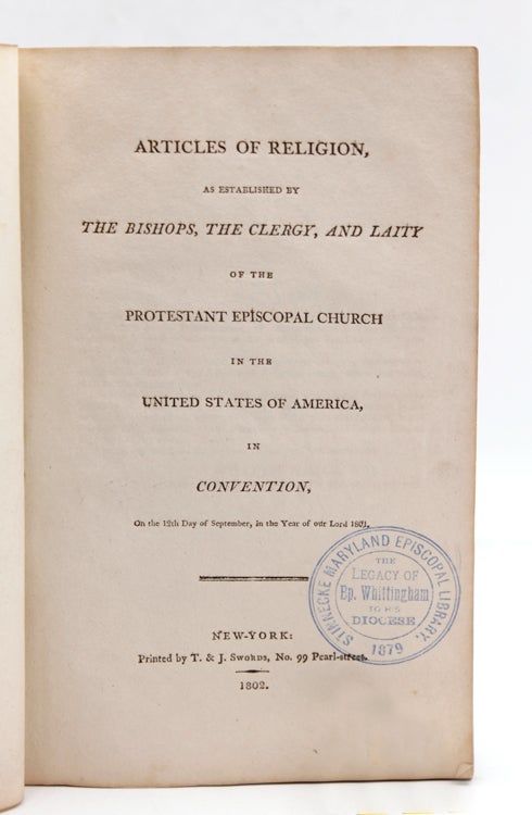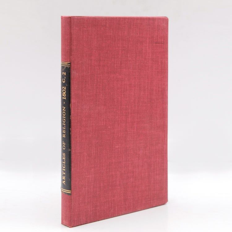 New York: Printed by T. & J. Swords, 1802. First Edition. 22pp. 12mo. Contemporary marbled wrappers, GTS and Stinnecke Maryland Episcopal Library stamps. In red cloth slipcase and chemise. First Edition. 22pp. 12mo. Thirty-nine articles of faith of the Protestant Episcopal Church. Shaw & Shoemaker, 2942