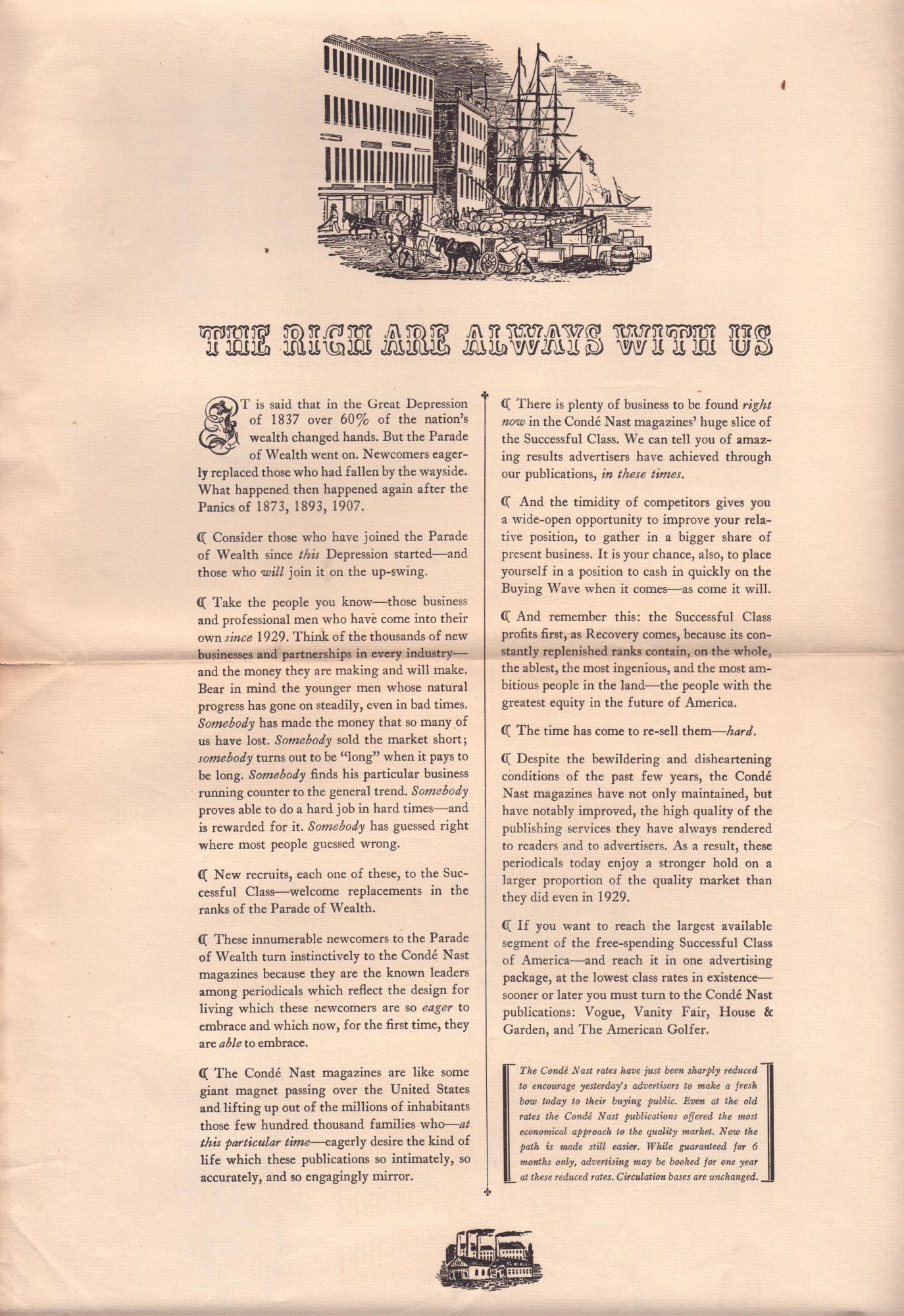 United States, 1930. 12 ½ x 18 ¾ sheet. Some wrinkles; near fine.. A broadside soliciting advertisers for Condé Nast’s publications Vogue, Vanity Fair, House & Garden, and The American Golfer. Printed following the 1929 crash, the broadside’s tactic is to portray Condé Nast magazines’ readers as the people who stay rich, or get even richer, during times of economic upheaval: the “Successful Class [which] profits first” because it contains the “ablest, the most ingenious, and the most ambitious people in the land.” “The time has come”, the broadside advises, “to re-sell them—hard.” We find no copies of this broadside in OCLC.