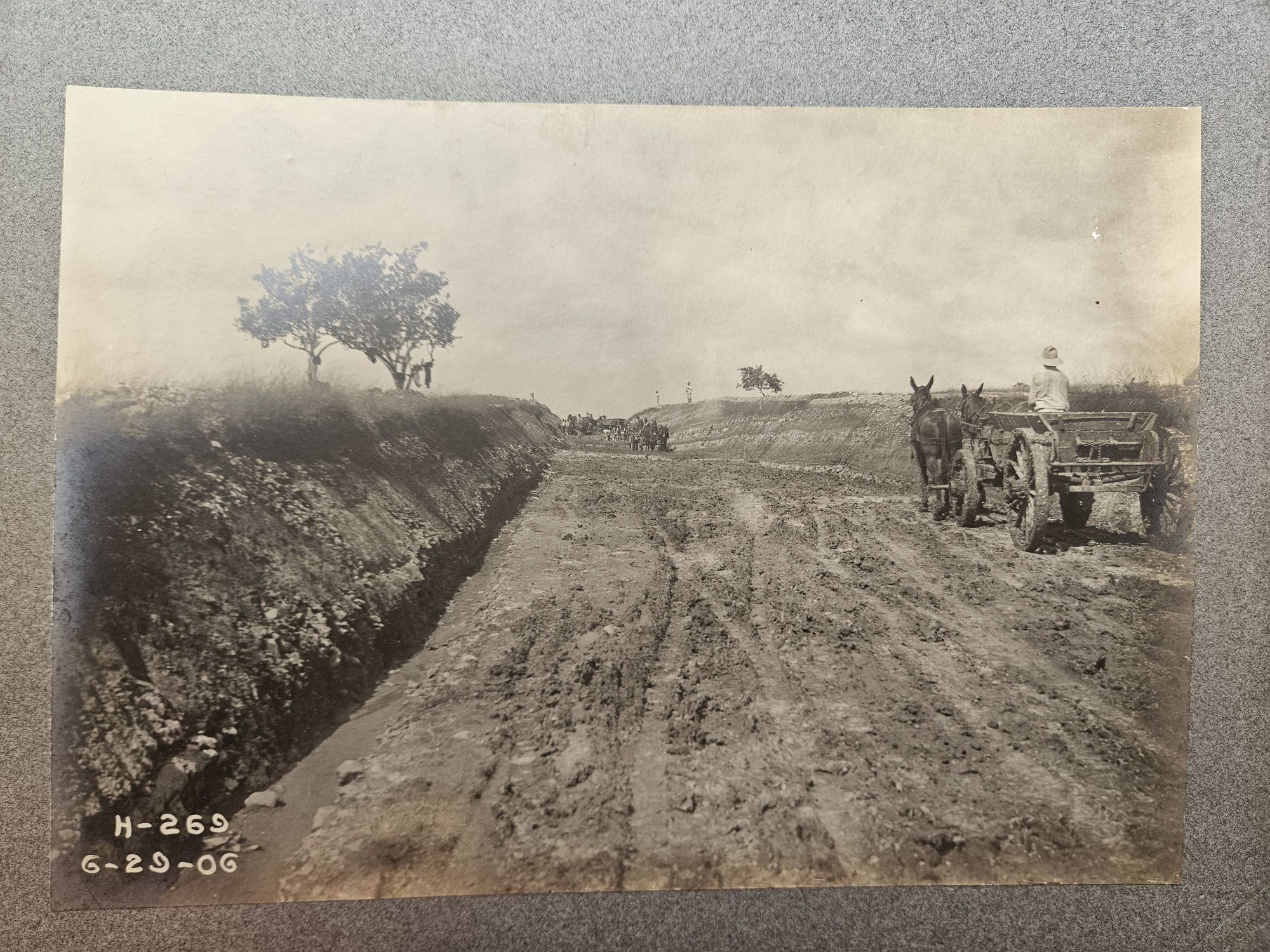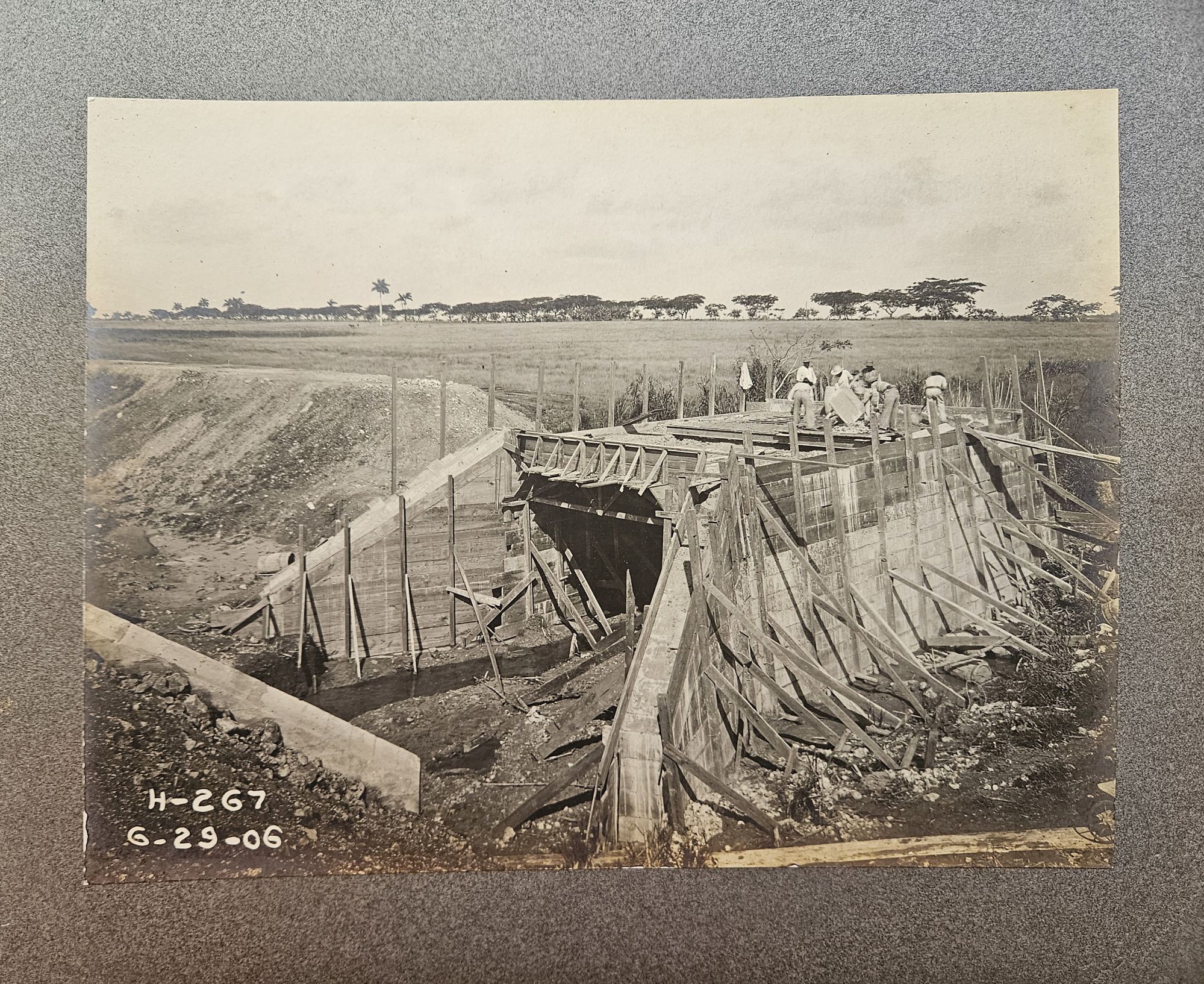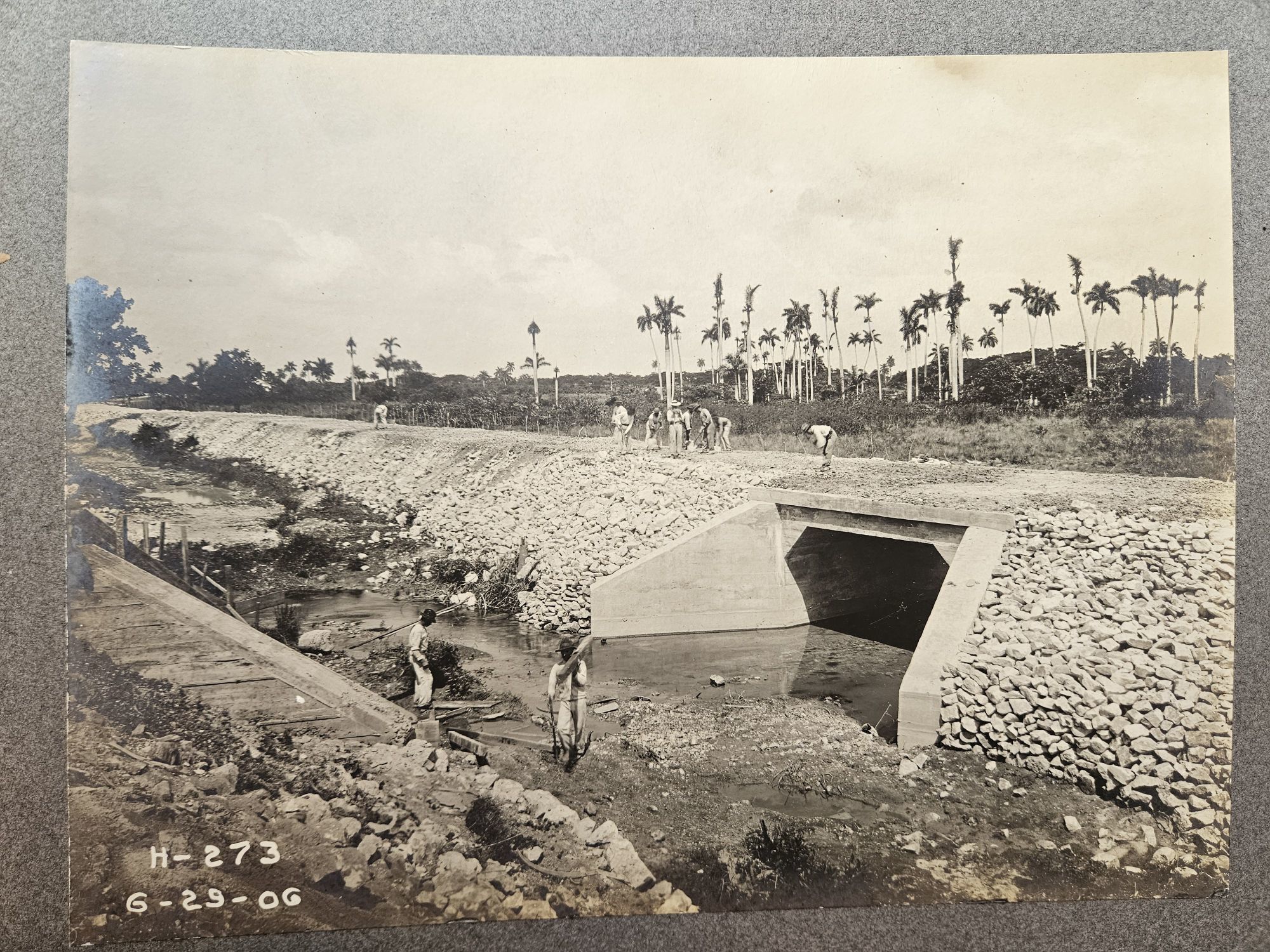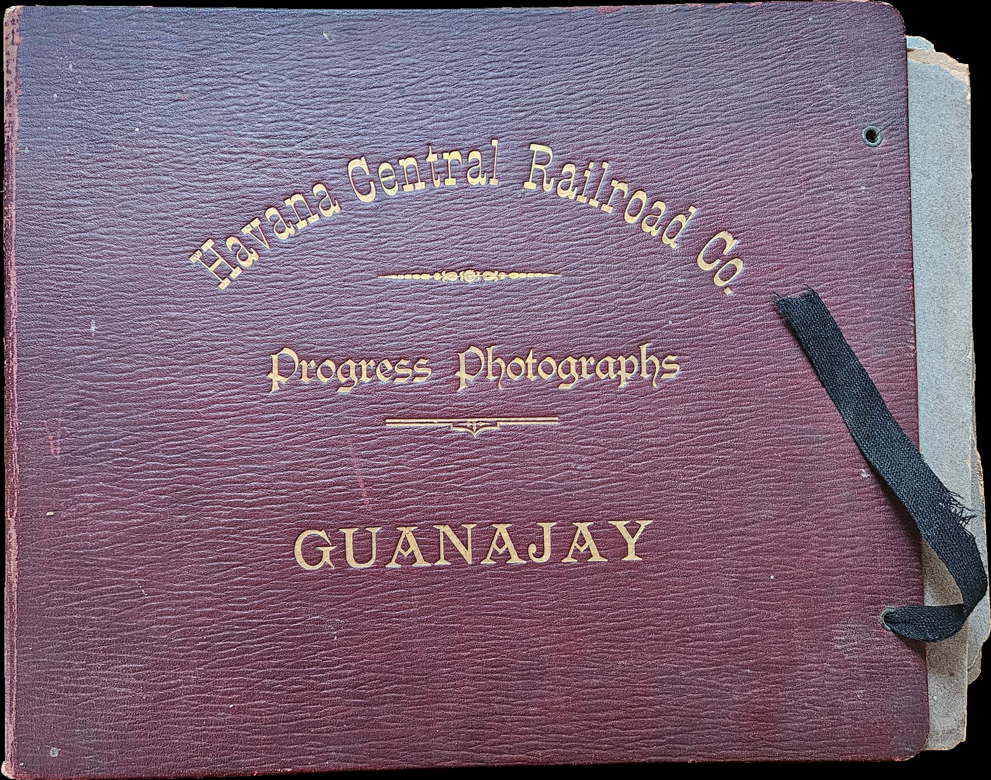 La Habana Province, Republic of Cuba, 1906. Twenty-two photographs measuring 7 ¼ x 9 ½ inches, mounted on heavy cardstock measuring 10 x 12 inches. Photos numbered and dated on negative. In album embossed with "Havana Central Railroad Co./ Progress Photographs/ GUANAJAY". Photos with fine contrast and some wear; mounts with minor damage, slightly warped, with some detached from binding. Overall excellent.. Havana Central Railroad Company was an American company formed in April 1905. It opened two electric tram lines—Havana to Guanajay in 1906 and Havana to Güines in 1907—before it was bought by the English company United Railways following the Panic of 1907. Offered here is a photo album showing the construction of the Guanajay line. The photographs show laborers, assisted by horse-drawn carts, digging culverts, laying tracks, and erecting bridges and buildings.