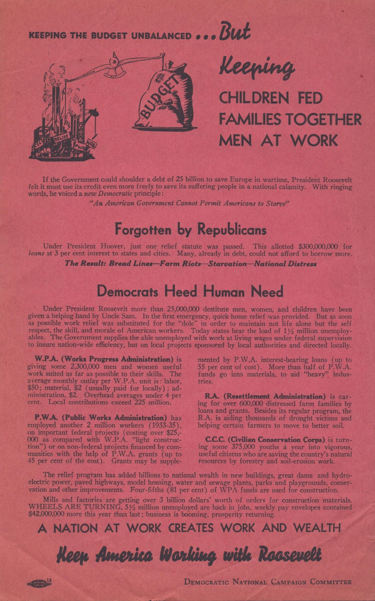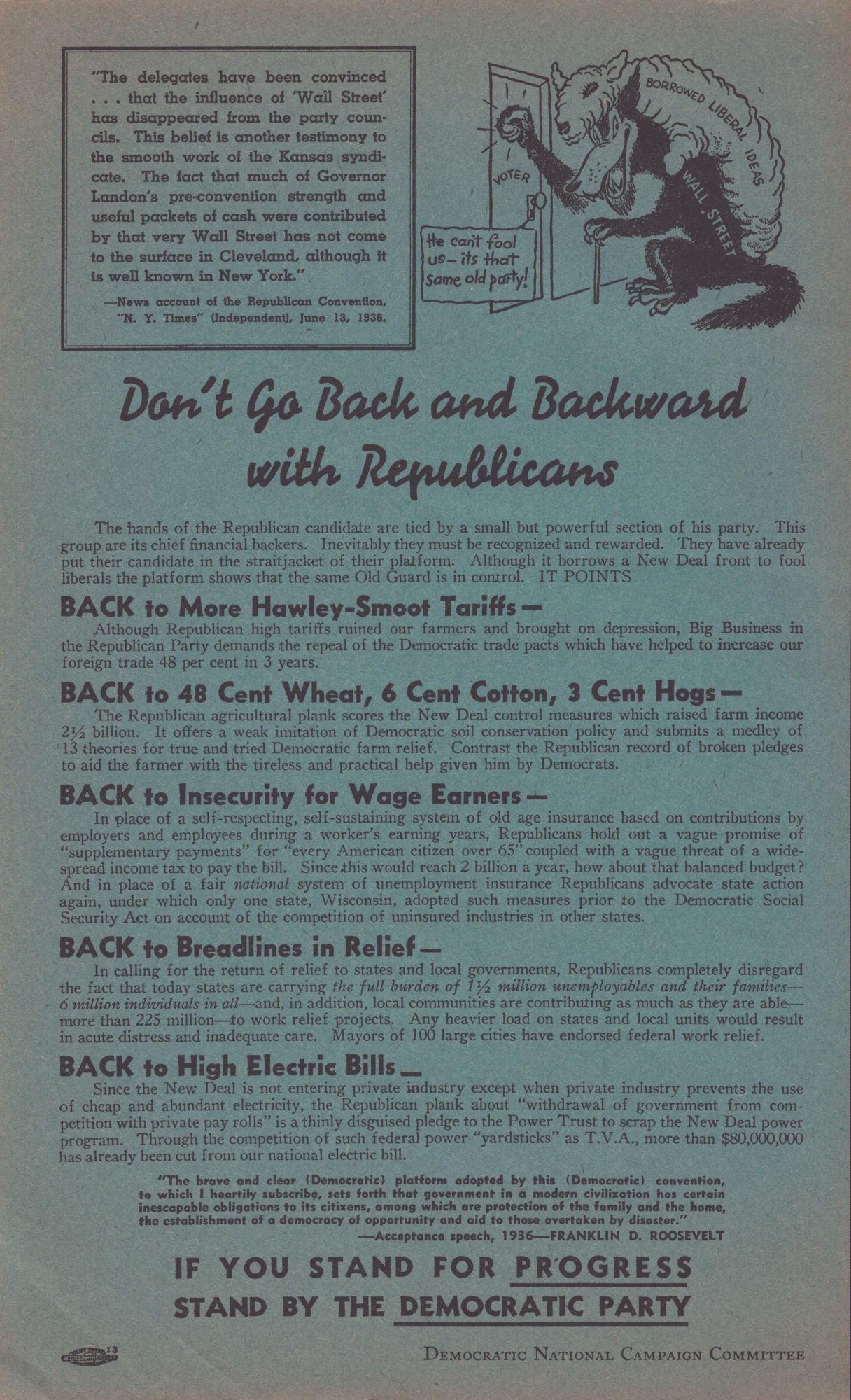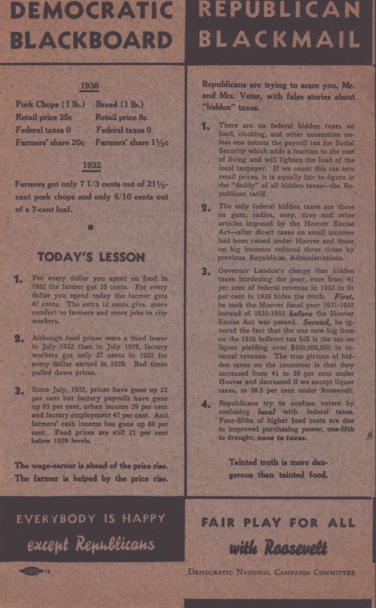 The broadsides are titled: "Keeping the Budget Unbalanced… But Keeping Children Fed / Families Together / Men at Work"; "Democratic Blackboard / Republican Blackmail"; "Trade is an Endless Chain. Farmers and Foreign Trade. From Us / To Us"; "Champions of Civil Service / Democratic Deeds Answer Republican Claims"; "Saved / More Than a Million Homes"; "'Let's Look at the Record' / Democratic Pledges and Performance"; "Roosevelt or Reaction? / Wager Earners - Your Vote is Your Answer"; "Don't Go Back and Backward with Republicans"; "Your Electric Bill, 1936"; "The Truth About Taxes"; "Our Wealth of Earth and Water"; "Farmers - Make Your Choice"; "Facts - Mr. Business Man"; "Through Tariff Walls / Higher, Higher They Climbed"; and "The Farmer Remembers Longer Than the Elephant".