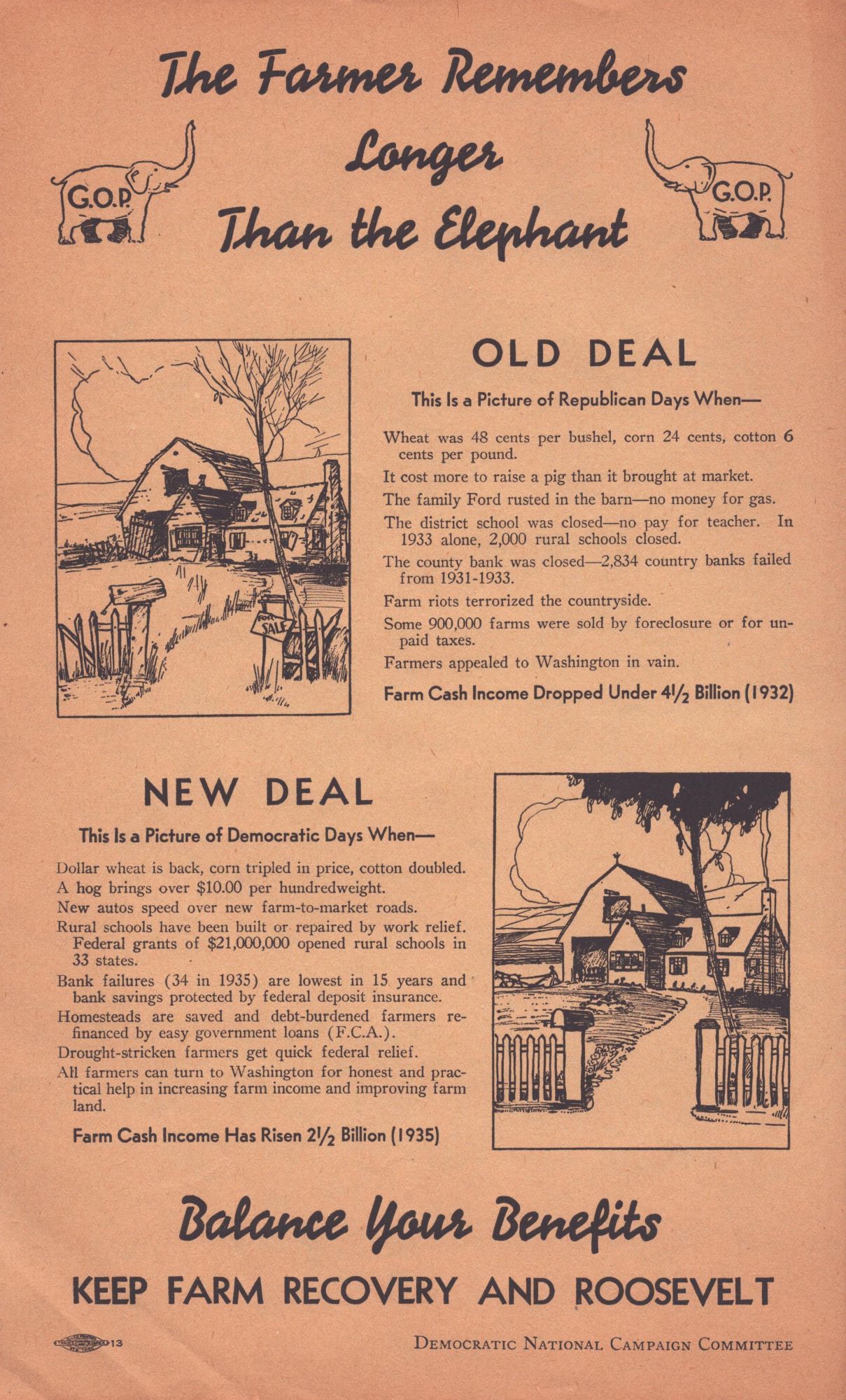 New York City: Allied Printing, 1936. Fifteen sheets of colored paper measuring approximately 7 ½ x 12 inches. Some marginal damage and wrinkling; overall excellent.. In 1936, President Franklin D. Roosevelt ran for reelection against Kansas governor Alf Landon. The country was in the midst of the Great Depression, and during Roosevelt's first term he had enacted a number of sweeping reforms, collectively known as the New Deal, to combat it. Offered here are fifteen campaigning broadsides for Roosevelt's reelection. They focus on his "alphabet agencies"—the AAA, TVA, CCC, and so on—and contrast his presidency with that of his predecessor, Herbert Hoover. In particular, they highlight the disastrous Smoot-Hawley Tariff, which was purported to help farmers and manufacturers but instead led to retaliatory tariffs and worsened economic conditions, and point to higher prices and wages for farm workers under the New Deal. They describe how New Deal policies lowered electricity prices, provided relief for the unemployed and social security for the elderly, refinanced home loans and built low-cost housing, fought soil erosion, and much more. Though quite wordy, most are illustrated and feature slogans like "Compare Your New Deal with Your Old Deal". Roosevelt would win the election in a landslide, though it would take the outbreak of World War II to fully bring the US out of the economic crisis.
