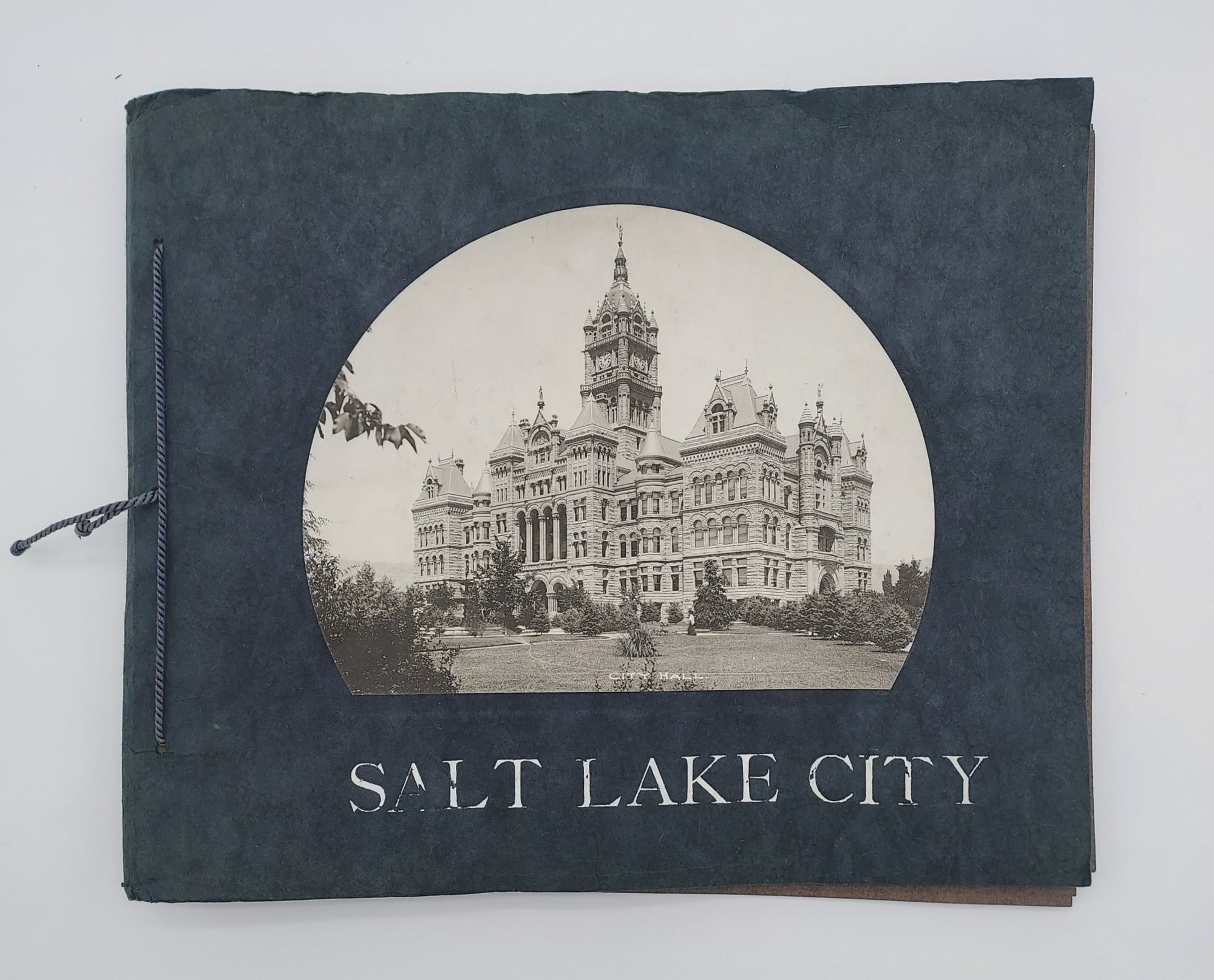 Brooklyn, NY: Albertype Co, 1904. Very Good. View book with albertypes. Oblong quarto [24 cm x 29 cm] Black wraps with an illustrated paper label, depicting City Hall, on the front wrap, and a string-tie binding. Edges of wraps lightly creased. Very minor fading to the edges of the rear wrap. Title on front wrap a bit rubbed. The Albertype Company was founded by the Wittemann brothers in the late 1880s as a postcard and view book publishing company. This view book contains a fold-out panorama of Salt Lake City. Other images include "Main Street, Looking South," "Main Entrance- Salt Lake Security and Trust Co.," "Knutsford Hotel," "Elks Club," "Lafayette School," "Saltair," "Jewish Synagogue," "Mormon Temple and Tabernacle," "Groves Hospital," "Lehi Sugar Factory," and "Views of Lagoon.