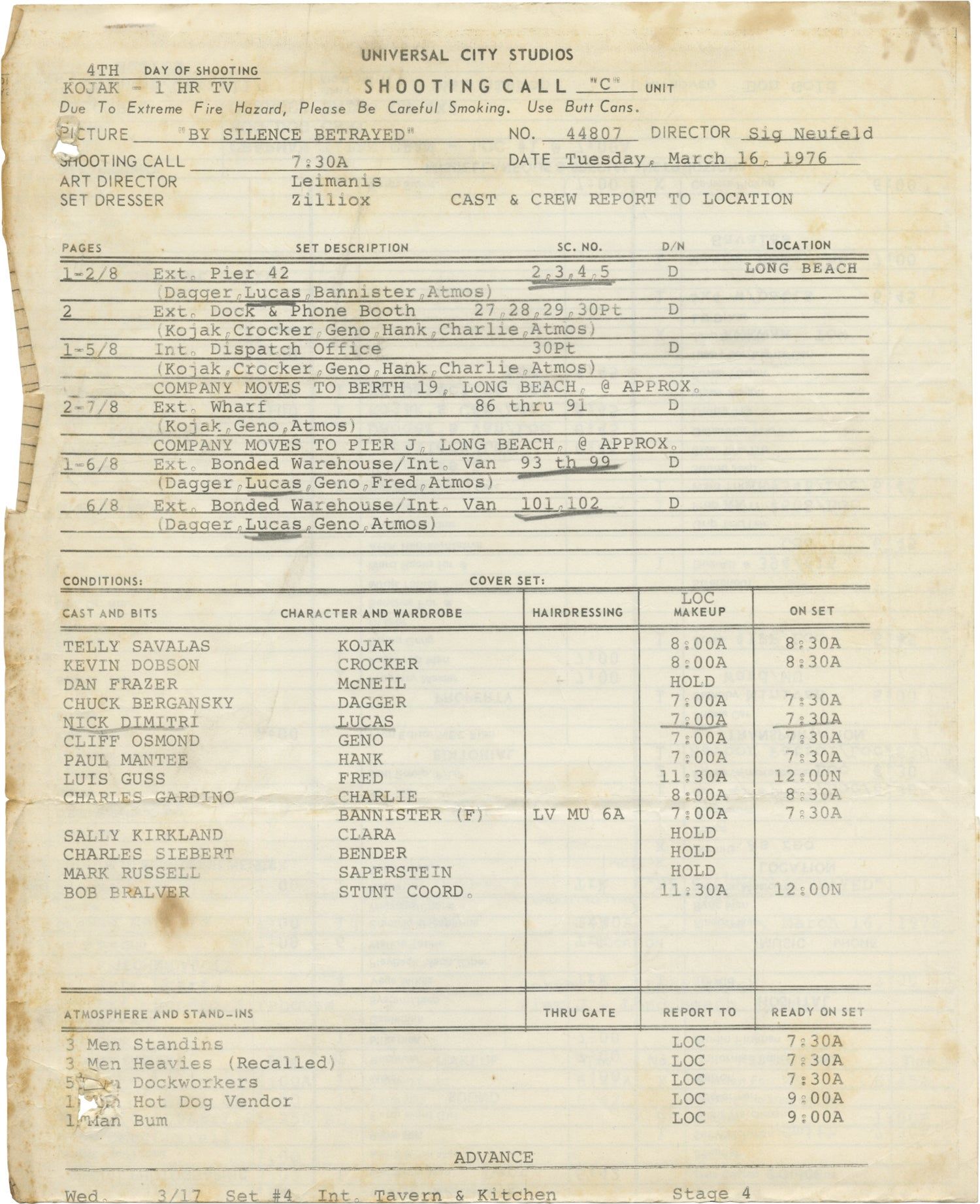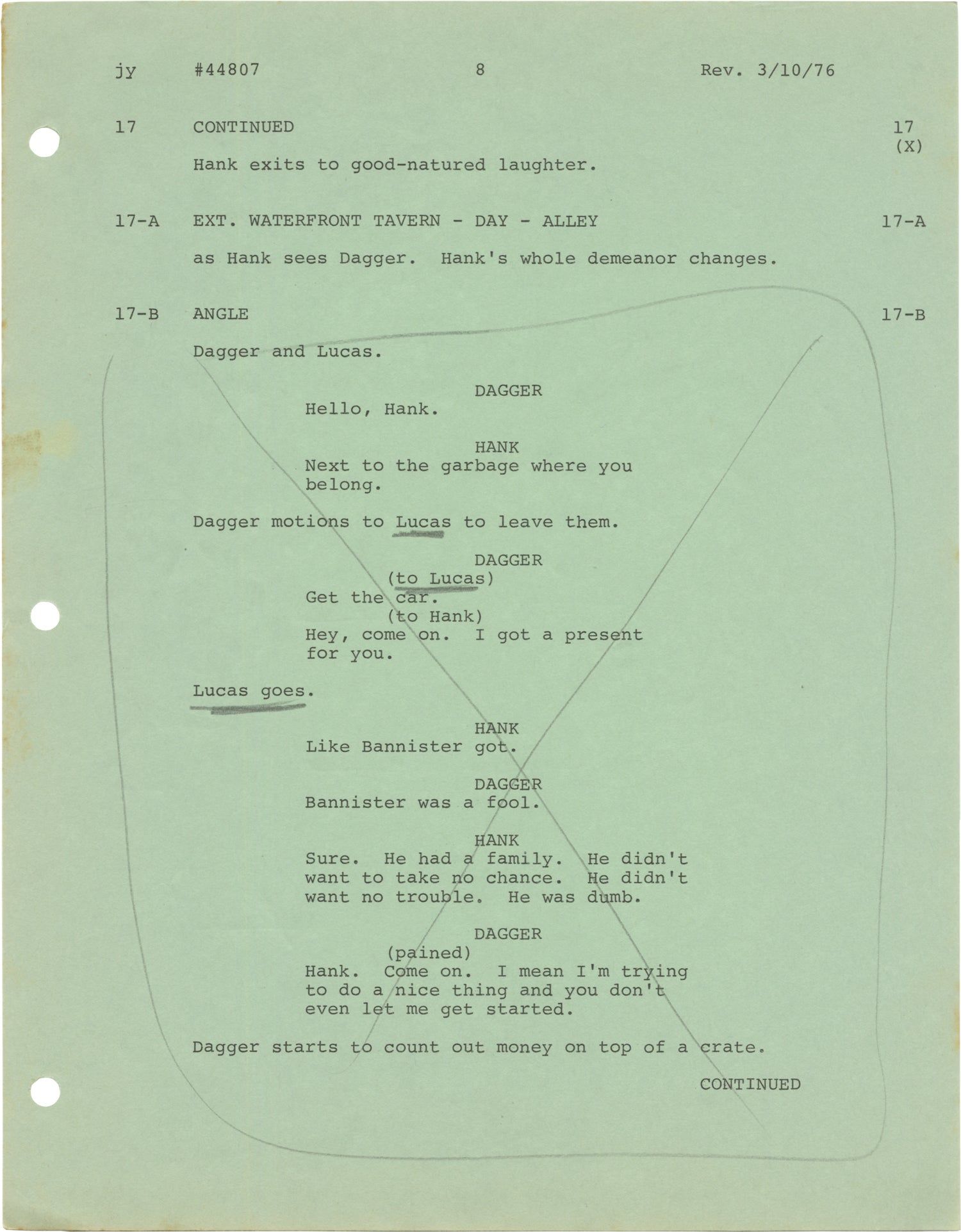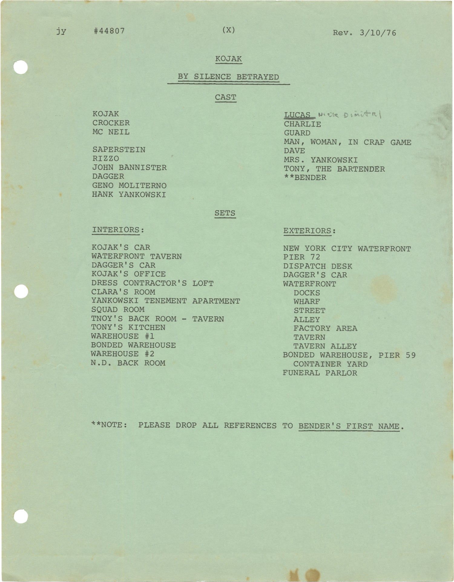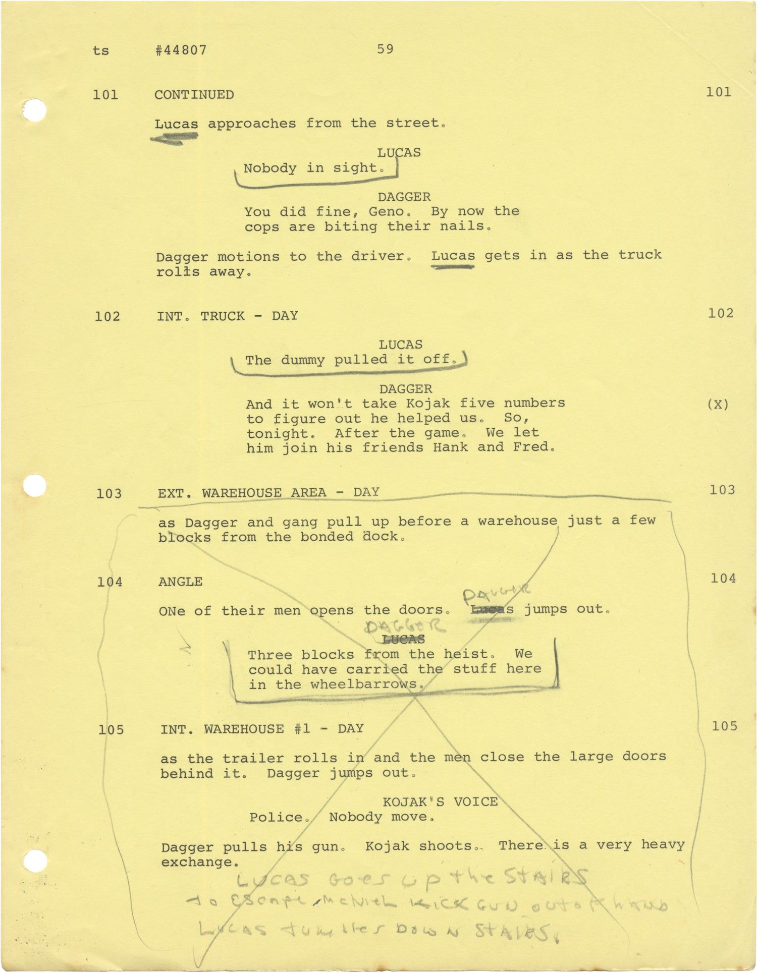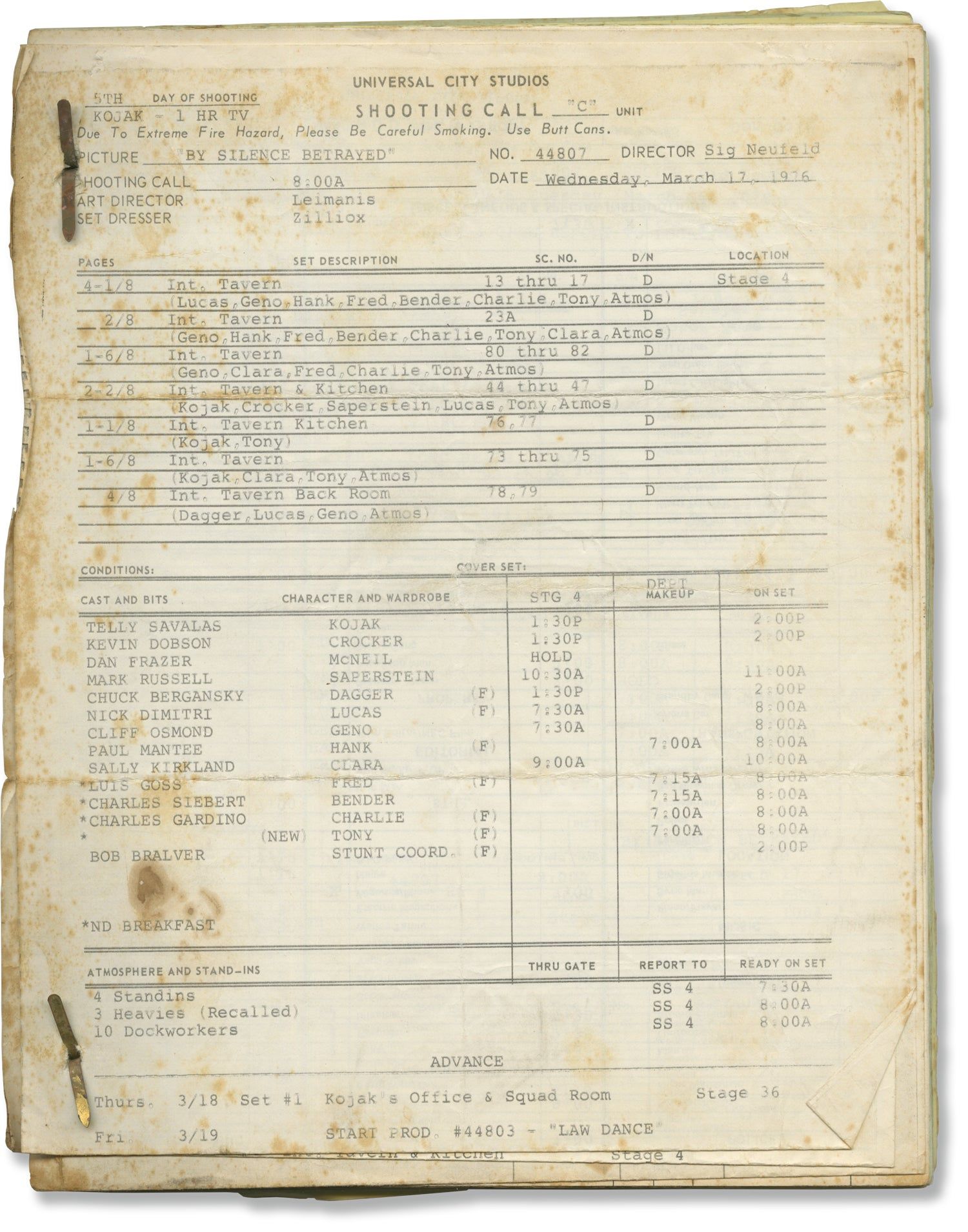 Copy belonging to actor Nick Dimitri, with the pencil annotation of his name on the title sheet next to his character "Lucas" (credited as "Dagger's Associate"), with manuscript pencil annotations throughout. Bound in, preceding the script are three "Shooting Call" sheets (with an additional "Shooting Call" sheet bound in following the title page), with pencil annotations underlining Dimitri's name and character name on two of the sheets, and a thirteen page "Shooting Schedule," dated March 12, 1976.