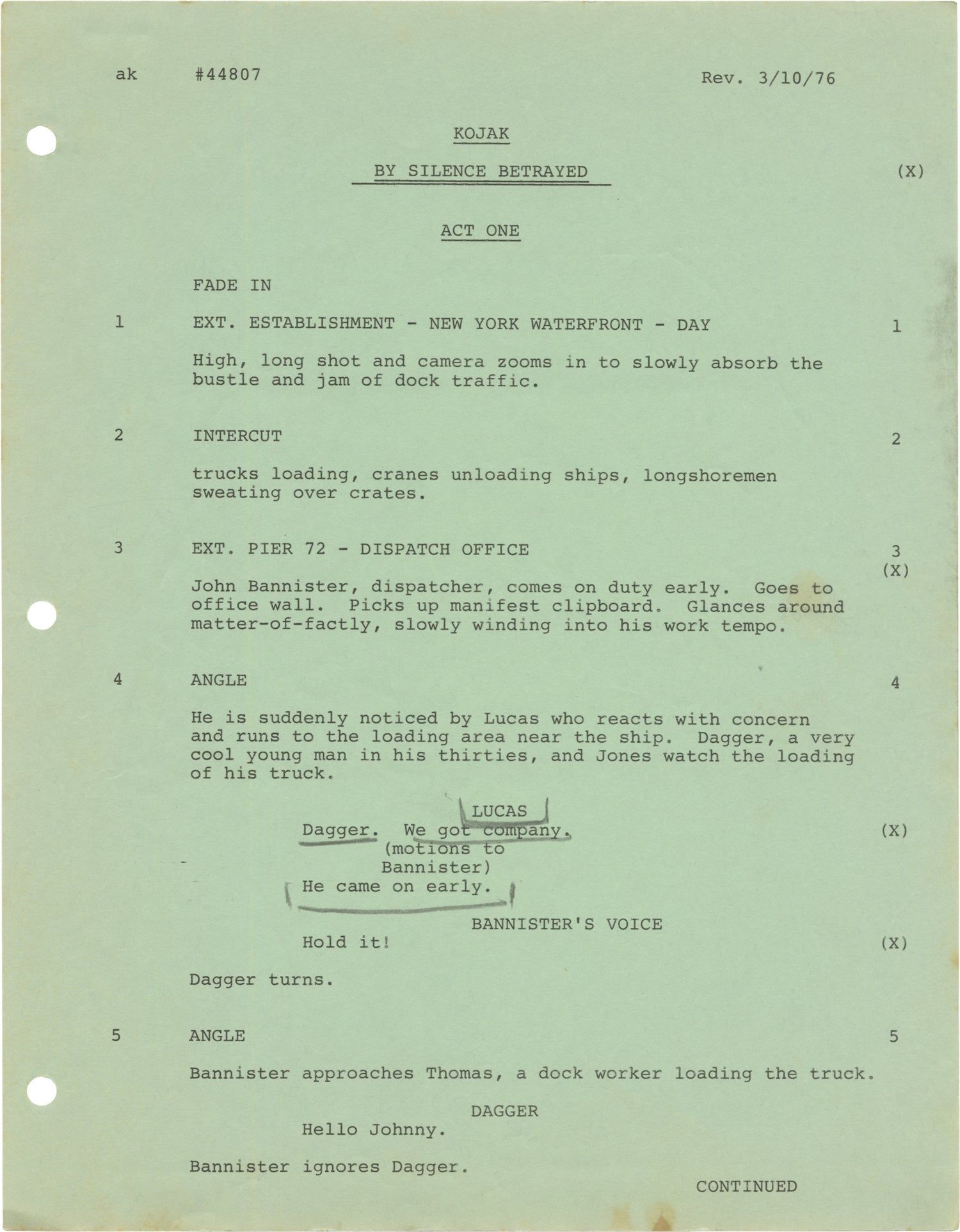 Universal City: Universal Studios, 1976. Draft script for the eighth episode of the fourth season of the CBS television series, printed on yellow leaves, which aired on November 14, 1976.