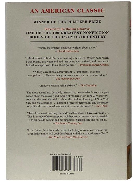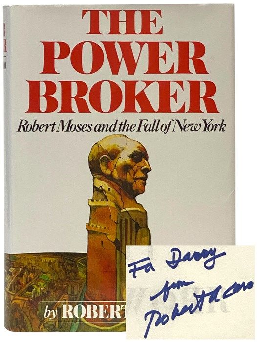 New York: Alfred A. Knopf, 1974. Reprint. Hard Cover. Near Fine/Fine. 6x2x9. Signed by author. Reprint. Inscribed and signed by author on half-title page ('For Danny from Robert Caro'). An exceptional copy. 1974 Hard Cover. 1246, xxxiv pp. One of the most acclaimed books of our time, winner of both the Pulitzer and the Francis Parkman prizes, The Power Broker tells the hidden story behind the shaping (and mis-shaping) of twentieth-century New York (city and state) and makes public what few have known: that Robert Moses was, for almost half a century, the single most powerful man of our time in New York, the shaper not only of the city's politics but of its physical structure and the problems of urban decline that plague us today. In revealing how Moses did it--how he developed his public authorities into a political machine that was virtually a fourth branch of government, one that could bring to their knees Governors and Mayors (from La Guardia to Lindsay) by mobilizing banks, contractors, labor unions, insurance firms, even the press and the Church, into an irresistible economic force--Robert Caro reveals how power works in all the cities of the United States. Moses built an empire and lived like an emperor. He personally conceived and completed public works costing 27 billion dollars--the greatest builder America (and probably the world) has ever known. Without ever having been elected to office, he dominated the men who were--even his most bitter enemy, Franklin D. Roosevelt, could not control him--until he finally encountered, in Nelson Rockefeller, the only man whose power (and ruthlessness in wielding it) equalled his own.