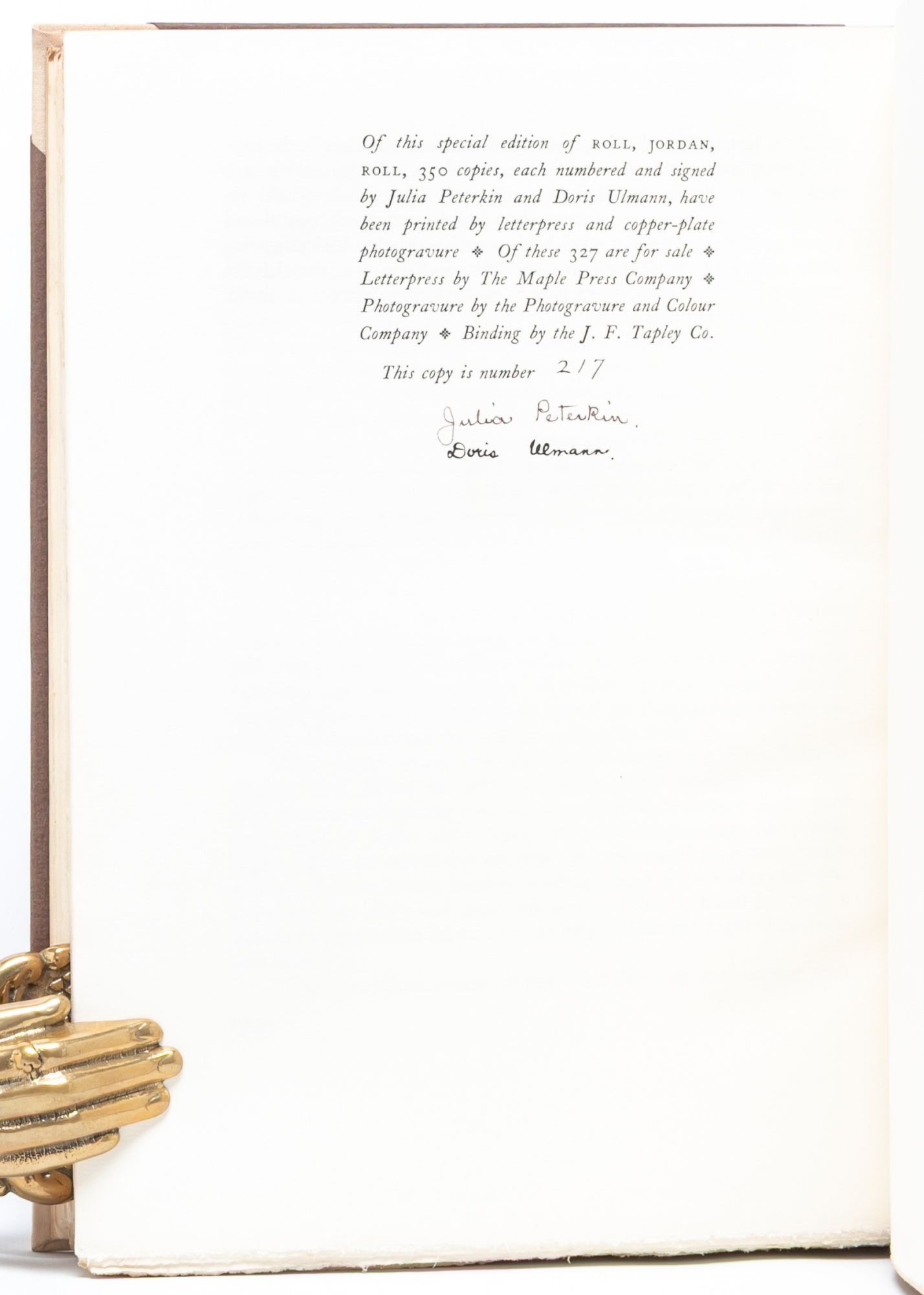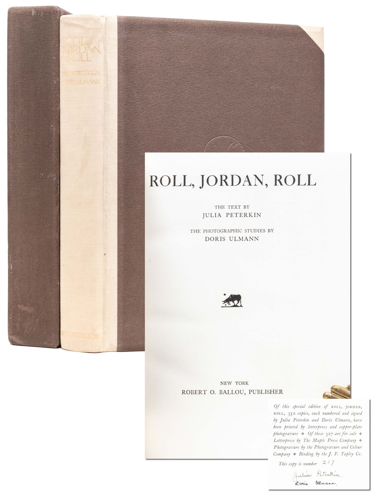 New York: Robert O. Ballou, 1933. First edition. Fine. One of 350 copies (327 for sale) signed by Julia Peterkin and Doris Ullman, with an additional photogravure signed by Ullman. 341 pp. Complete, with all ninety copperplate photogravures and accompanying tissue guards. Publisher's half buff cloth over blindstamped brown paper boards. Spine titled in gilt. Slight bubbling to cloth at spine. Some faint scuffing to boards. With the publisher's brown paper slipcase, somewhat scuffed. A Fine copy in the Very Good+ slipcase.