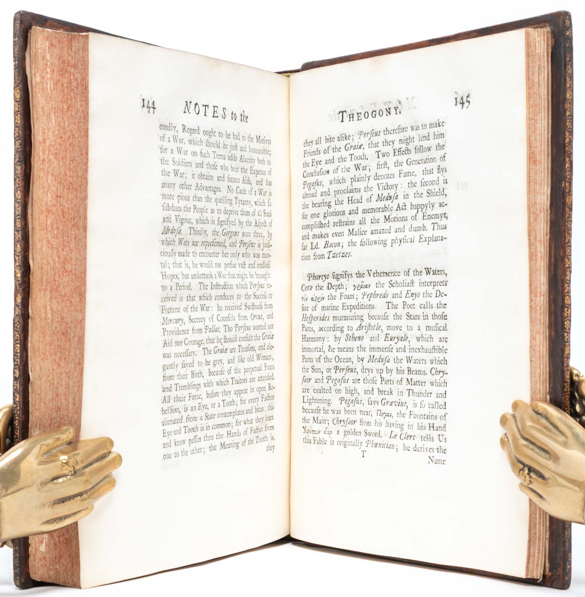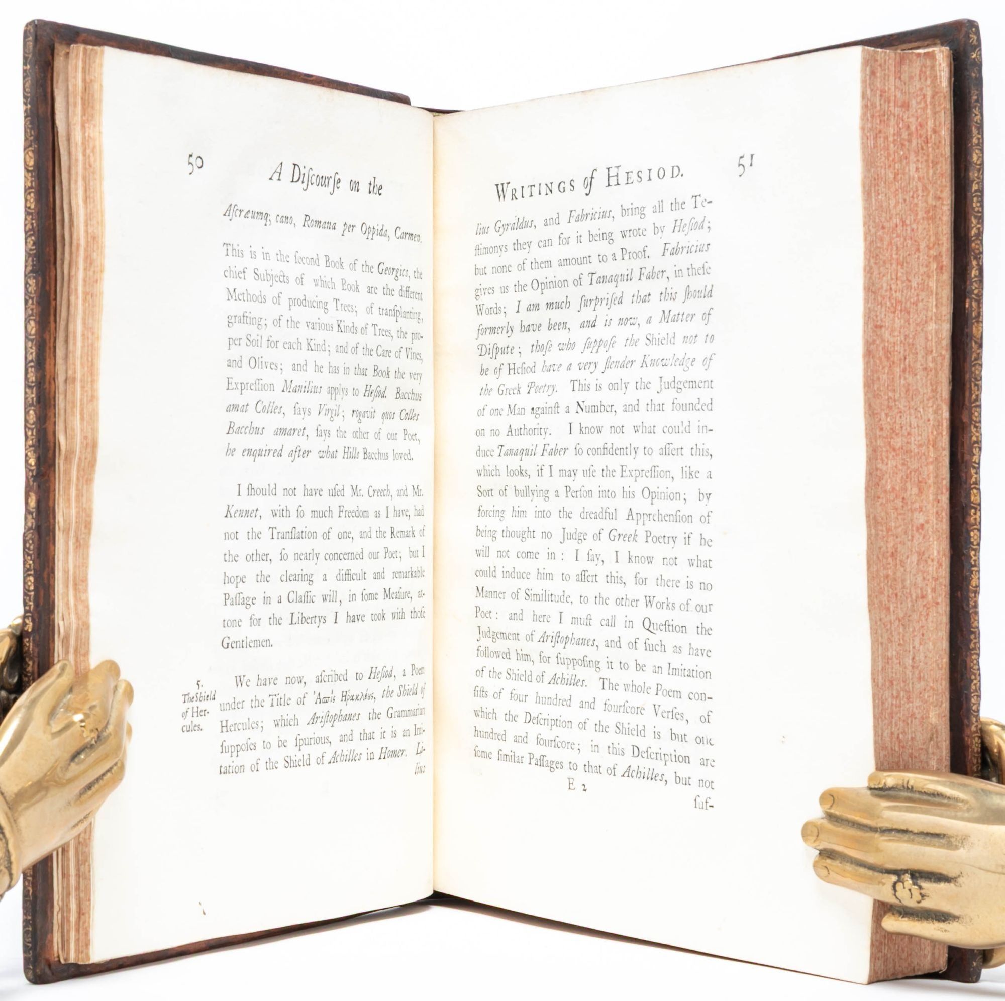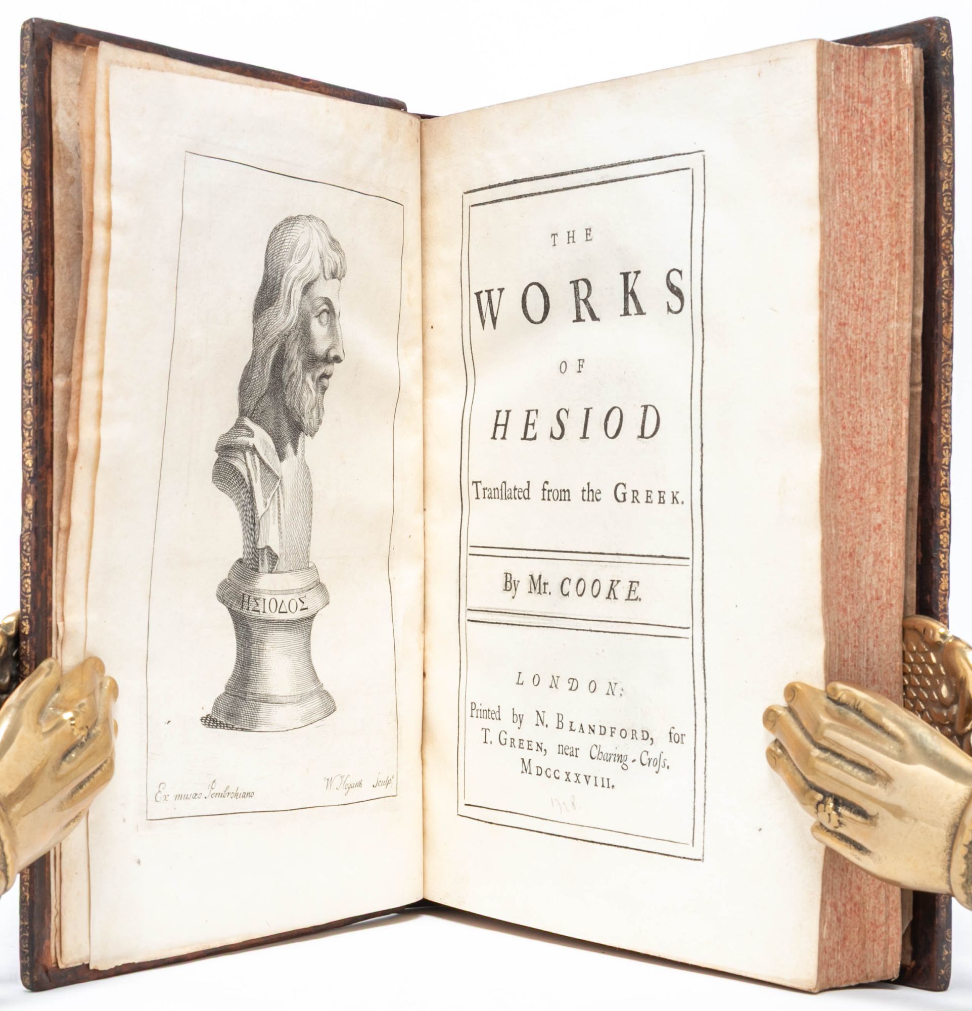 Thomas Cooke's translation of Hesiod, which includes the first English translation of Theogony and the second translation of Works and Days, remained the standard until Sir Charles A. Elton's 1815 edition. Cooke (1703 - 1756) was a prolific translator who is now best remembered for this translation (for which he earned the nickname "Hesiod Cooke") and for featuring in Pope's Dunciad. He also produced translations of Cicero, Virgil, Plautus, and Terence, as well as an edition of Andrew Marvell's poetry. Near Fine.