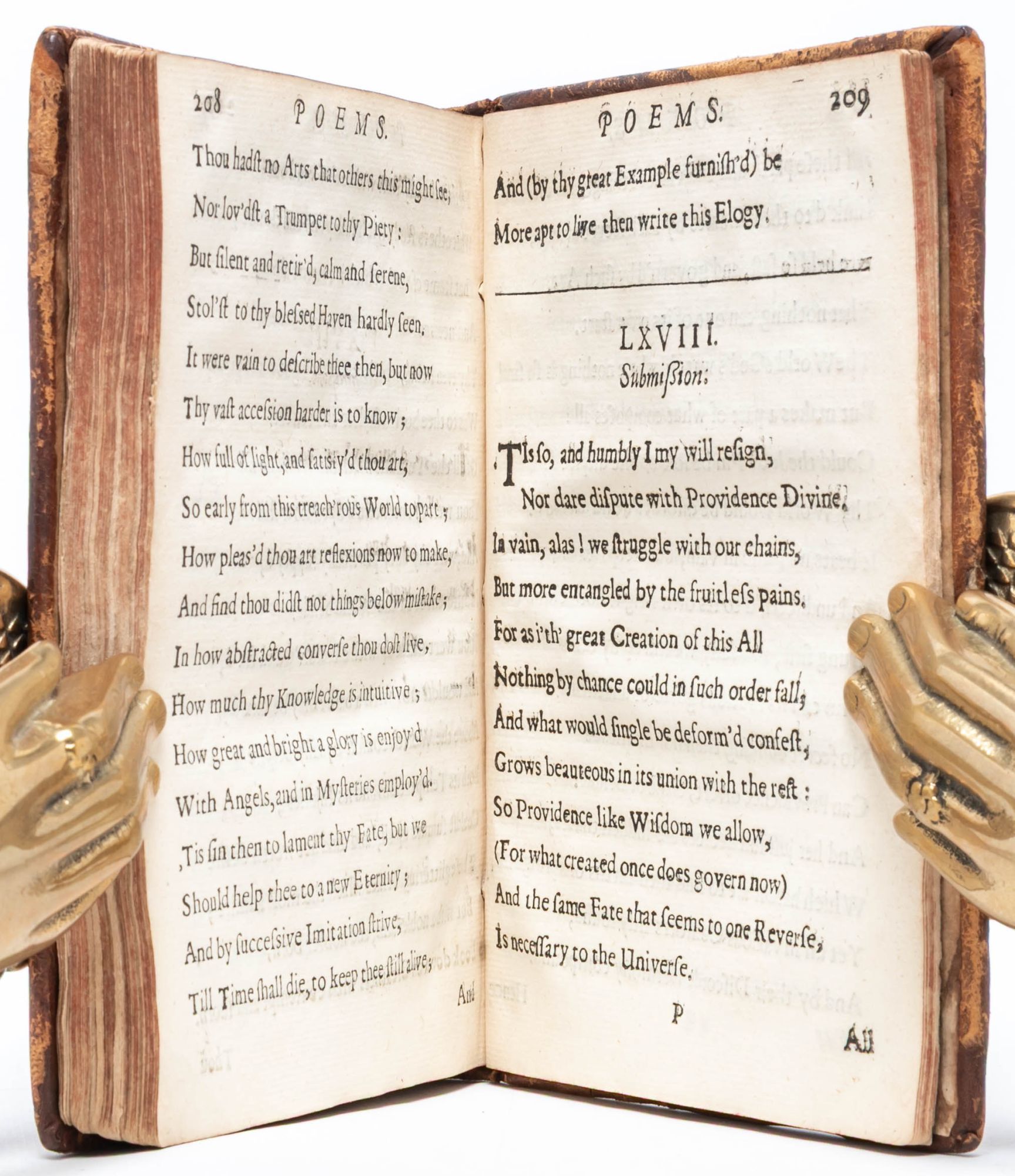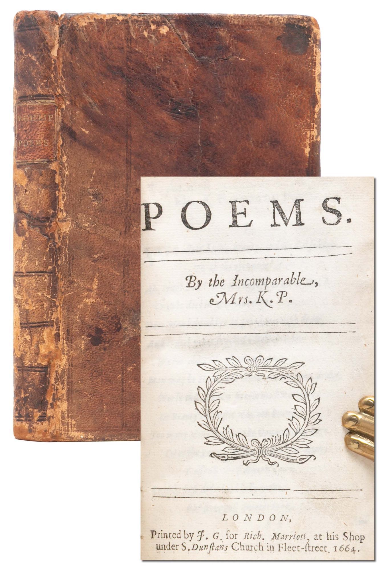 First edition of the collected poems of the Anglo-Welsh royalist, known to her friends and admirers as the "Matchless Orinda" and the "English Sappho", a nod her intense poetic celebrations of female love and companionship. This controversial unauthorized edition was published in January 1664 and withdrawn by the publisher the same month. "Primarily a manuscript poet, Philips (1631/2-1664) had established an extensive coterie of readers and writers among her Welsh and London contacts during the 1650s [known as the Society of Friendship]. She became widely known for her innovative use of Donnean poetics to express passionate female friendship, her occasional verses on private friends and public figures, and her moral and political acuity" (Losocco). Her formal commentary on public affairs covered the execution of Charles I, the Restoration of Charles II, and profiles of numerous female members of the royal family. Although Philips never compared herself to Sappho, other writers often did, partly as a result of the intimate poems addressed from Orinda to Lucasia and Rosania, the pseudo-classical names of fellow Society of Friendship members Anne Owen and Mary Aubrey. Although her poems circulated in manuscript among a large and influential network, Philips wrote that she "never writ any line in my life with an intention to have it printed". She was outraged by this pirate edition; the publisher, Richard Marriott, expressed his regret in the London Intelligencer and promised to cease selling the book. Despite Philips's misgivings, the text of the 1664 Poems closely follows that of the manuscripts she circulated and differs only slightly from the 1667 authorized edition, which Philips began preparing but did not live to see through the press. Philips's poetry has had many notable admirers over the centuries and has enjoyed renewed scholarly interest in the last 40 years. John Dryden claimed to be a distant relation, writing that Philips was one "to whom I had the Honour to be related, and also to be known". John Keats, over a century later, celebrated Philips in a letter to John Hamilton Reynolds, describing how he was "gladdened in the extreme on opening the other day a book of poetry written by one beautiful Mrs. Philips", copying out her poem "To Mrs. M. A. at Parting" and praising the "most delicate fancy" of her work. The present copy includes the "Imprimatur" leaf A1 and the errata and blank leaves Q7-8 bound as printed; in some copies, these leaves are bound at the rear after the final poem "Upon Mr. Abraham Cowley's Retirement".