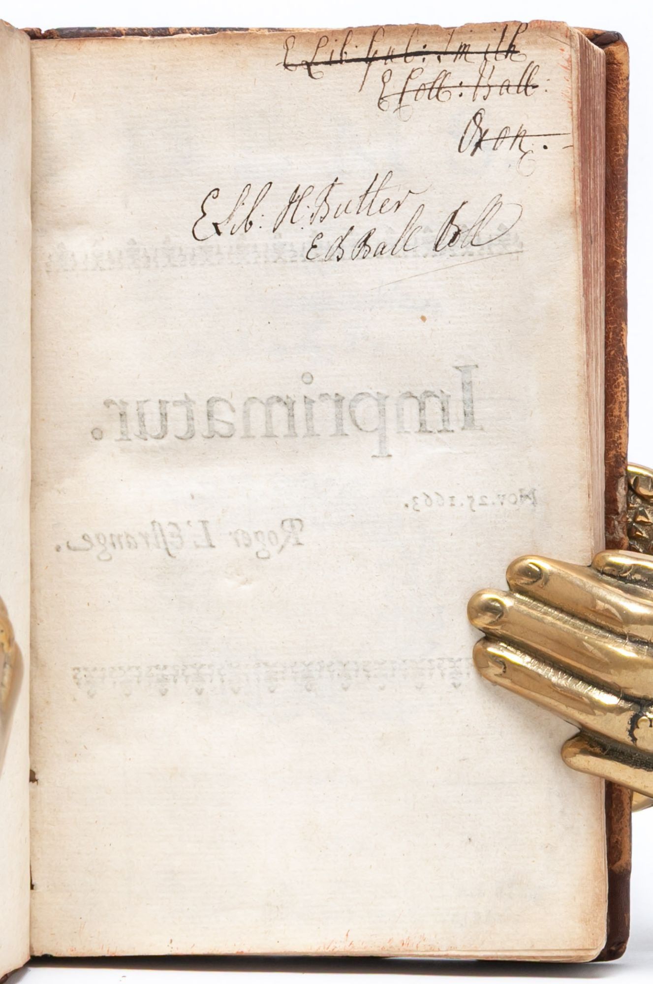 London: Printed by J.G. for Rich. Marriott, 1664. First edition. Very Good. Small octavo (168 x 112 mm): A-Q8 R4; 130 leaves, pp. [xvi], 242, [2]. Contemporary English blind-ruled sheep, 18th-century brown morocco label. Woodcut wreath device to title, woodcut initial to B1. Early ownership inscriptions of William Smith (struck through) and H. Butler, both of Balliol College, Oxford, to A1r; book label of William A. Strutz (1934-2024) to front pastedown. A few abrasions and spots of wear to sheep, front free endpaper partly excised, occasional small stains and light finger-soiling to contents. A very good copy.