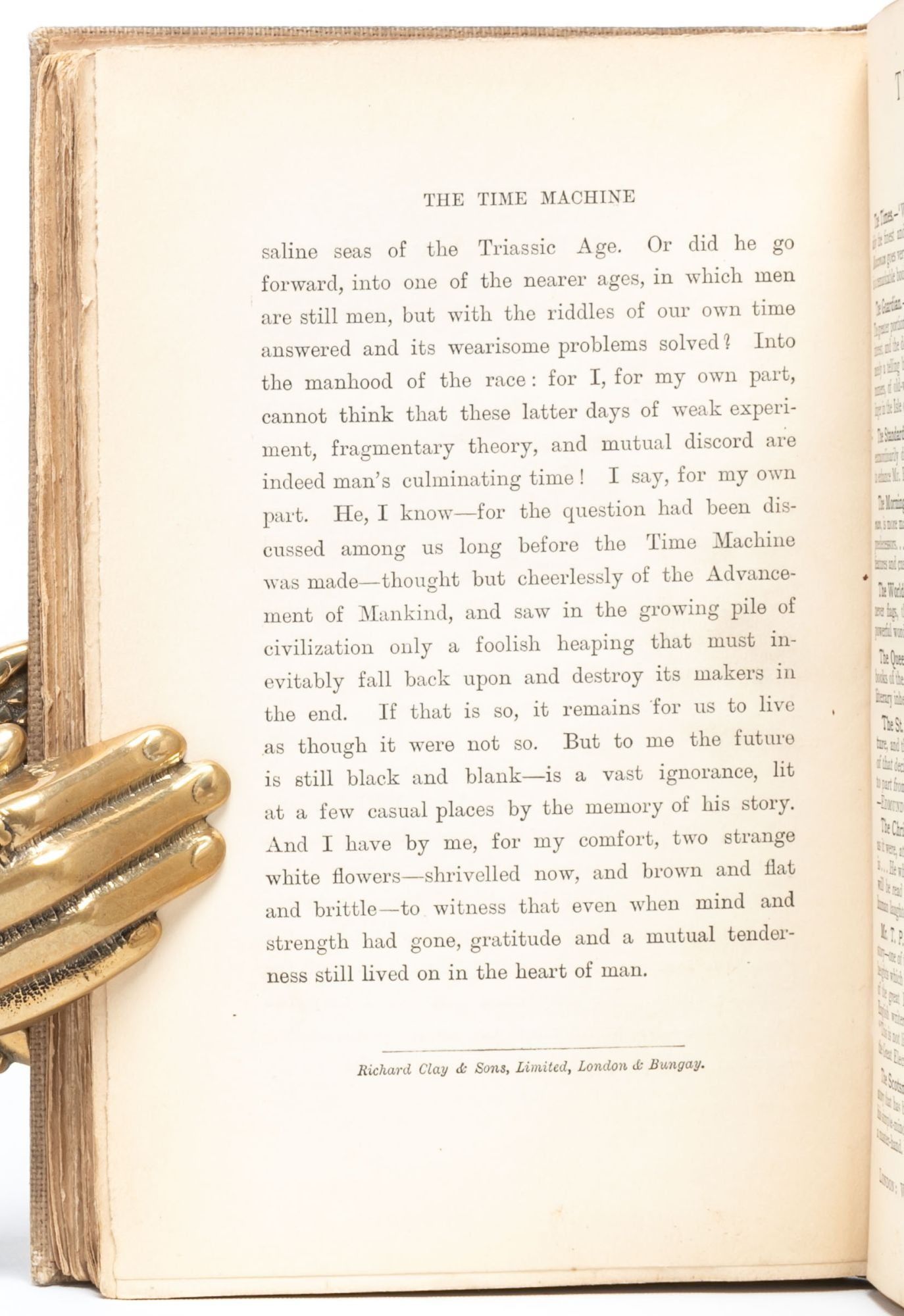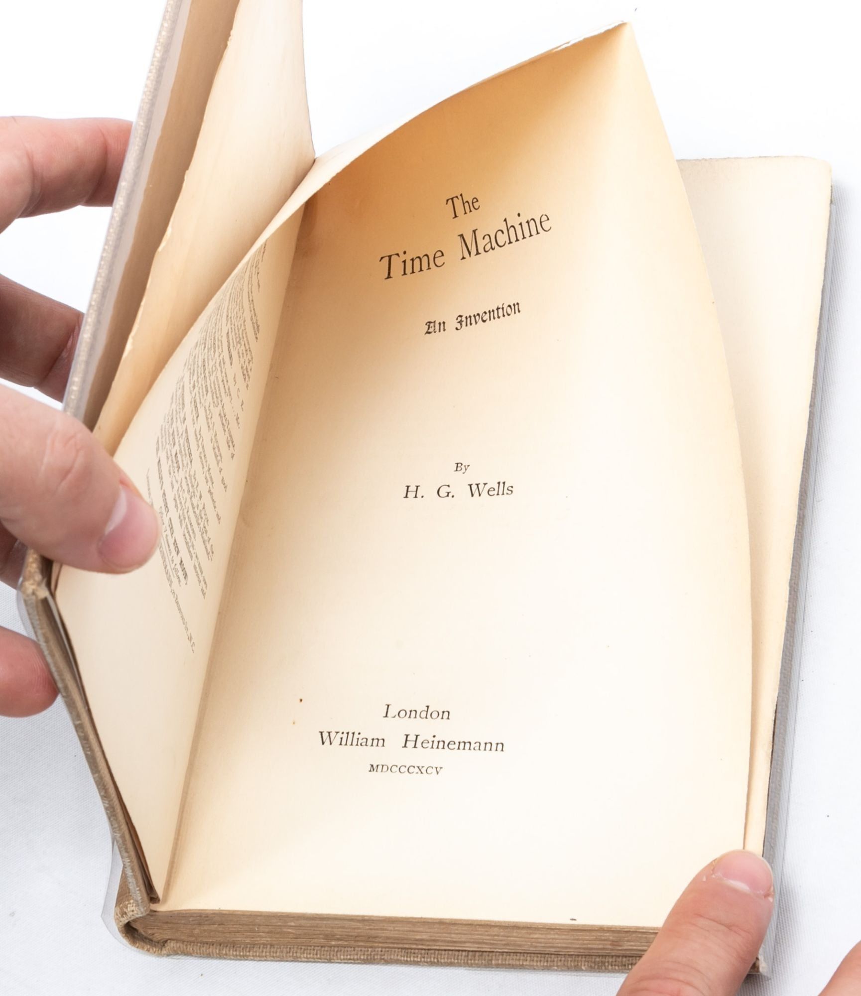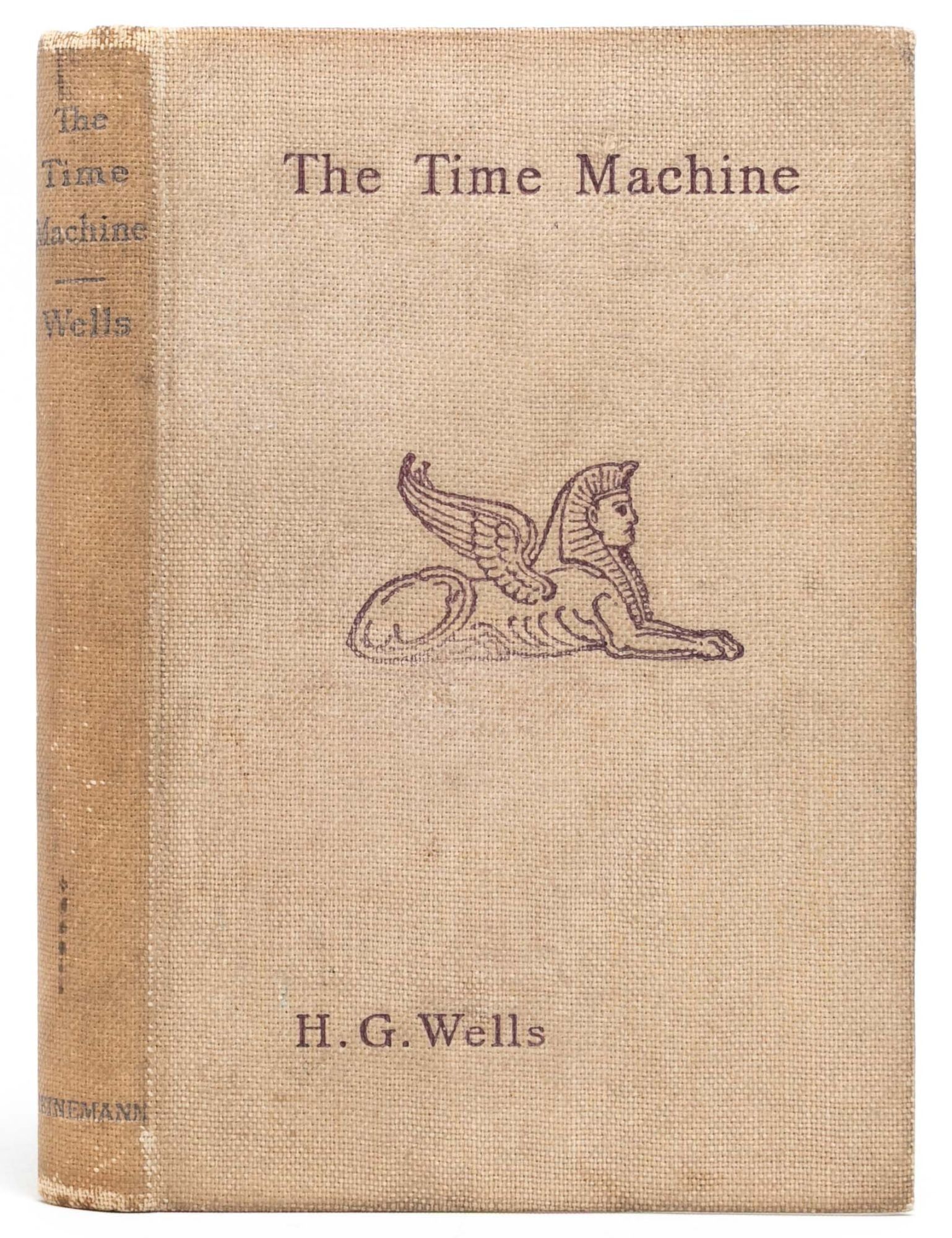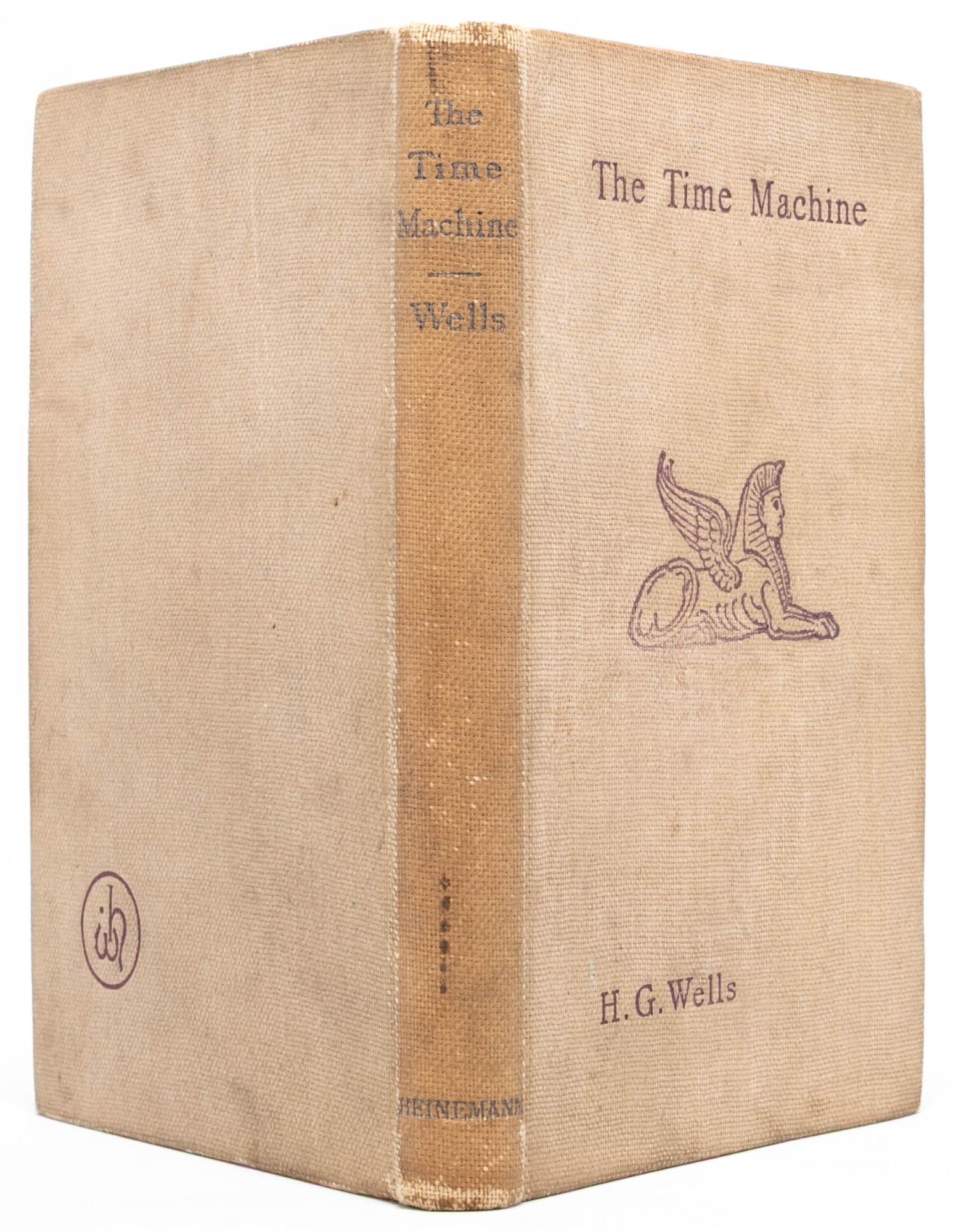 London: William Heinemann, 1895. First U.K. edition. Very Good +. First issue, with the 16 pp. catalogue in the rear starting with "The Manxman." Publisher's tan buckram stamped in purple, a bit faded. Top edge and fore-edge untrimmed, bottom edge rough trimmed. Early twentieth century bookplates to upper endpapers. Offsetting to flyleaves but otherwise clean throughout. Partially unopened. Edges untrimmed. A Very Good+ copy of H.G. Wells' iconic and influential time travel novel.
