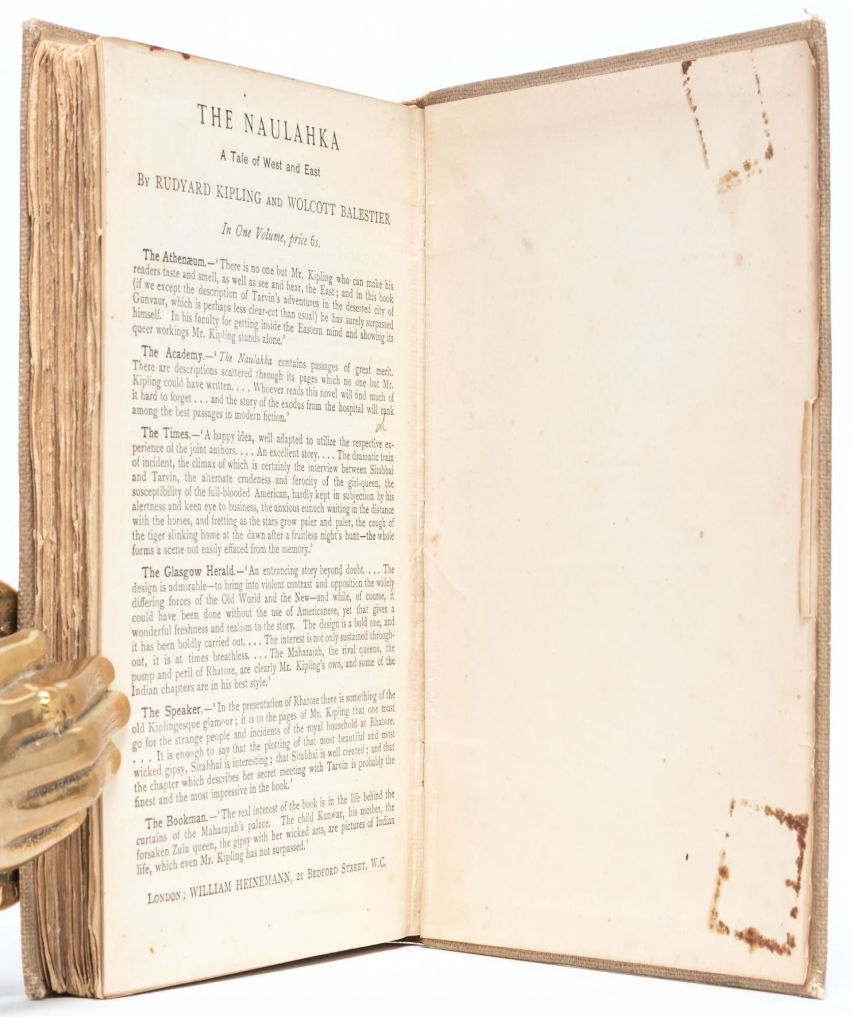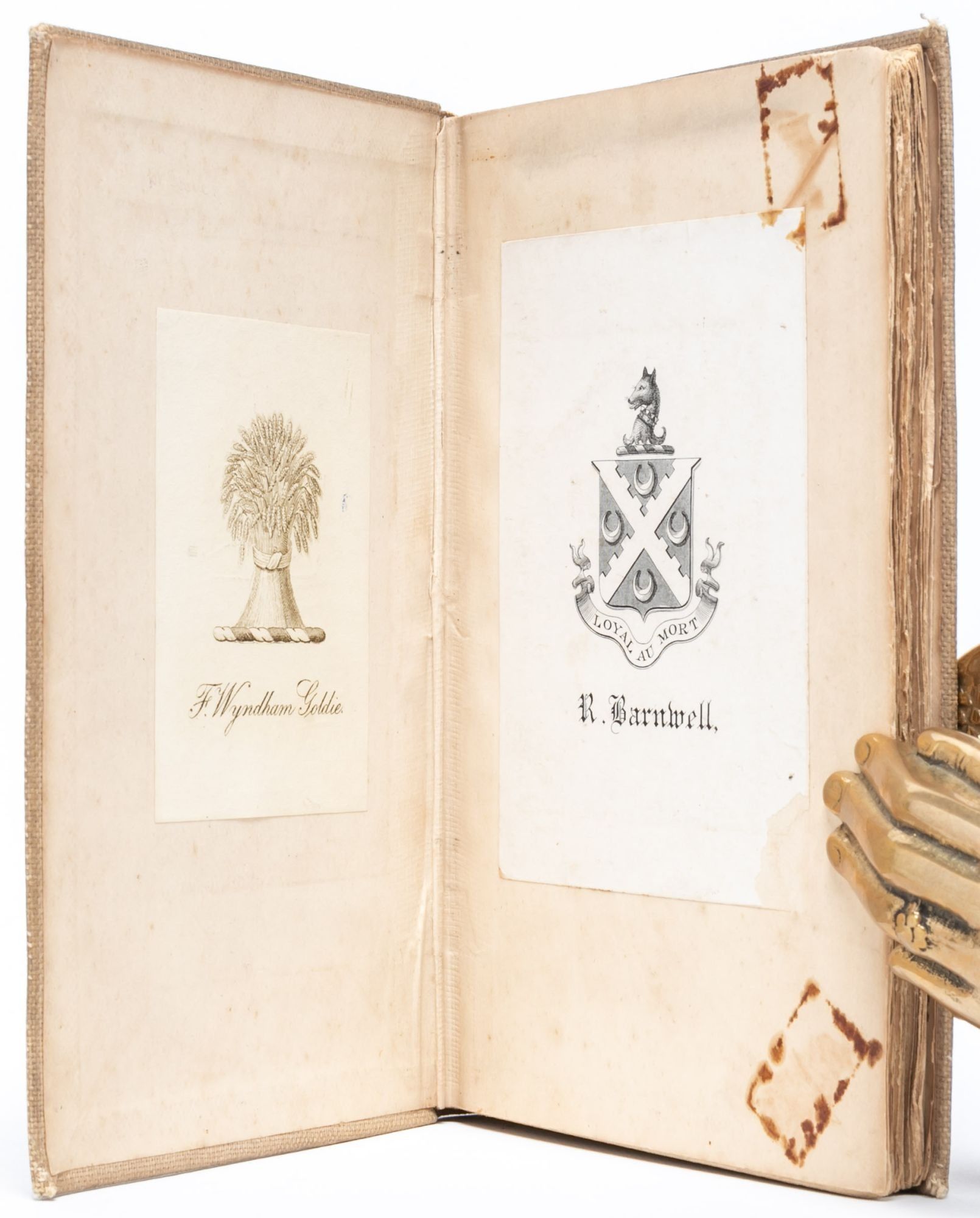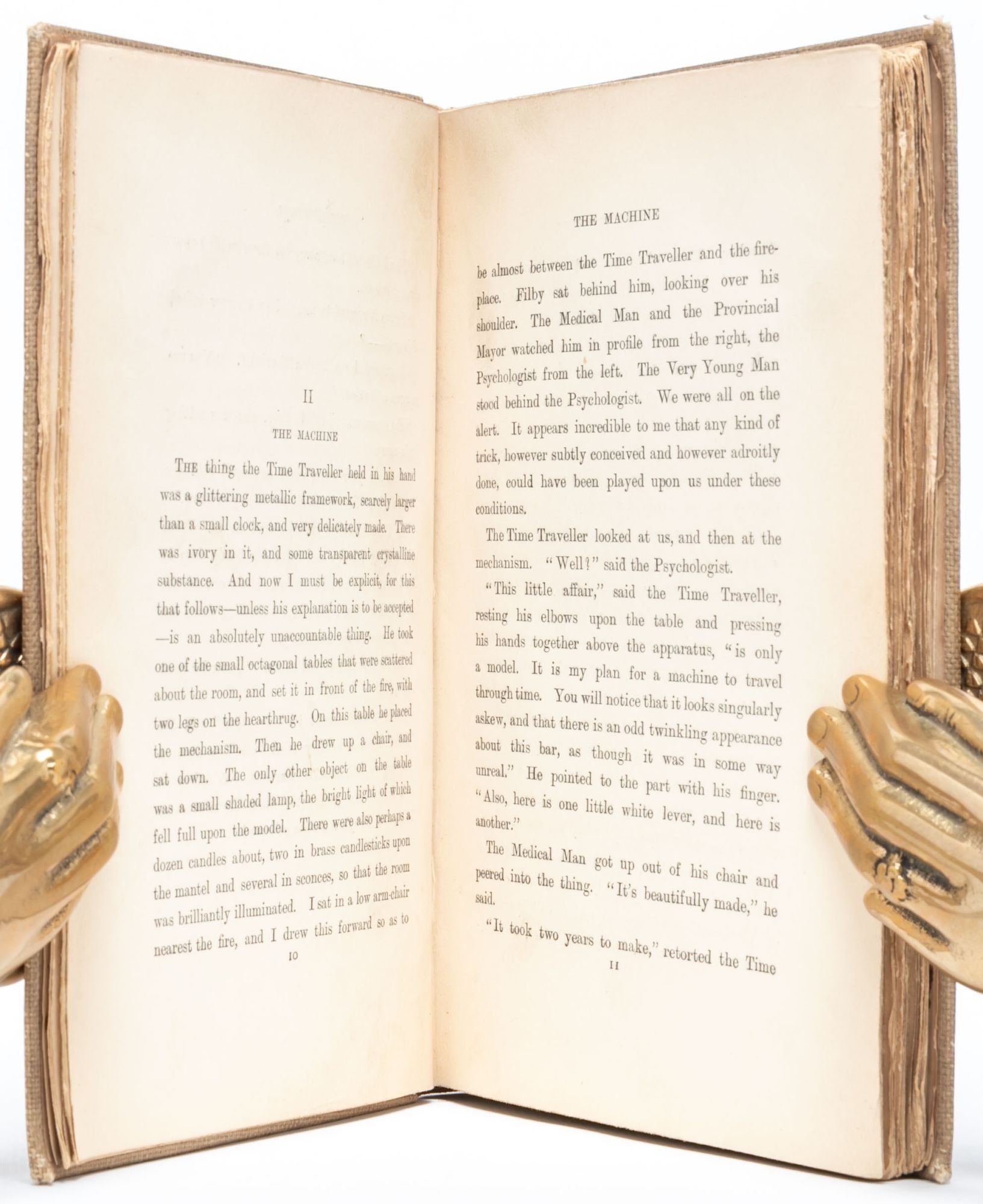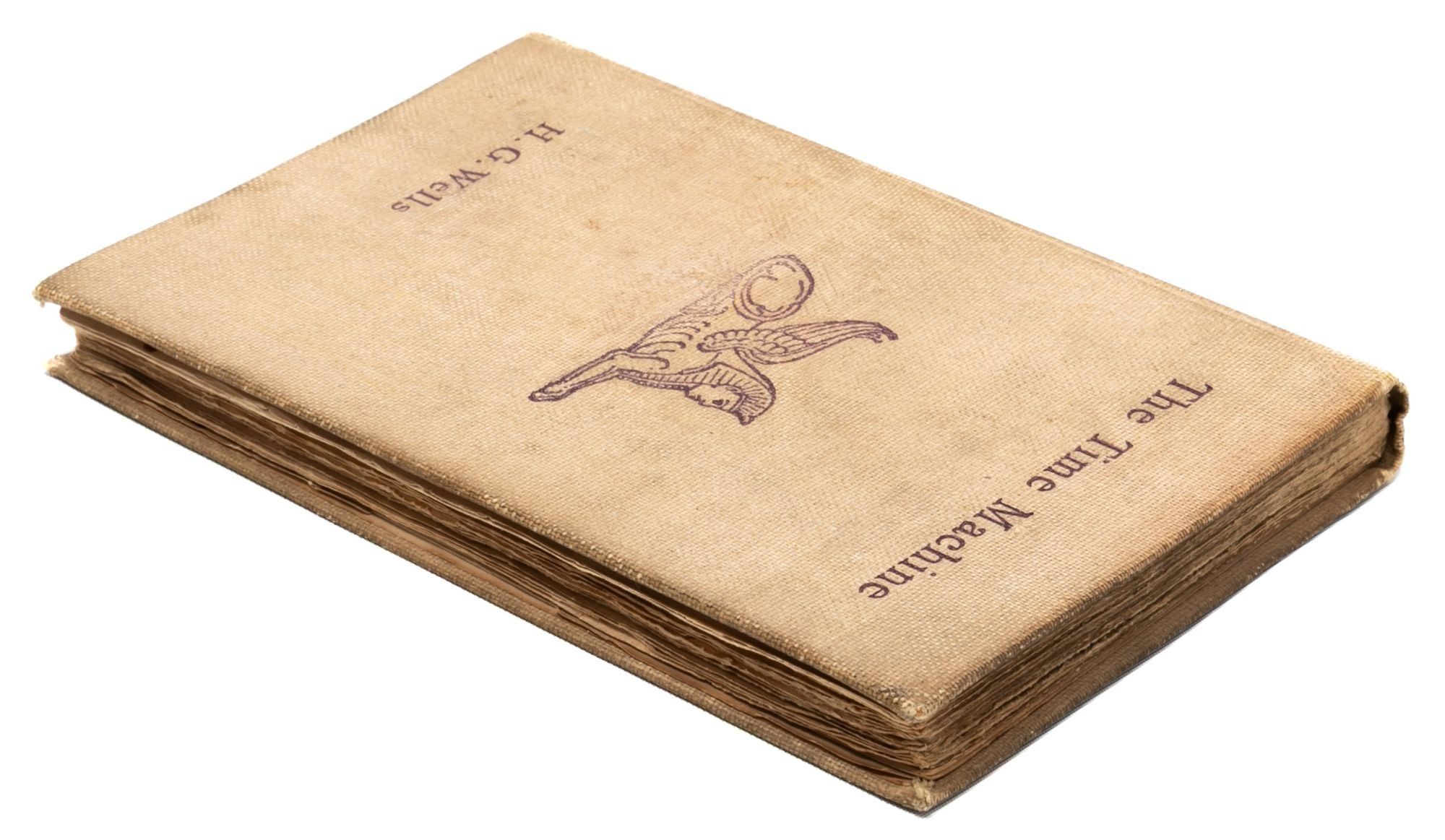 London: William Heinemann, 1895. First U.K. edition. Very Good +. First issue, with the 16 pp. catalogue in the rear starting with "The Manxman." Publisher's tan buckram stamped in purple, a bit faded. Top edge and fore-edge untrimmed, bottom edge rough trimmed. Early twentieth century bookplates to upper endpapers. Offsetting to flyleaves but otherwise clean throughout. Partially unopened. Edges untrimmed. A Very Good+ copy of H.G. Wells' iconic and influential time travel novel.