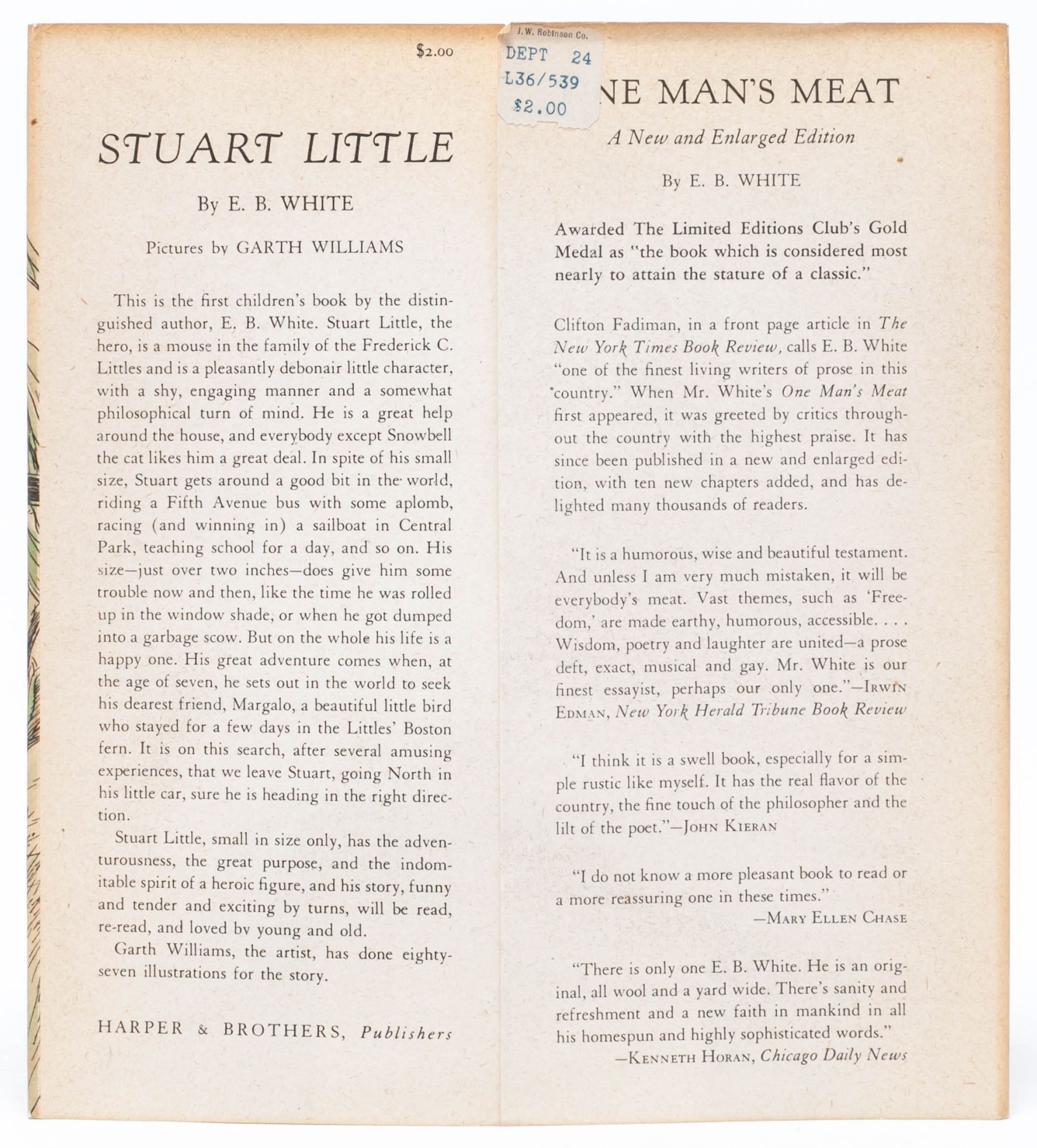 The first children's book by ecological writer E. B. White, it was praised at its release by Malcolm Cowley of The New York Times as "one of the best children's books published this year." Since then, it has become a classic, and it has inspired both film and television adaptations. The story of a talking mouse named Stuart who is born to the Little family, of New York City. From the start, Stuart stands out as different—just over two inches tall, he still thinks and behaves like a seven year old boy, and his parents begin feeling concern about where he will fit in the world. A story of bravery, embracing uniqueness, and developing friendships through kindness and acceptance, Stuart Little is a cornerstone children's book.