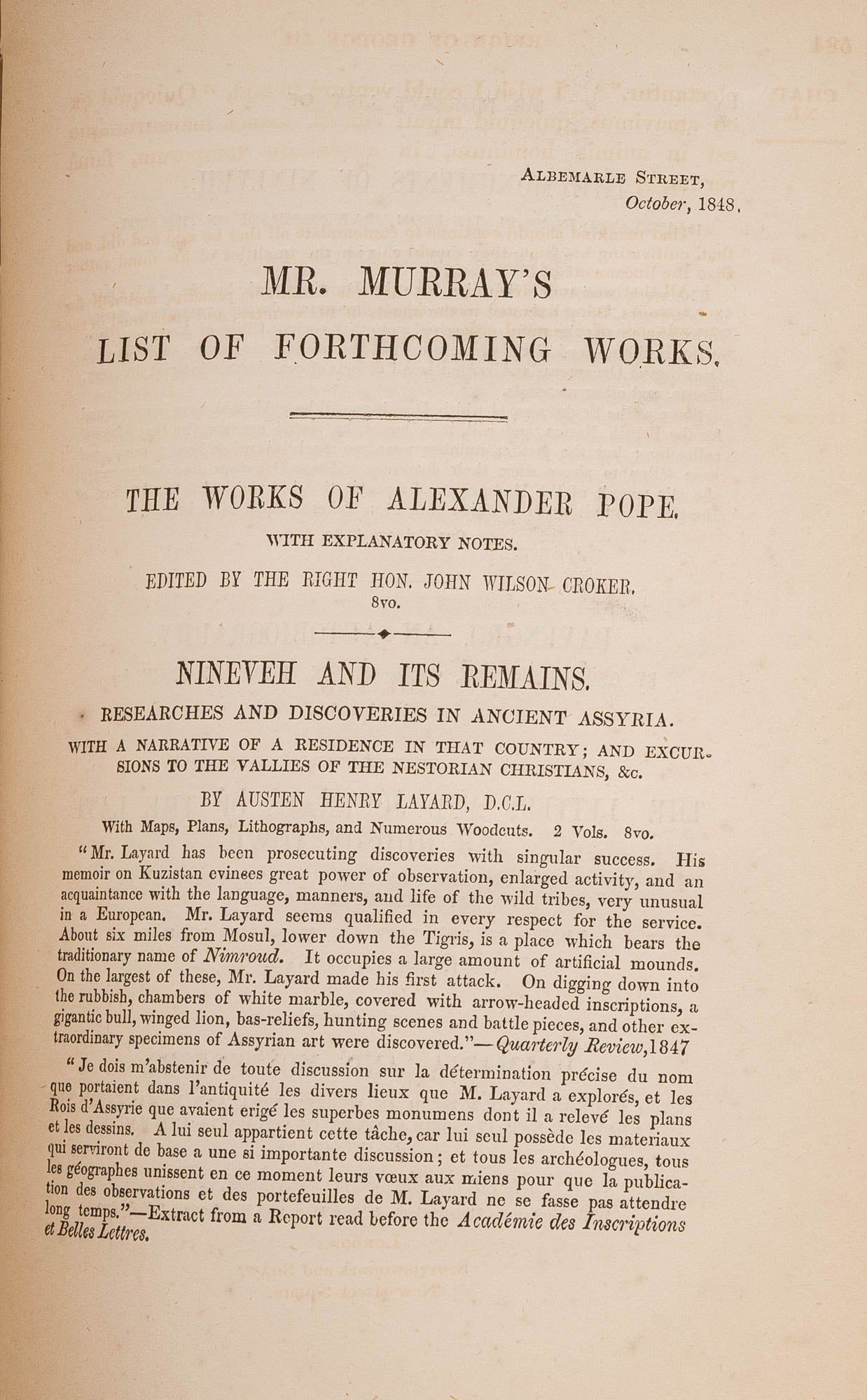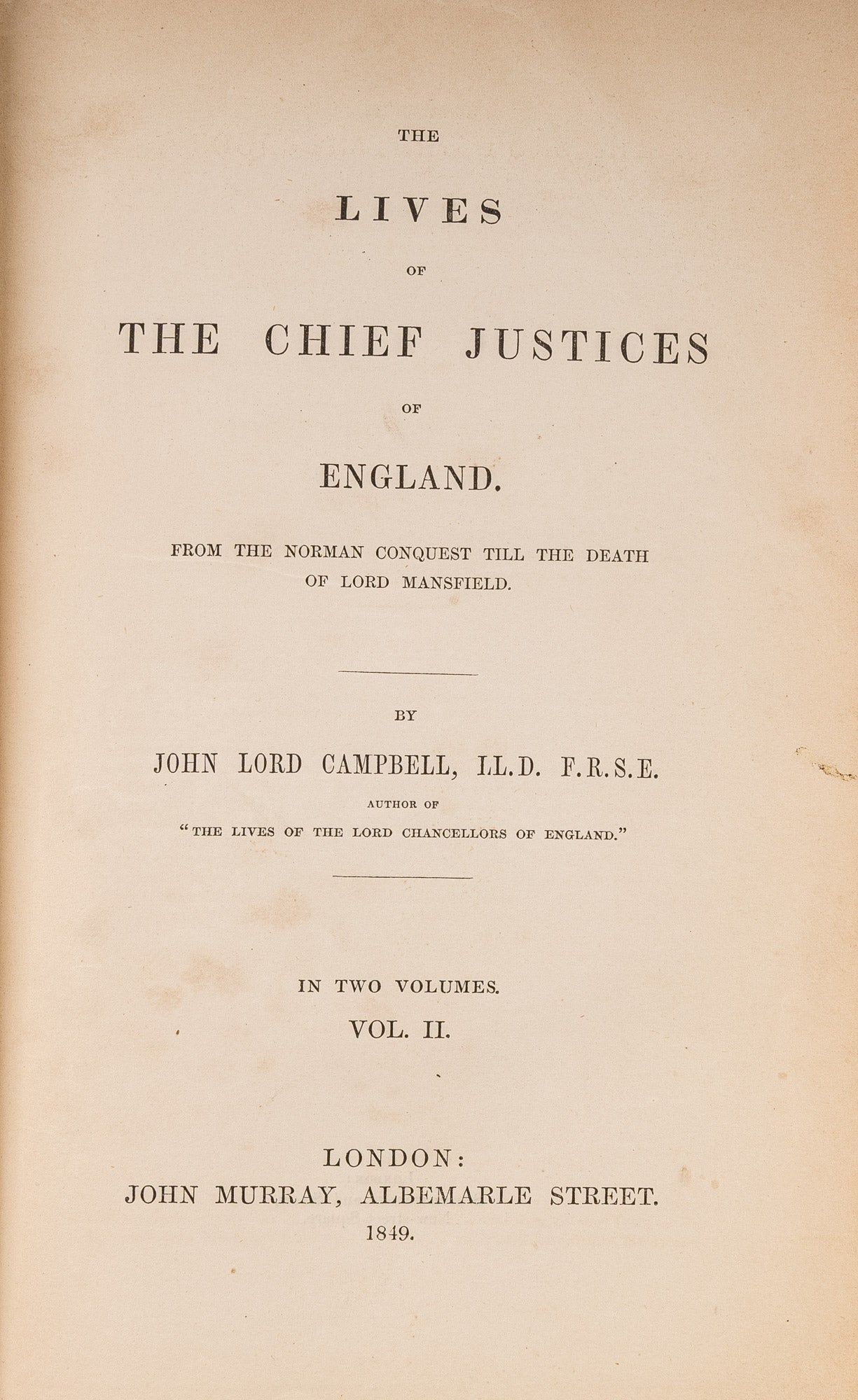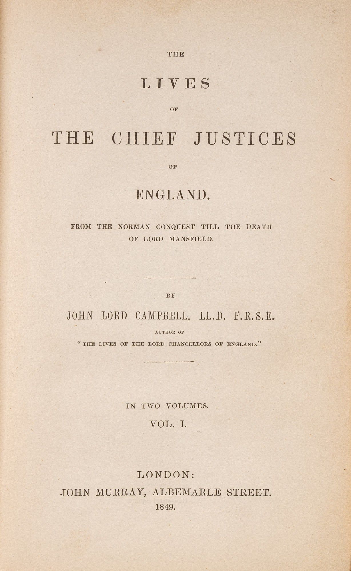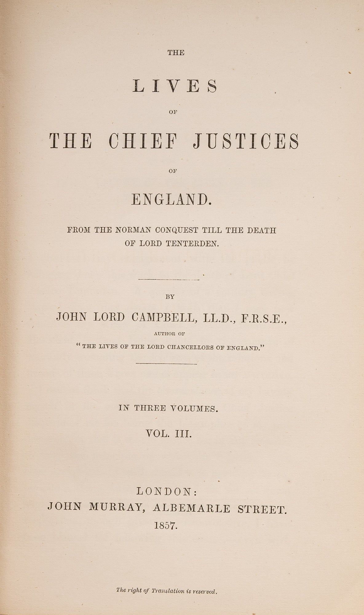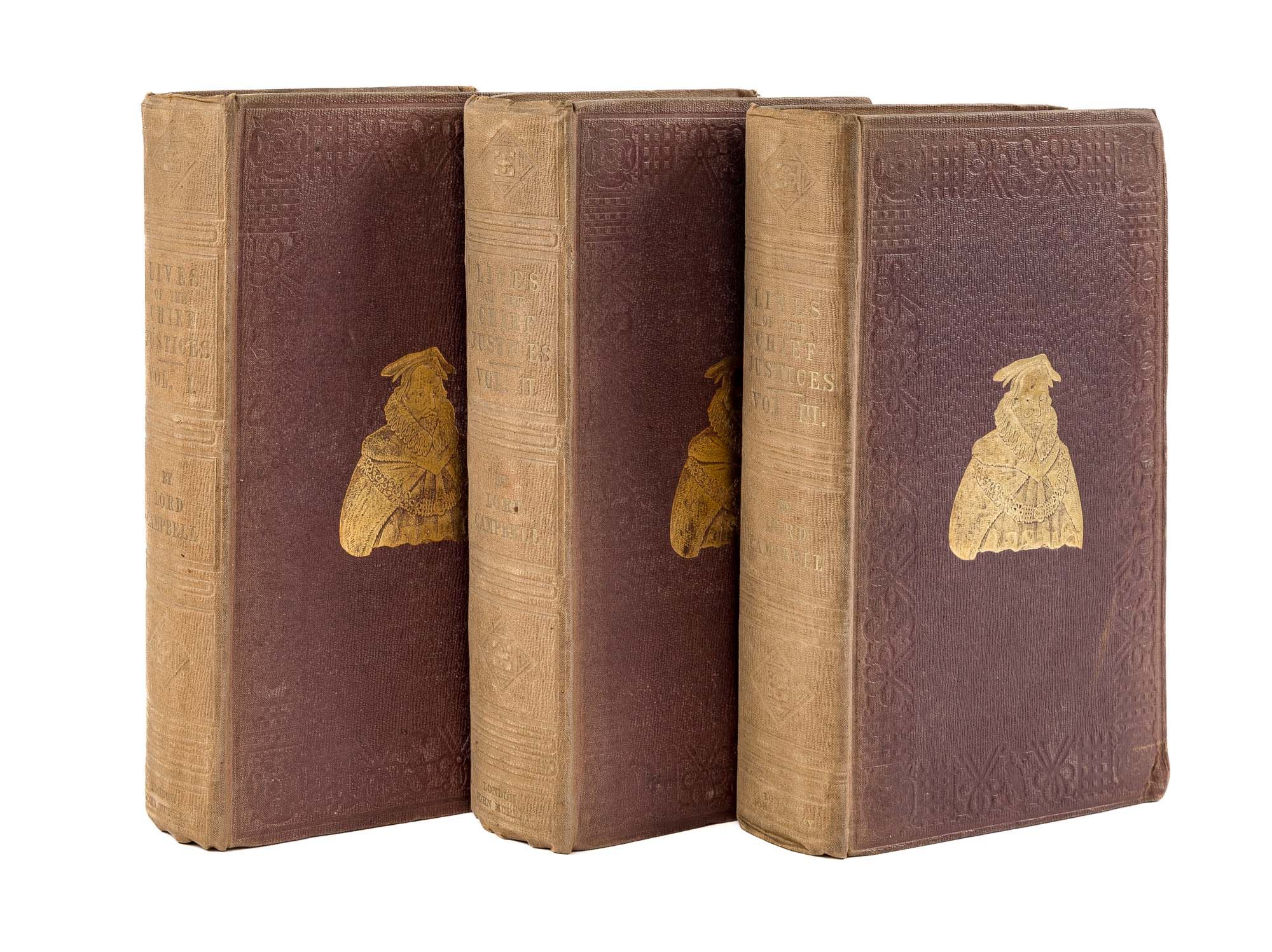 1857. London: John Murray, 1849-1857.. London: John Murray, 1849-1857. Campbell, John, Lord [1779-1861]. The Lives of the Chief Justices of England. From the Norman Conquest Till the Death of Lord Mansfield. London: John Murray, 1849-1857. First edition. 3 volumes. xix, 588; xii, 584; xiv, 413 pp. Octavo (8-1/2" x 5-1/2"). Original maroon cloth with gilt stamped front covers and blind frames to boards. Deckle fore-edges. Moderately worn and soiled with fading to boards. Corners lightly bumped. Light rubbing to extremities, faint offsetting to front free endpapers. Light toning to interiors, light foxing in a few places. Publisher's catalogue to endpapers of volumes one and three, and end of volume two [1-16 pp]. Internally clean. A good set. $150. * Thorough biographies with marginal notes and footnotes "trace the history of those who had illustrated the department of English jurisprudence" (from the Preface). "[These volumes] form the greatest existing storehouse, however the contents have been acquired, of legal anecdote and biography. If his jocosity is not always seasonable, or in taste, it seldom fails to amuse.": Marke, A Catalogue of the Law Collection at New York University (1953) 151.