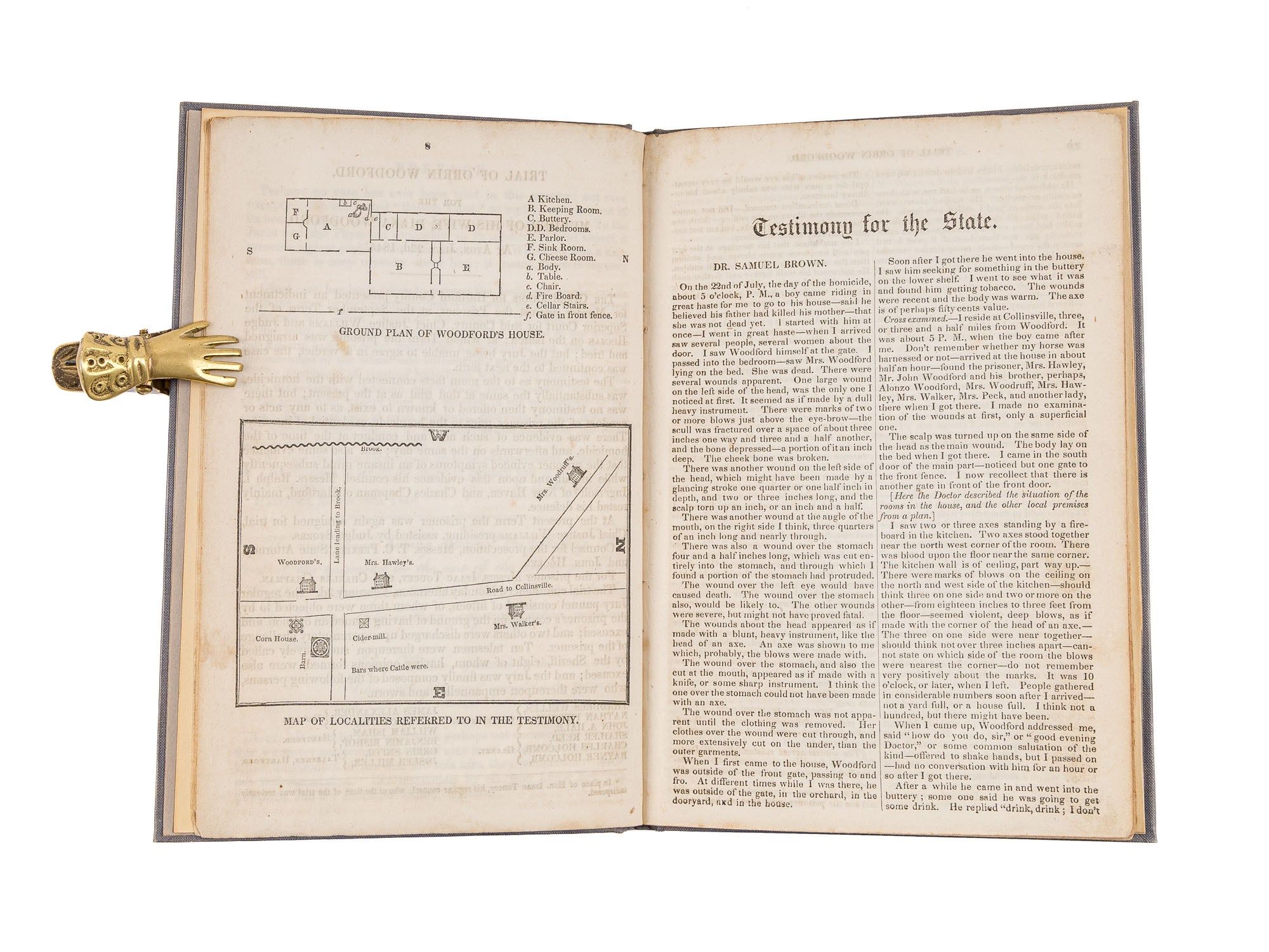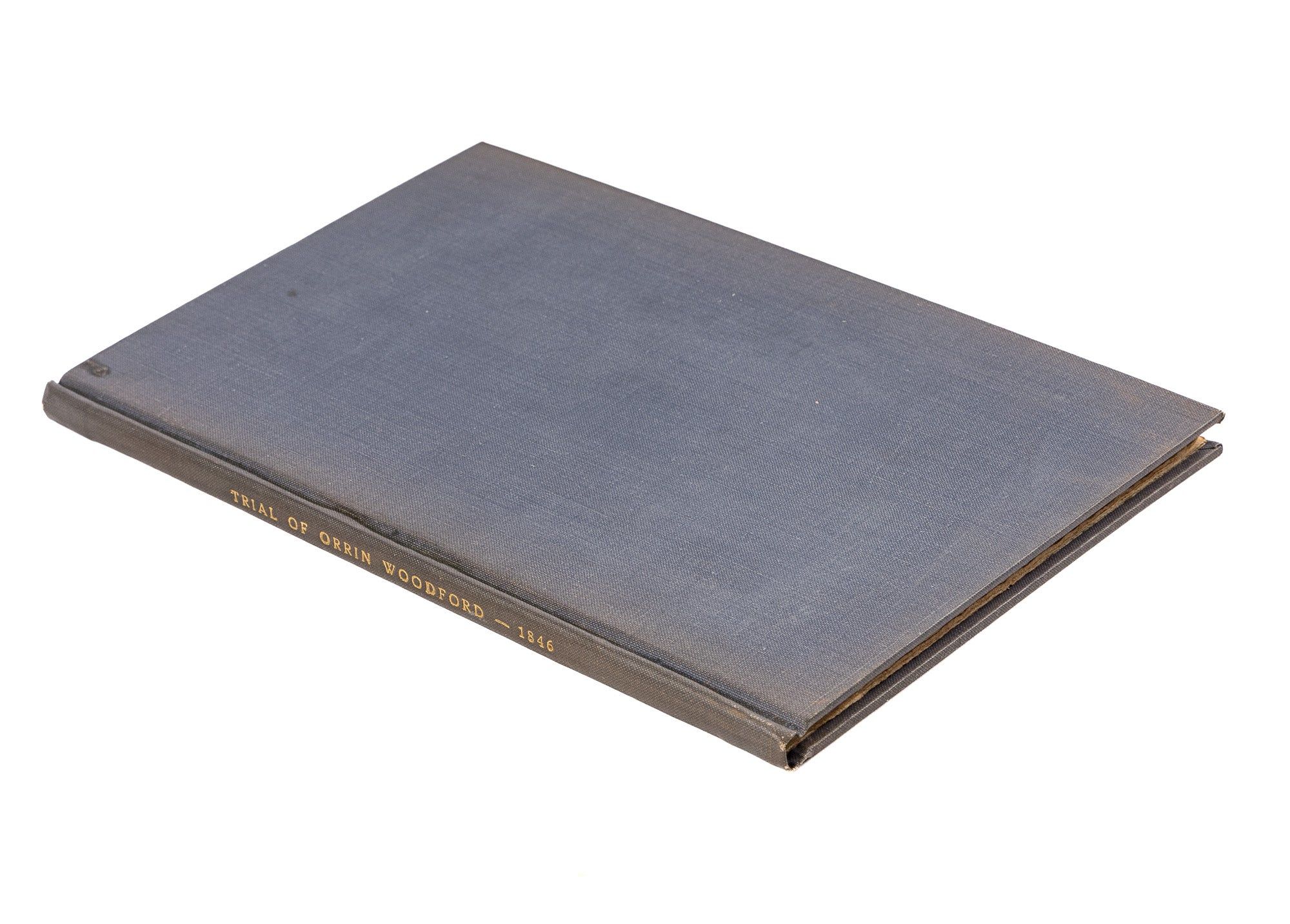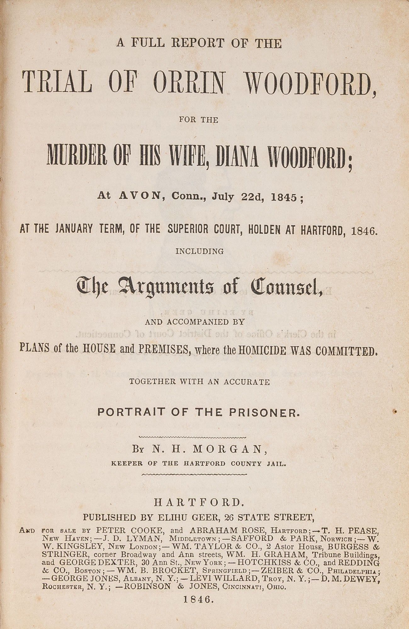 1846. Hartford: Published by Elihu Geer, 1846. Hartford: Published by Elihu Geer, 1846. Marital Homicide and Insanity: McDade 1115 [Trial]. Woodford, Orrin, Defendant. Morgan, N[athaniel] H[arris] [1805-1881], Reporter. A Full Report of the Trial of Orrin Woodford for the Murder of His Wife, Diana Woodford; At Avon, Conn., July 22d, 1845; At the January Term, Of the Superior Court, Holden at Hartford, 1846. Including the Arguments of Counsel, And Accompanied by Plans of the House and Premises, Where the Homicide was Committed. Together with an Accurate Portrait of the Prisoner. Hartford: Published by Elihu Geer, 1846. 69 pp. Two woodcut illustrations. Main text in parallel columns. Octavo (8-1/2" x 5-3/4"; 21.5 x 14.5 cm). Stab-stitched pamphlet bound into later cloth, gilt title to spine. Light rubbing to extremities, light fading to edges of boards. Light toning to interior, moderate soiling and light edgewear to endleaves, light foxing to a few leaves. A very good copy of a scarce title. $500. * Only edition. Judged to be insane, Woodford was convicted of manslaughter and sentenced to a term of ten years for stabbing and beating his wife to death. Morgan was the keeper of the Hartford County Jail. This is a scarce title. OCLC locates 11 copies in law libraries. McDade, The Annals of Murder 1115.