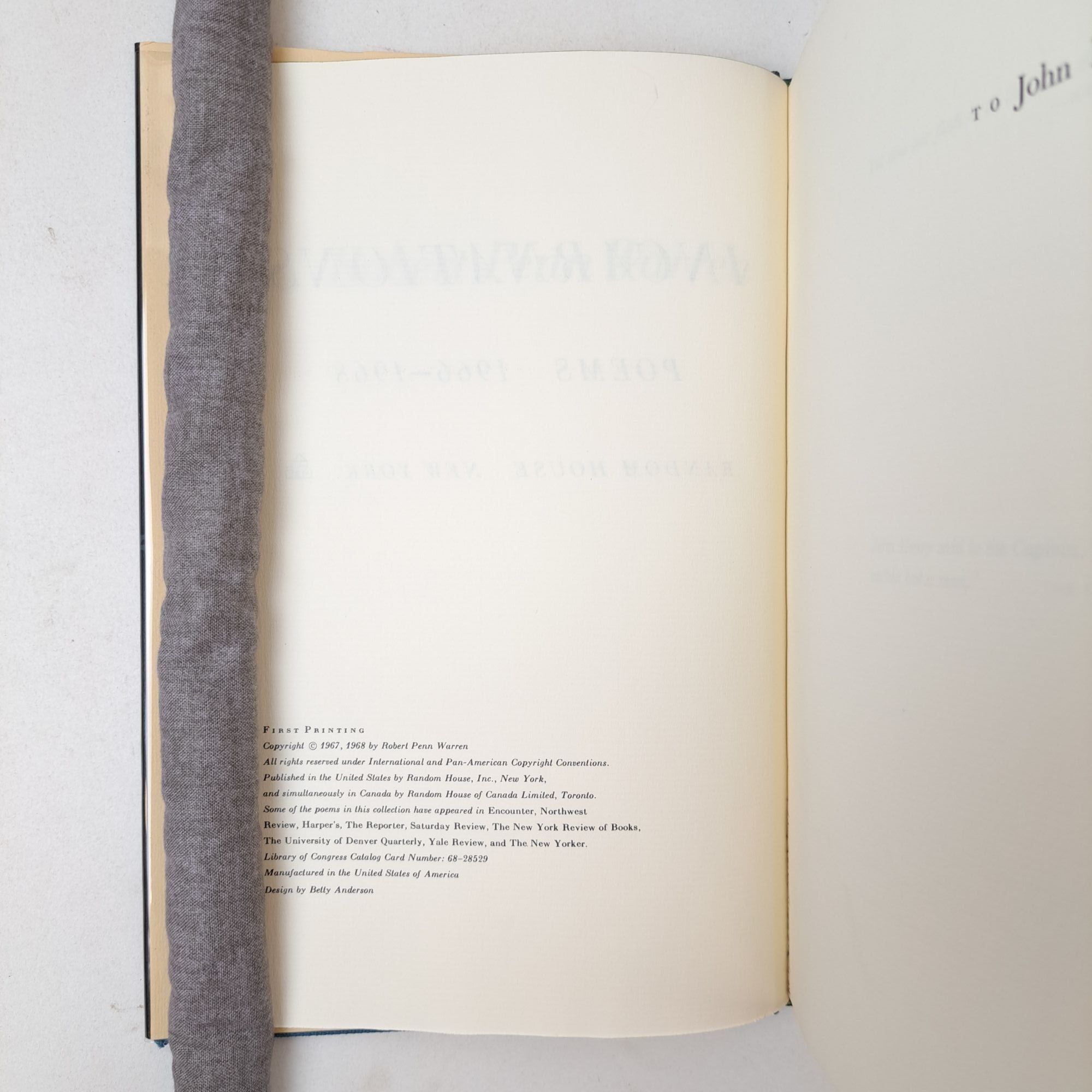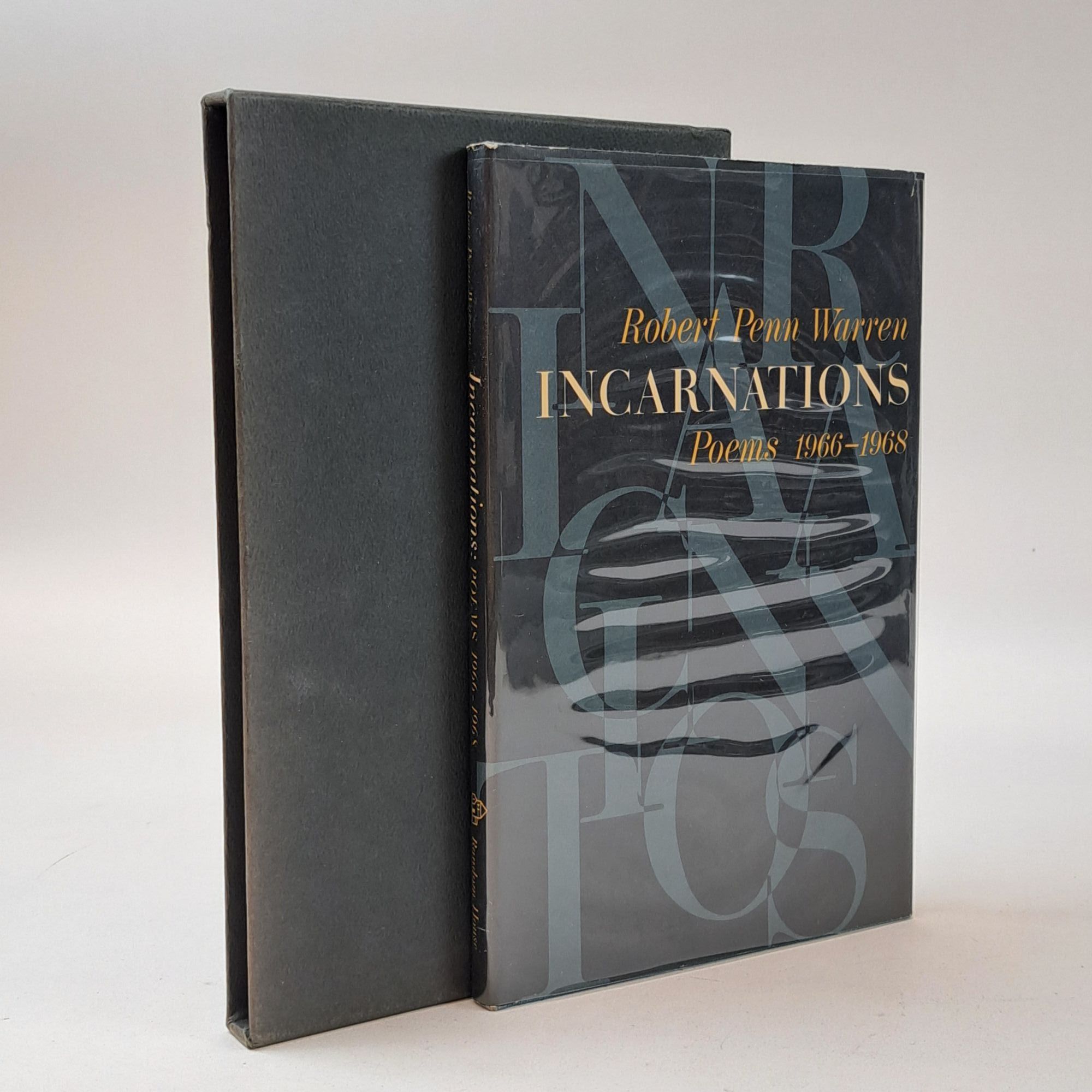 New York, New York: Random House, 1968. Limited Edition #153/250. Hardcover. Octavo, 64 pages. In Very Good condition with Very Good condition dust jacket and Very Good condition slipcase. Spine is black with white and light yellow lettering. Slipcase is black with light general sun-fading, scuffing, smudging, and mild shelving wear along extremities including a small chip and ~4in. along closed edge. Dust jacket protected by mylar covering, has light shelving wear along spine head, to head fore corners, and a small closed tear along front head edge. Textblock fully bound in publisher's blue cloth with blind stamping to the front cover, has mild shelving wear and sun-fading along spine head and tail. Textblock has slight waviness, head edge dyed olive green and has mild fading. Signed flat by Robert Penn Warren on publisher's limitation page. Shelved Room C. 1401187. Special Collections.