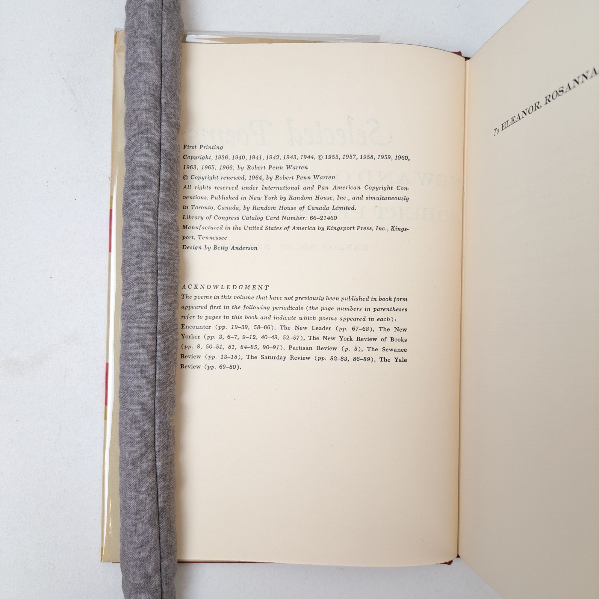 New York, New York: Random House, 1966. First Edition, First Printing. Hardcover. Octavo, 300 pages. In Very Good condition with Very Good minus condition dust jacket. Spine is tan with black lettering. Dust jacket protected by mylar covering, price uncut: "$7.95" on front flap, has mild shelving wear along extremities, chipping to fore corners, light general soiling, and moderate age-toning along spine. Boards fully bound in publisher's red cloth, has mild shelving wear along spine head and tail. Textblock edges have mild age toning, head edge dyed black and has mild sun-fading. Inscribed on title page by Robert Penn Warren. Shelved Room C. 1401197. Special Collections.