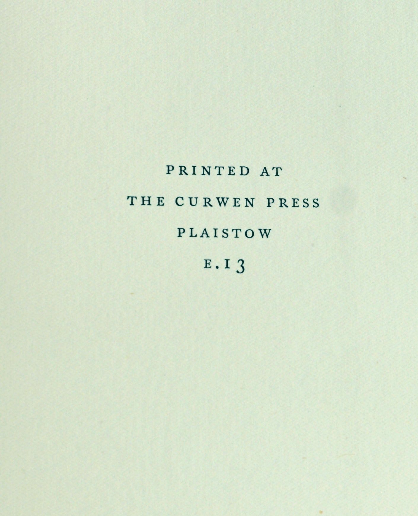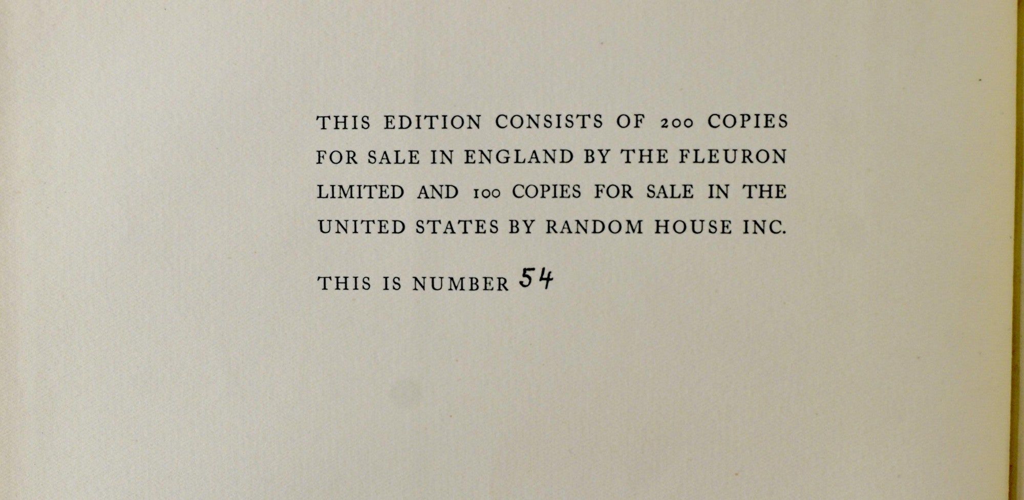 London: The Fleuron Limited, 1930. First Edition. Hard Cover. Good+ binding/Very Good dust jacket. Small quarto; in the publisher’s green cloth binding, with dustjacket; 80 pages ,with facsimiles and portraits; the binding has minor damping to the edges, especially the bottom edge; there are no marks or dampstaining in the book; the cream colored dustjacket is soiled.~~This is one of 200 copies for sale in England by the Fleuron Limited and 100 copies for sale in the United States by Random House”. Good+ binding / Very Good dust jacket.