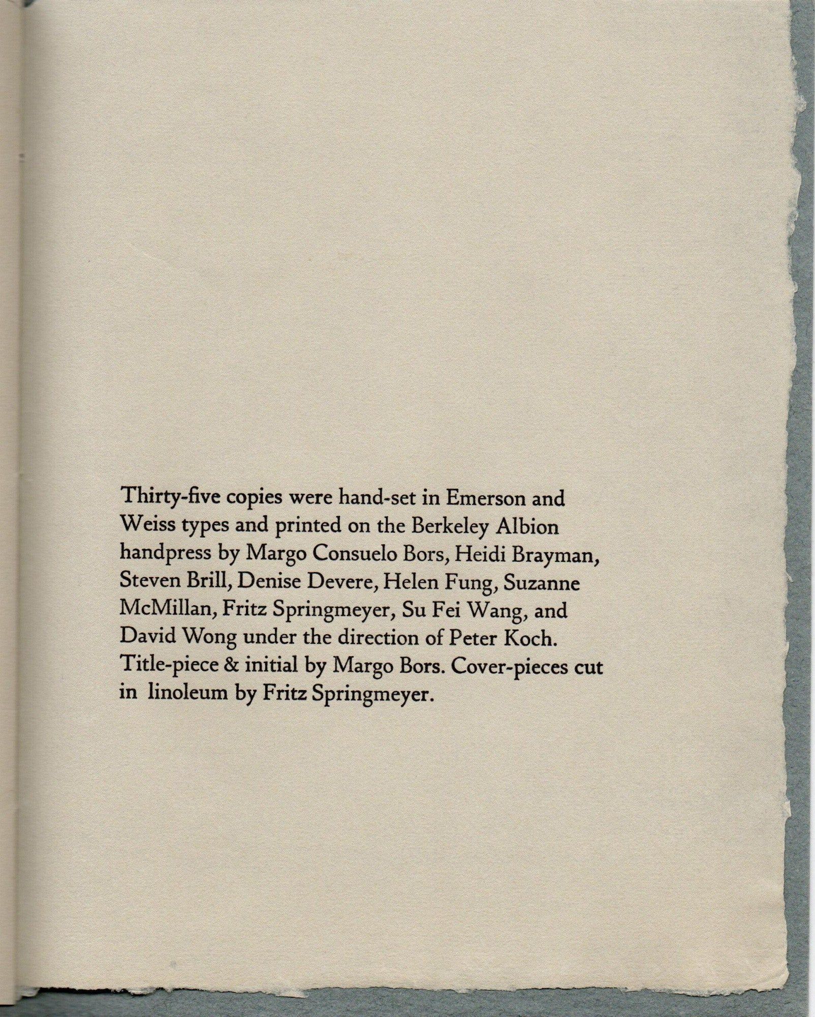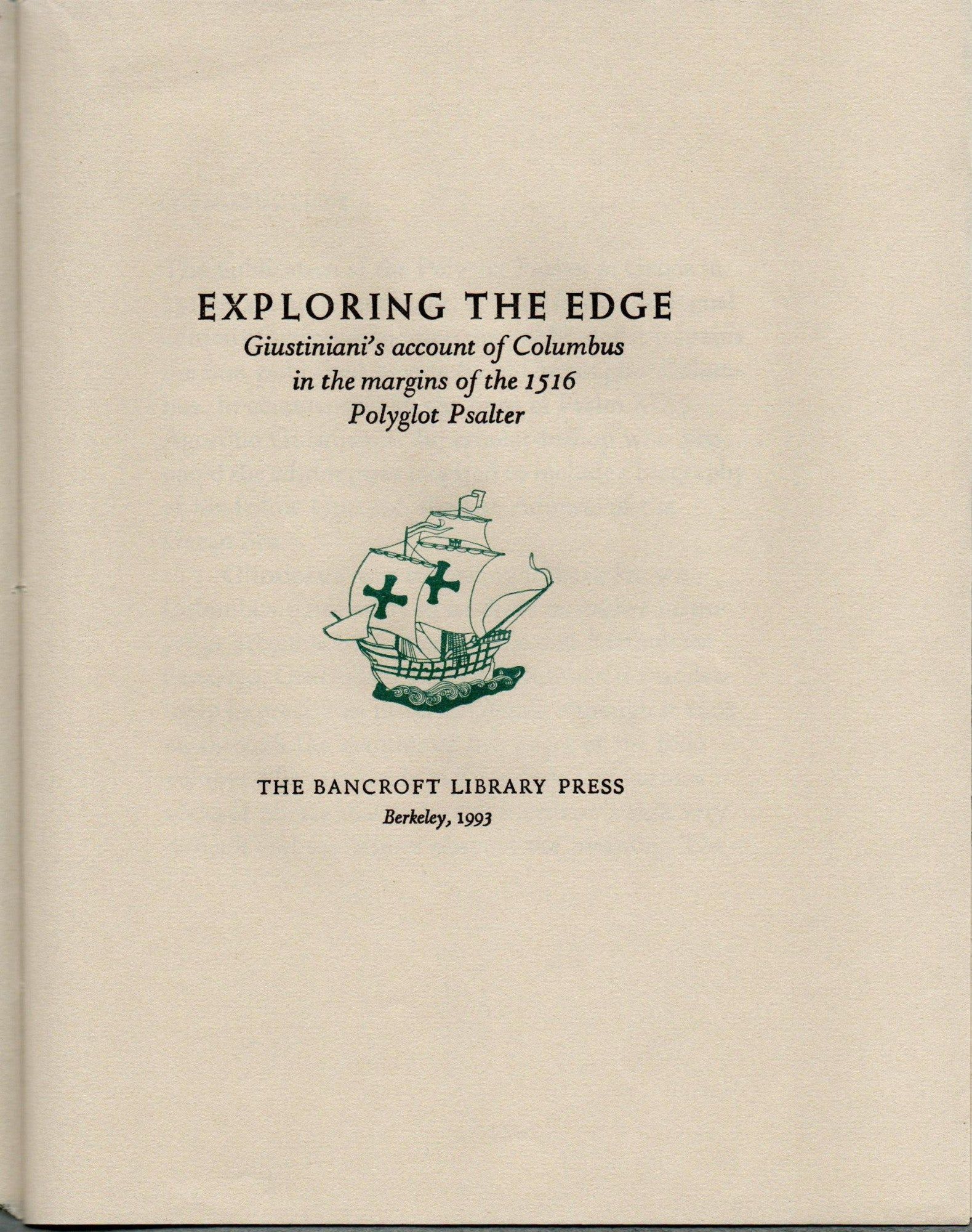 Berkeley, CA: The Bankcroft Library Press, 1993. Limited Edition. Soft Cover. Very Good+ binding. Margo Consuelo Bors & Fritz Springmeyer. No markings in text. Grey paper binding tied at spine. Pages un-cut at top. The first published biography of Christopher Columbus was printed in the margins of the 1516 Polyglot Psalter as commentary to Psalms XIX. Giustiniani drew largely on Antonio Gallo’s and Bartholmeo Senarega’s manuscripts and he is, according to Anthony S. Bliss in his introduction, “maddeningly imprecise on historical detail....” and “tends to hyperbole and curious turns of phrase.” This translation by Sonoma bookseller, Gilman D. Parsons and Shawn E. Coyle of The Bancroft Library is only the second English translation; the other being, Henry Harrisse’s Notes on Columbus (1866). A curious piece and interesting read. Colophon: “Limited to 35 copies hand-set in Emerson and Weiss types and printed on the Berkeley Albion handpress.... Title-piece & initial by Margo Consuelo Bors. Cover-pieces cut in linoleum by Fritz Springmeyer”. Very Good+ binding.