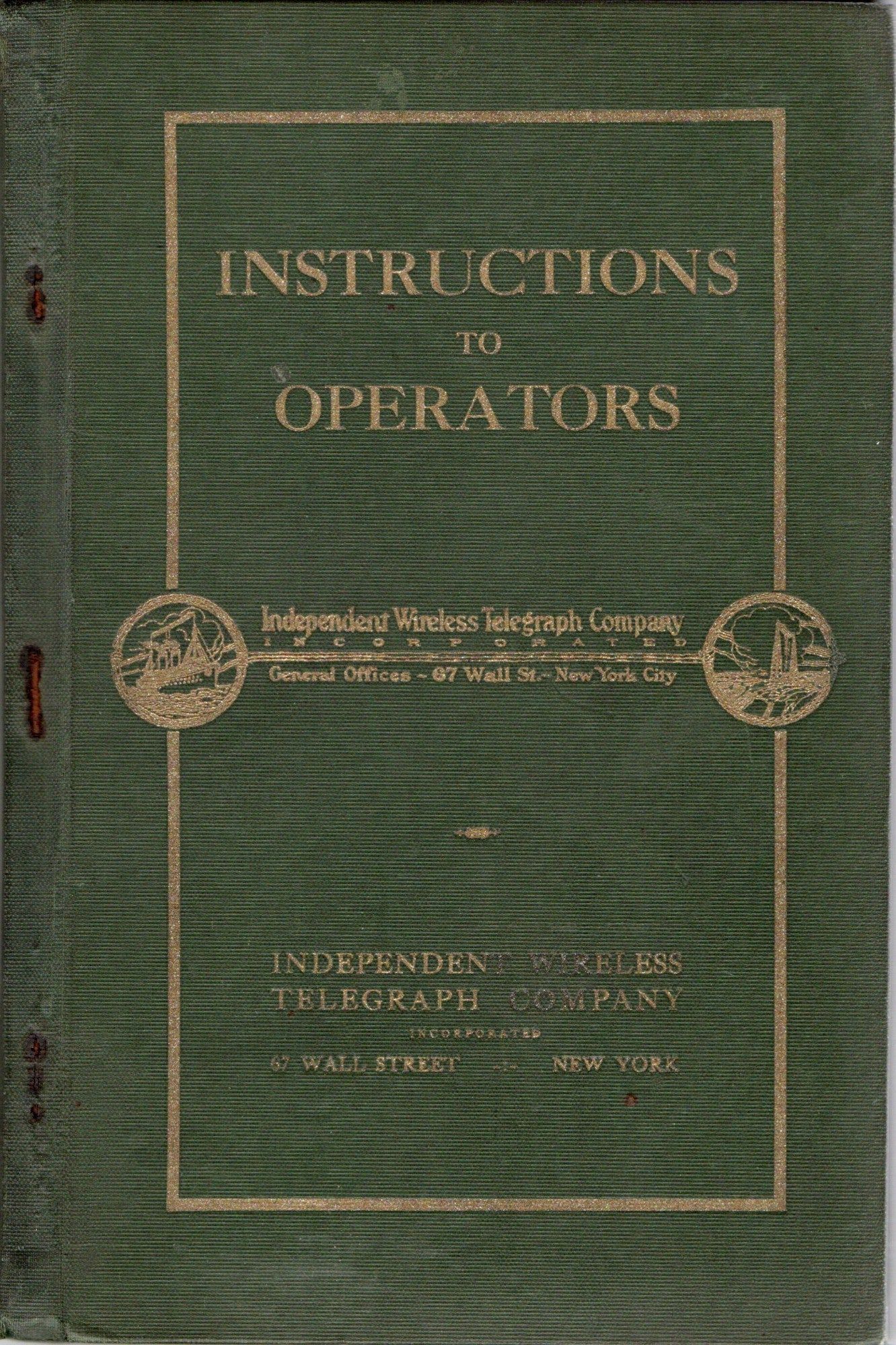 New York: Independent Wireless Telegraph Company, 1930. 8vo; in green cloth binding; with titling stamped in gold; the staples holding the book together have worn through the cloth and are rusted; a bit of the titling has worn away but is still legible.~~A blank log book with instructions for operating the wireless telegraph. With two folding charts. The Independent Wireless Company operated ship-to-shore stations in Babylon, East Hampton and Garden City. The booklet lists agents in many foreign ports. With 50 or so pages of instructions, and a number of blank leaves for operators to log in.