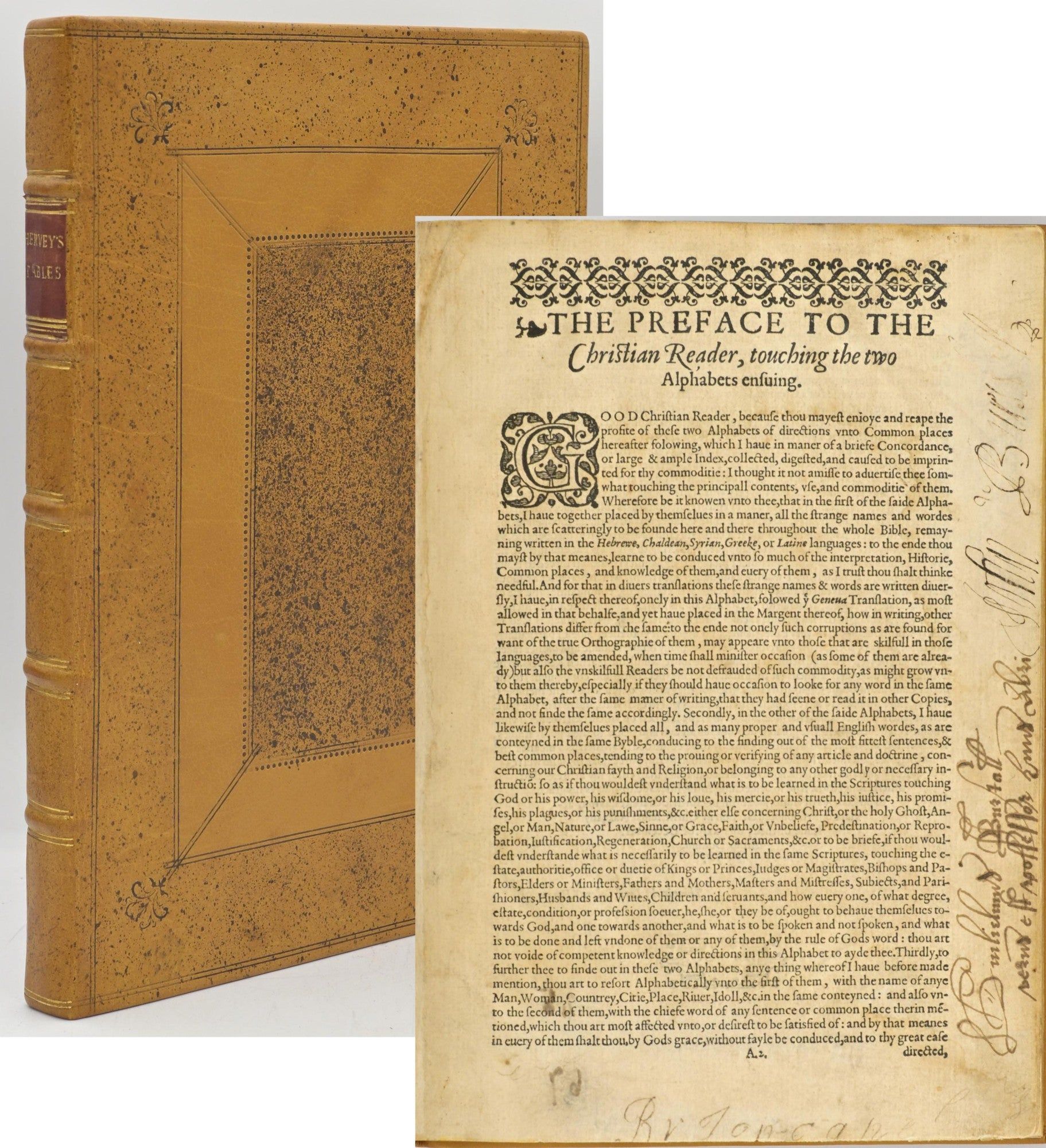 London: Christopher Barker, nd. (1599). Full Leather. Near Fine binding. 8vo; rebound in a most handsome period binding; unpaginated; with some writing on the first leaf. ~~According to a loose leaf laid in the book, there is no title page because these were printed to be put in the Geneva translation of the Bible as a concordance. There are several editions. This was printed by Christopher Barker [Printer to her majesty the Queen], and not one of his deputies. Therefore would have had to be printed by or before 1599 when Barker died. All editions until 1615 have the date 1578 on the second leaf, as this copy does. ; title label says "Hervey's Tables" rather than "Herrey's Tables" Near Fine binding.