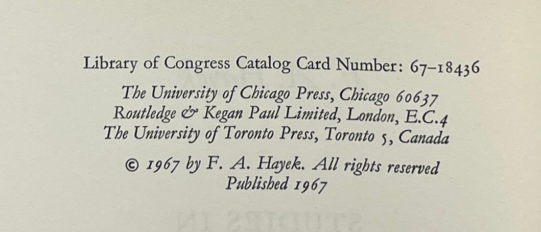 Chicago: University of Chicago Press, 1967. First Edition. Hardcover. Near Fine/Very Good. Near Fine in a Very Good jacket, unclipped ($6.50), bumped at the edges, a long closed tear at the top edge of the front panel, soiled at the back panel. Brown cloth with bronze gilt lettering on the spine. Square and firmly bound, lightly foxed at the edges, clean internally. A collection of Hayek's essays from the previous twenty years, many previously unpublished or significantly revised from previous appearances.