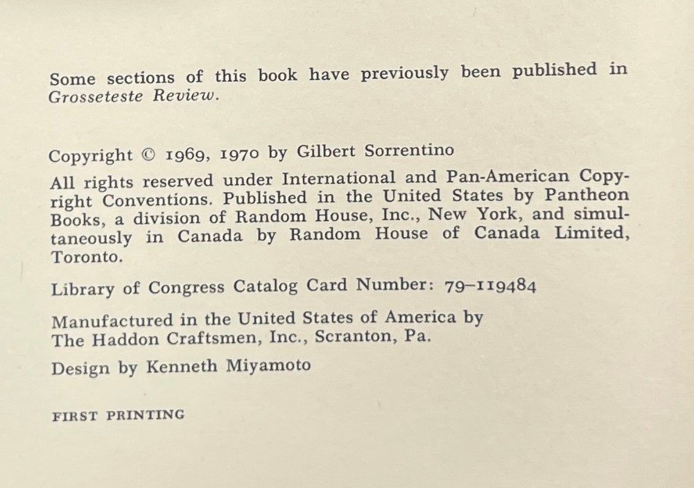 New York: Pantheon Books, 1970. First Edition. Hardcover. Near Fine/Near Fine. Near Fine in a Near Fine jacket, unclipped ($5.95), faded a shade at the spine. Blue cloth with gilt lettering on the spine, black ink lettering on the front board. Square and firmly bound, a few spots at the edges, clean internally. Sorrentino's novel about Brooklyn life between 1935 and 1951, telling of "the collapse of a basically decent, homogeneous and honorable group of people into a greedy, ignorant, and slipshod conglomeration, corrupted by money made available by the war economy.